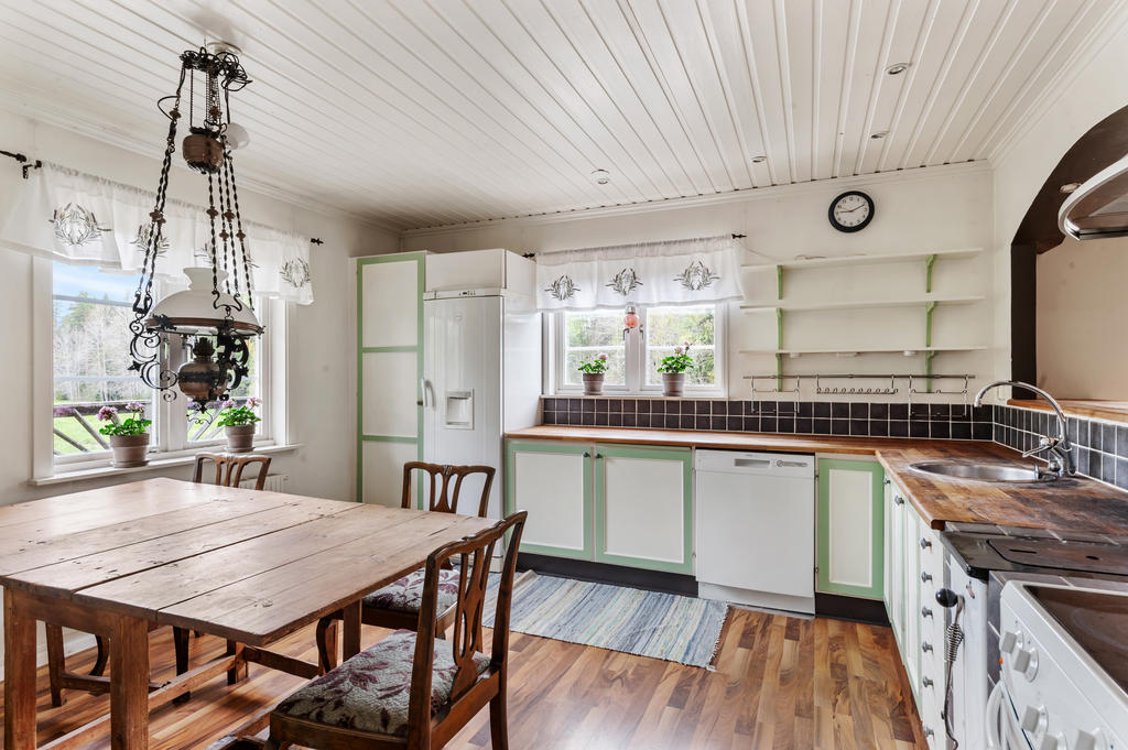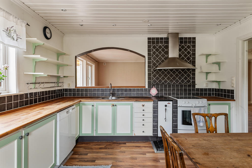 Bostadshuset från 80-talet har bra kök som delvis är öppet mot vardagsrummet. Det ligger i anslutning till hallen och är utrustat med kyl, diskmaskin spis med ugn och vedspis.