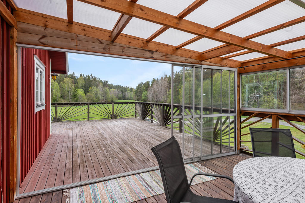 Vidbyggt huset finns detta generösa altandäck som slutar i ett rofyllt uterum som har öppen vy över det vackra landskapet och de egna hästhagarna.