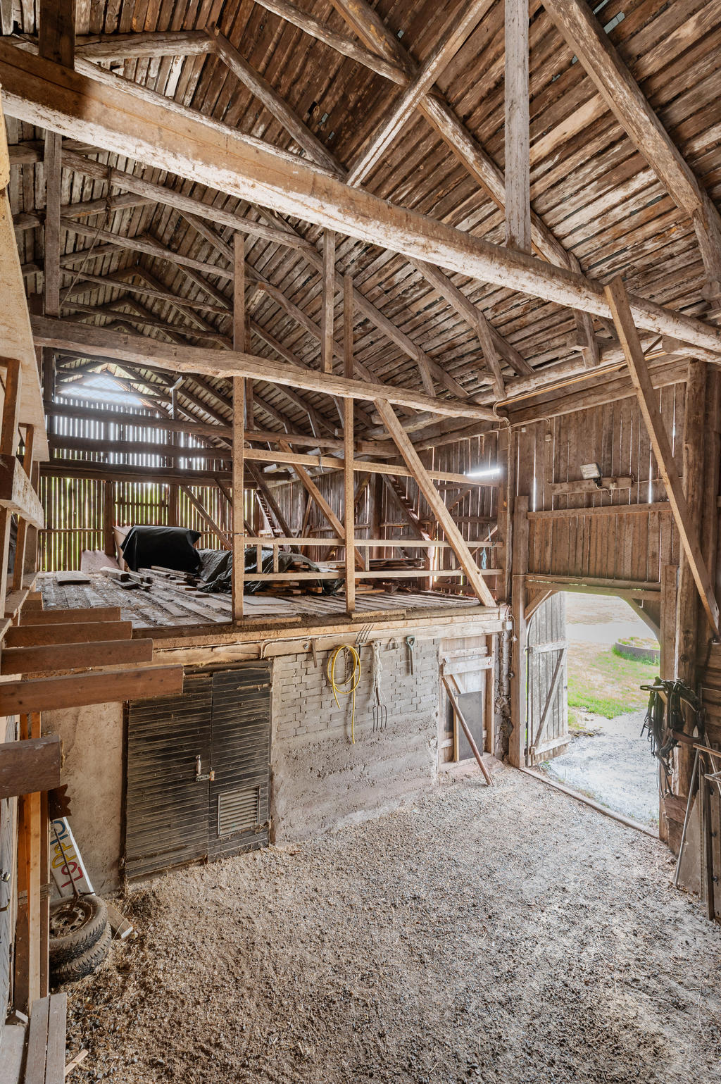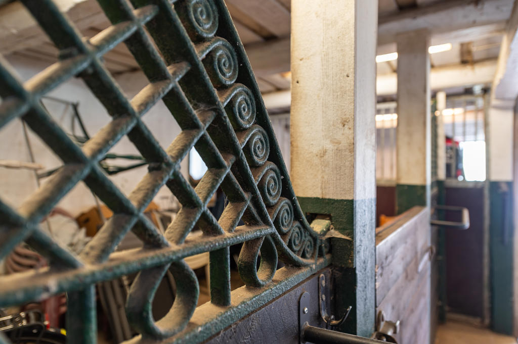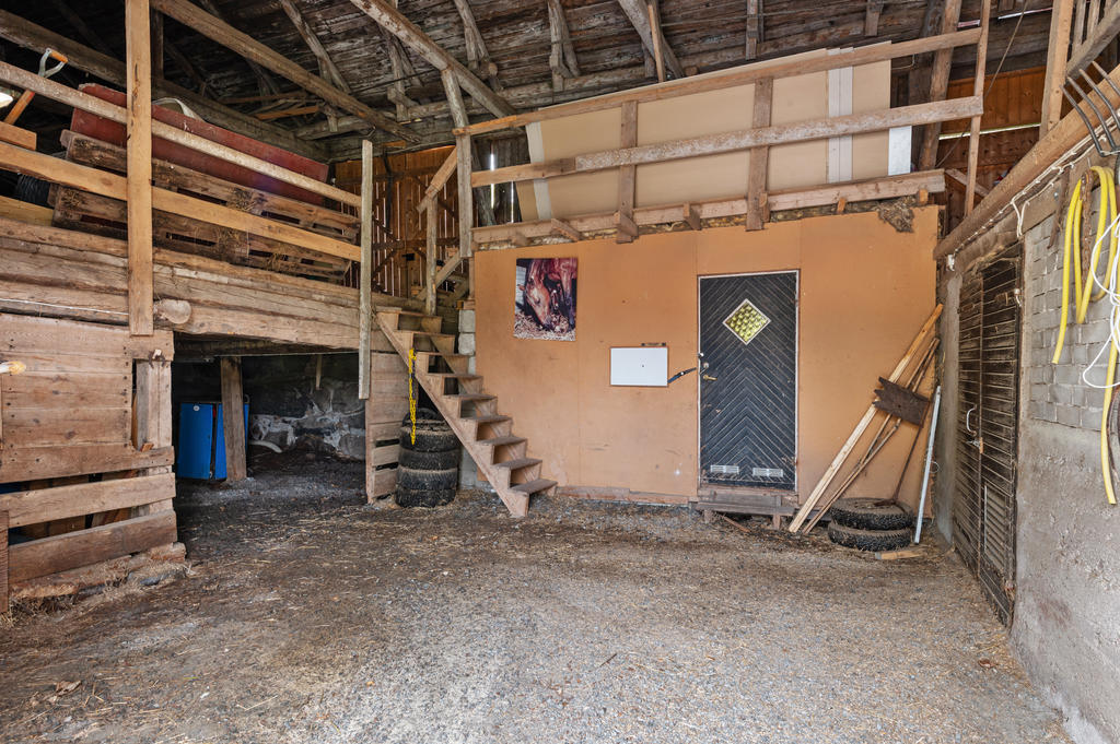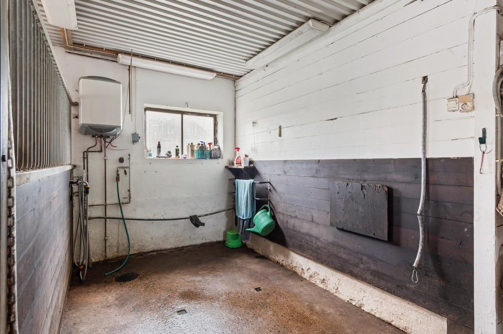 Första delen där har taket höjts för att kunna husera fullstora hästar. Funktionella och välskötta boxar. I dagsläget finns det fem hästboxar, en spolspilta, samt sadelkammare i en och samma byggnad. Här finns både vatten och el indraget. Det finns ytterligare sju boxar i den andra delen av ladugården där mindre hästar, får eller annan djurhållning kan vara. I mittdelen finns förvaring och det gamla mjölkrummet. På loftet finn s åt båda håll gott om förvaring och med hötorken kvar. Loftet nås via körbron med nya portar från baksidan av ladugården.