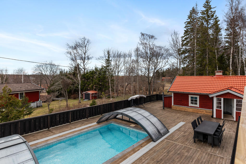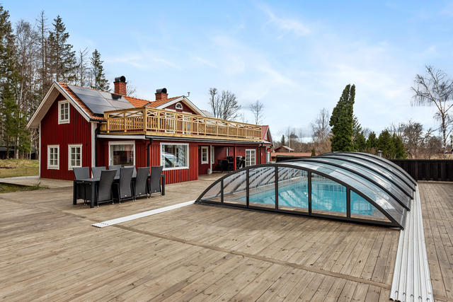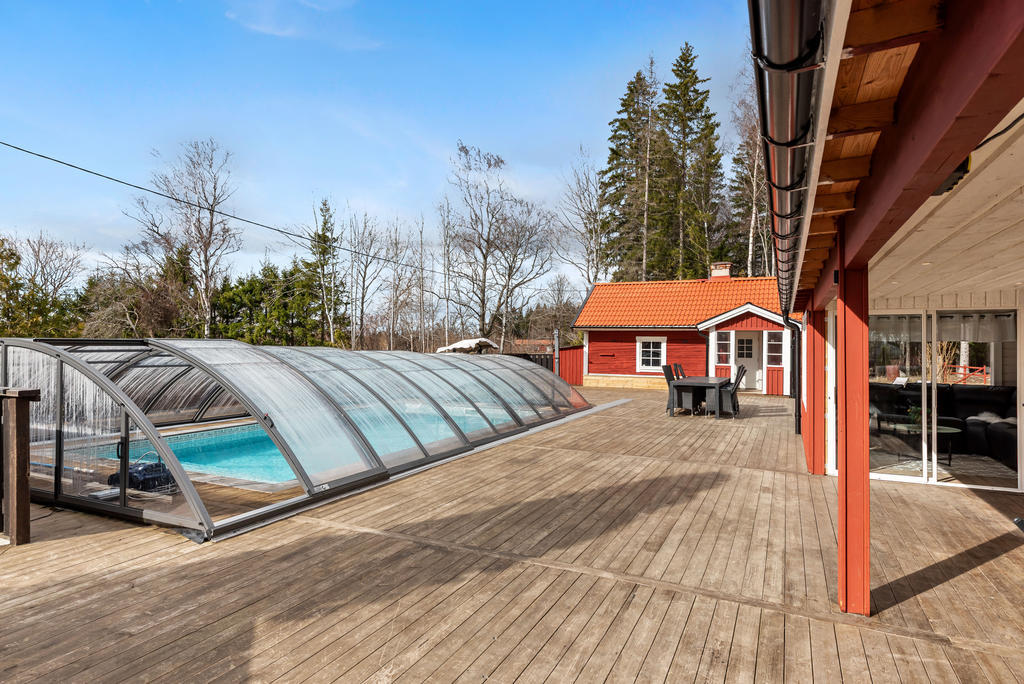 I altandäcket finner du en imponerande pool om ca 4x8 meter med glastak, vilket förlänger badsäsongen avsevärt. Intill väntar även en vedeldad badtunna – en självklar plats för avkoppling under stjärnklara kvällar året om.