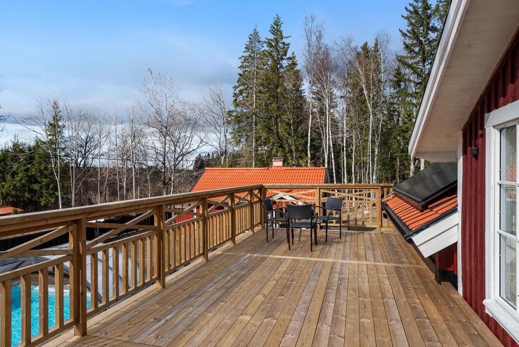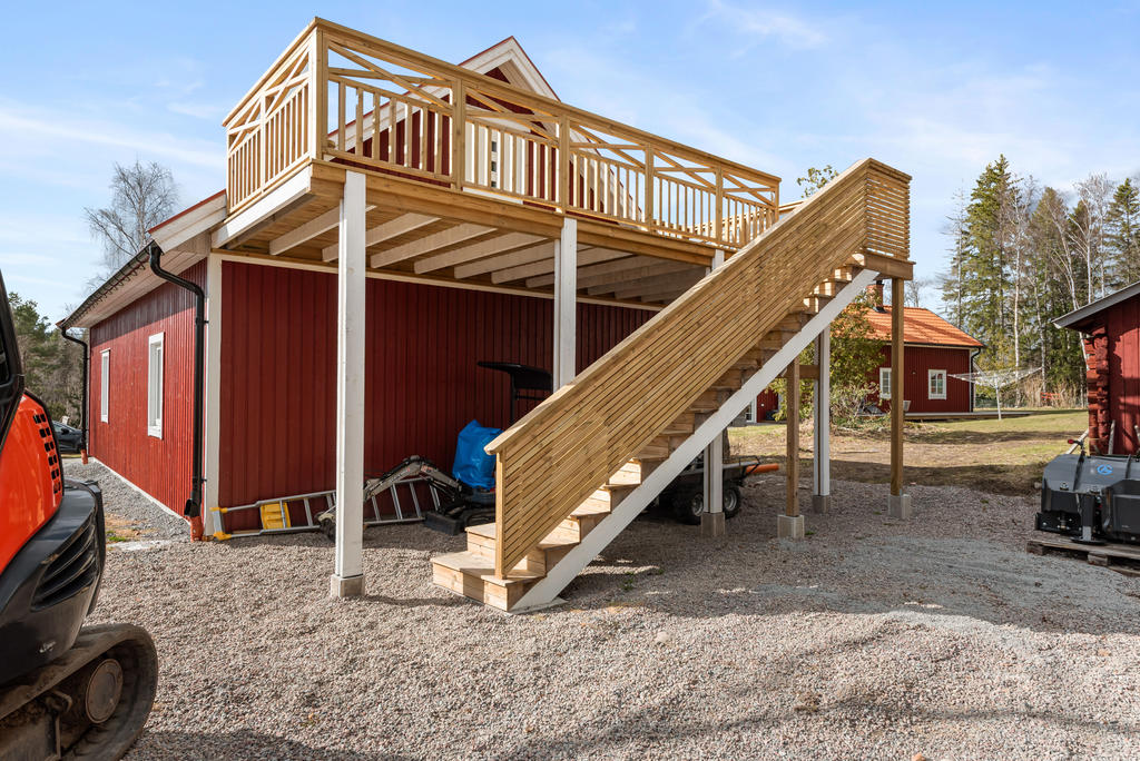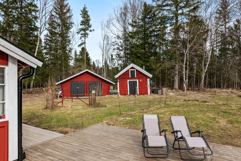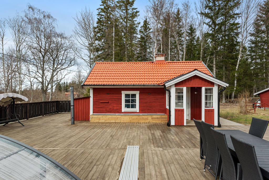 Det stora altandäcket binder samman bostadshuset med en charmig lillstuga som erbjuder ett rymligt rum samt ett eget helkaklat duschrum – perfekt för gäster, uthyrning eller generationsboende. Här skapas en privat och trivsam gårdsmiljö där livet kan njutas fullt ut.