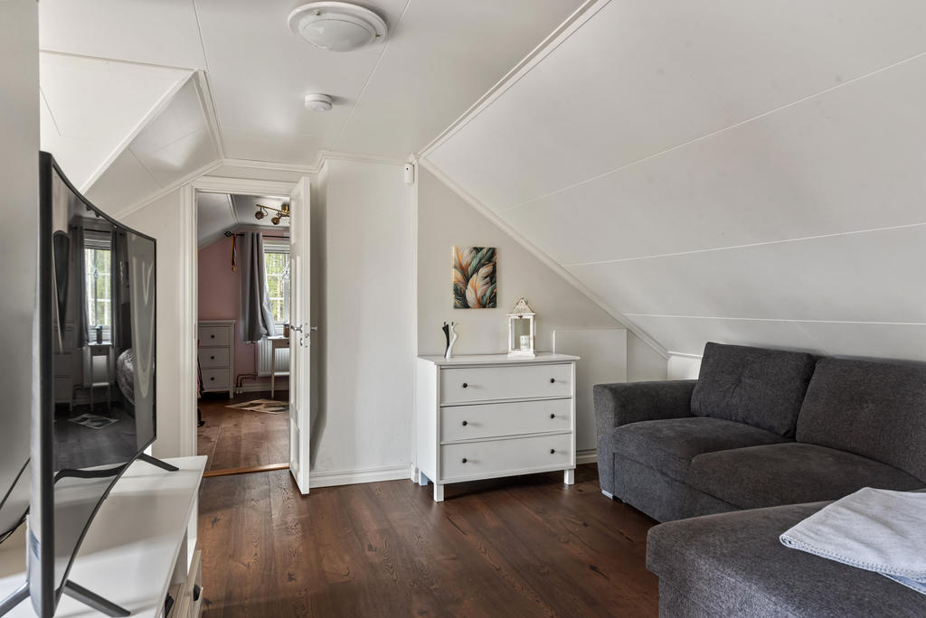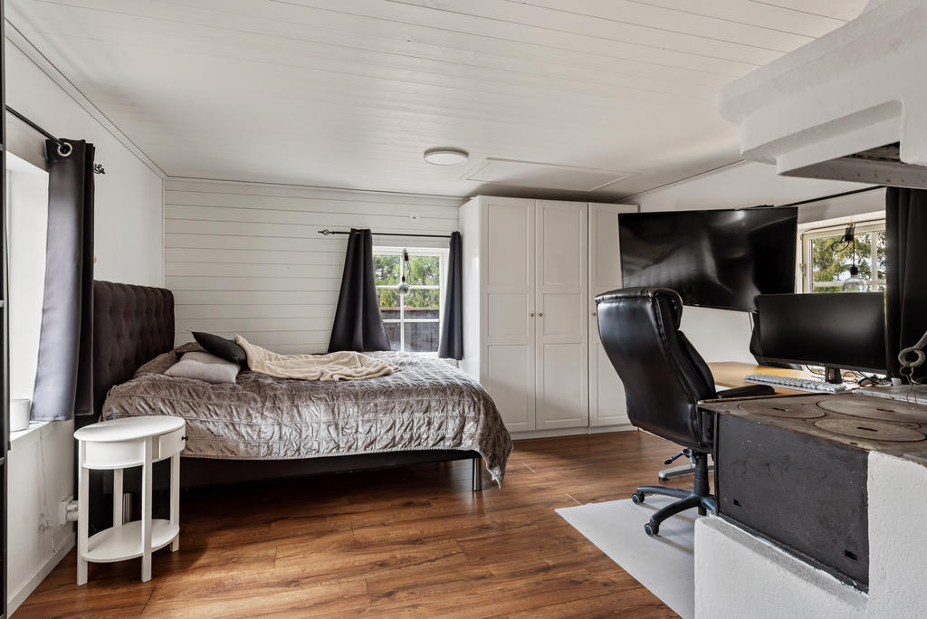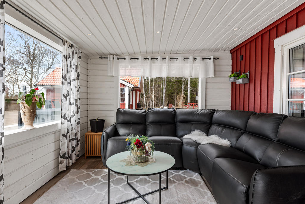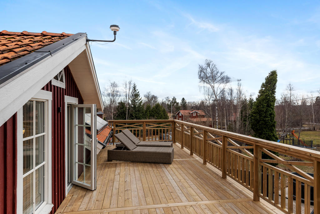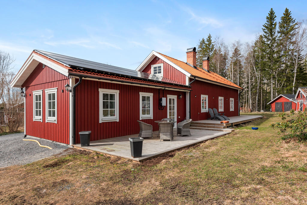 Det stora altandäcket binder samman bostadshuset med en charmig lillstuga som erbjuder ett rymligt rum samt ett eget helkaklat duschrum – perfekt för gäster, uthyrning eller generationsboende. Här skapas en privat och trivsam gårdsmiljö där livet kan njutas fullt ut.