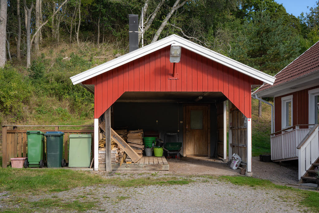 Runt bostaden finns även praktiska byggnader; en fristående carport med intilliggande pannrum, en äldre vedbod och ett charmigt hönshus. Den ladugård som en gång fanns på platsen är inte längre kvar, men här finns gott om utrymme och möjlighet att, om behov och önskan finns, återuppföra en ny ekonomibyggnad och på så vis återskapa en komplett gårdsbebyggelse.