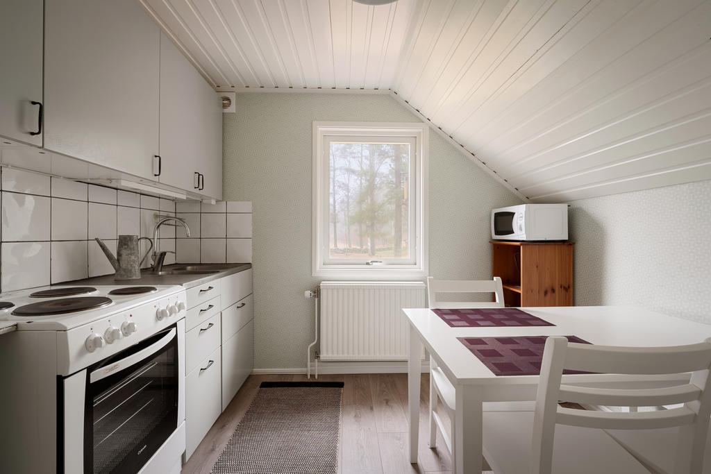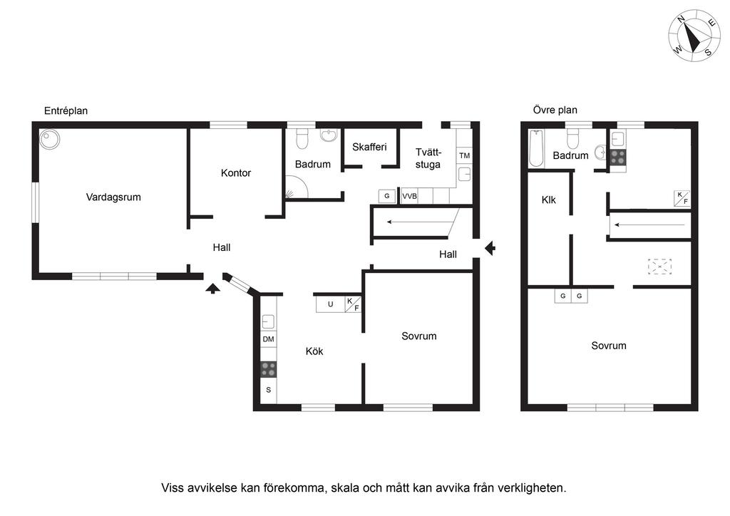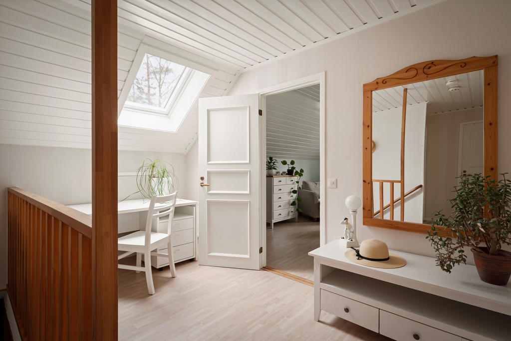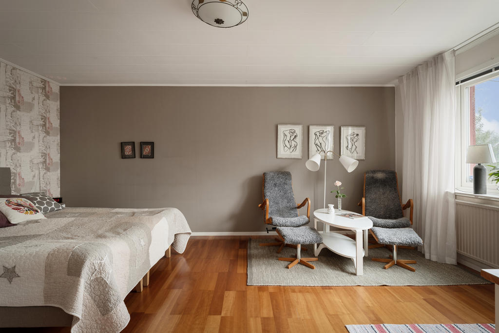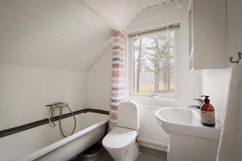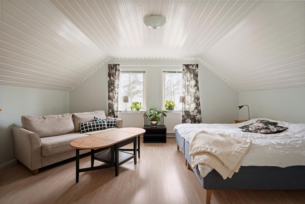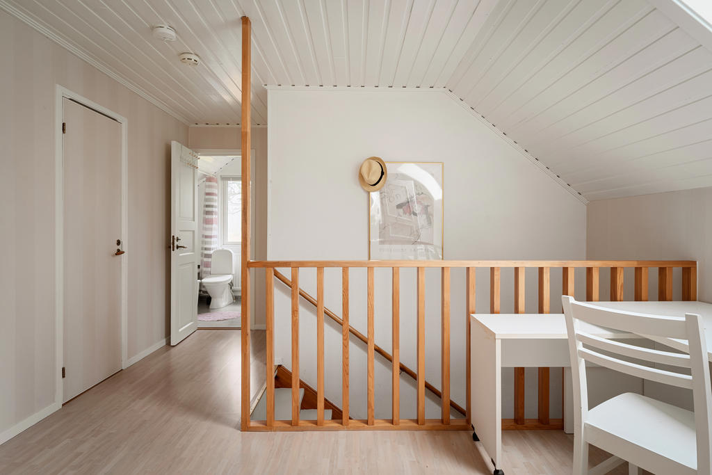 Ovanvåningen nås både via entréplanet och separat ingång, vilket skapar utmärkta förutsättningar för såväl generationsboende som uthyrning. Här finns ett enklare kök/pentry med matplats, badrum med badkar, ett stort sovrum samt klädkammare.