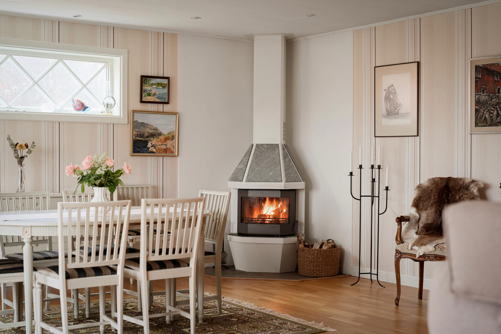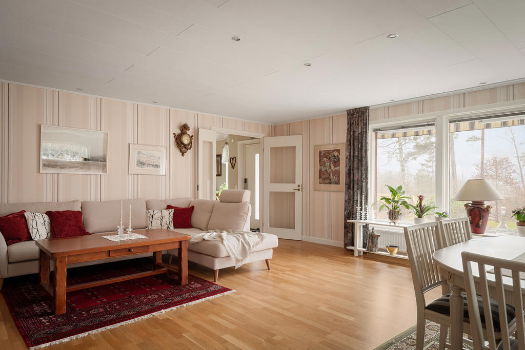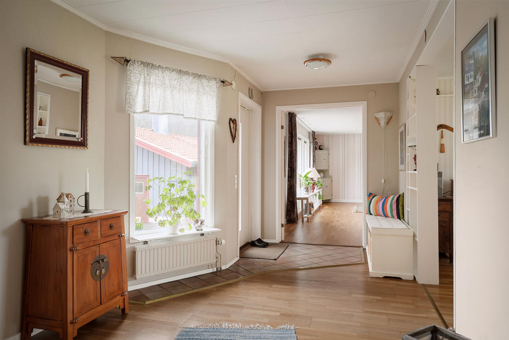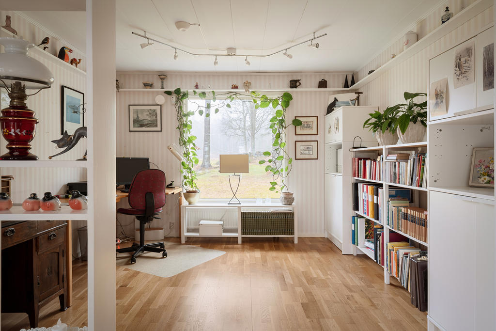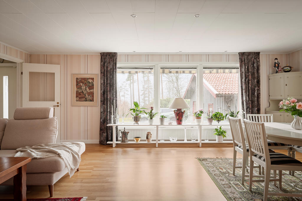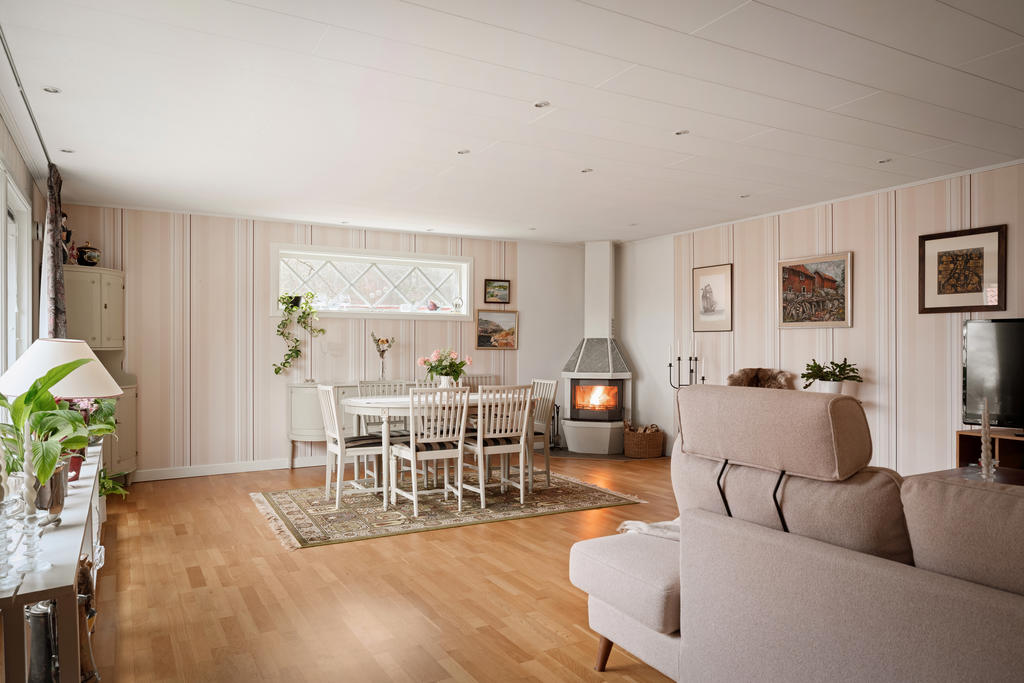 Bostadshuset om ca 190 kvadratmeter är välskött och erbjuder ett flexibelt boende med stora möjligheter. Entréplanet bjuder in till social samvaro med ett rymligt vardagsrum där eldstaden skapar både värme och trivsel, de stora fönsterpartierna släpper in rikligt med ljus. Köket renoverades 2020 och erbjuder gott om plats för matlagning och umgänge. Vidare finns badrum med dusch, tvättstuga med utgång ut till trädgården, ett sovrum samt ett kontor som enkelt kan omvandlas till ett ytterligare sovrum. Därtill finns även goda förvaringsutrymmen.