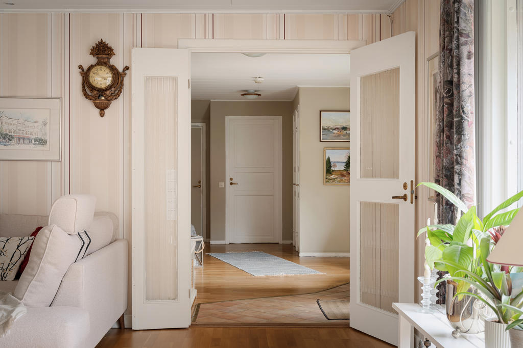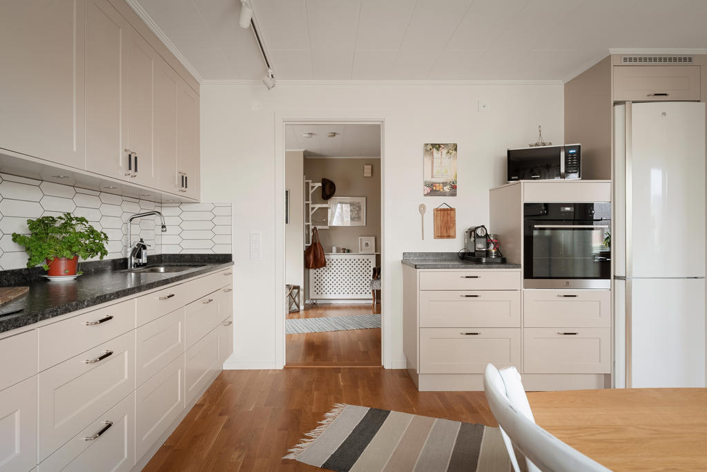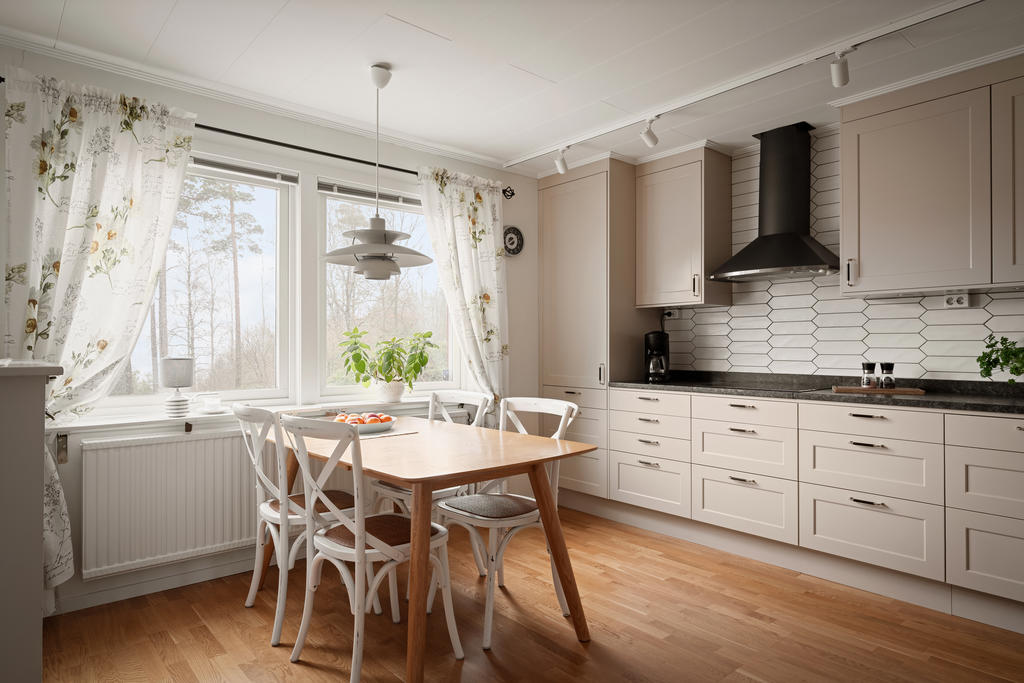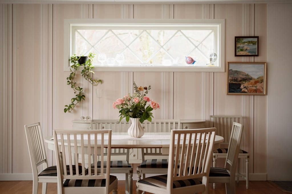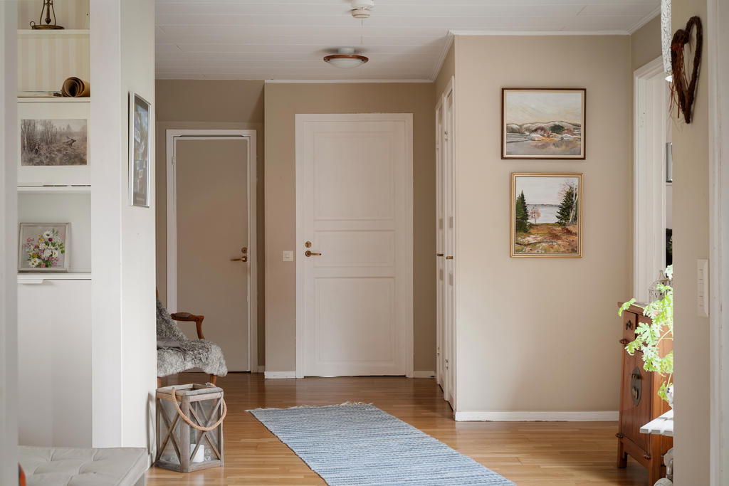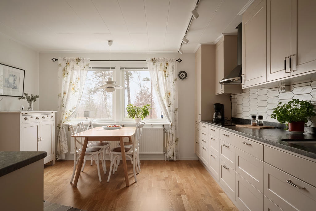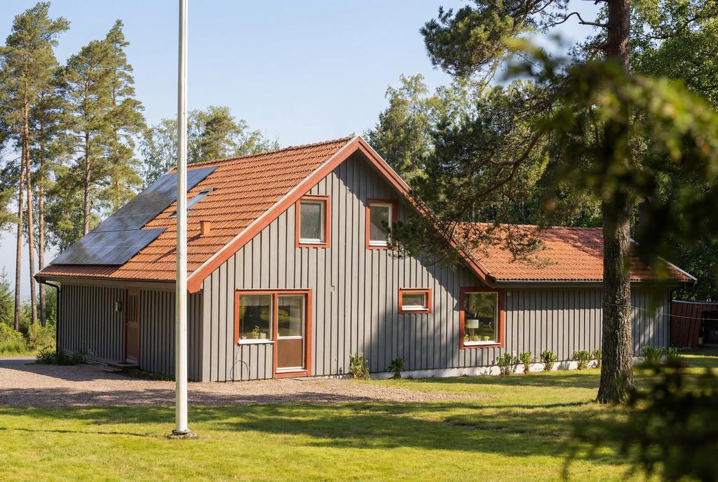 Bostadshuset om ca 190 kvadratmeter är välskött och erbjuder ett flexibelt boende med stora möjligheter. Entréplanet bjuder in till social samvaro med ett rymligt vardagsrum där eldstaden skapar både värme och trivsel, de stora fönsterpartierna släpper in rikligt med ljus. Köket renoverades 2020 och erbjuder gott om plats för matlagning och umgänge. Vidare finns badrum med dusch, tvättstuga med utgång ut till trädgården, ett sovrum samt ett kontor som enkelt kan omvandlas till ett ytterligare sovrum. Därtill finns även goda förvaringsutrymmen.