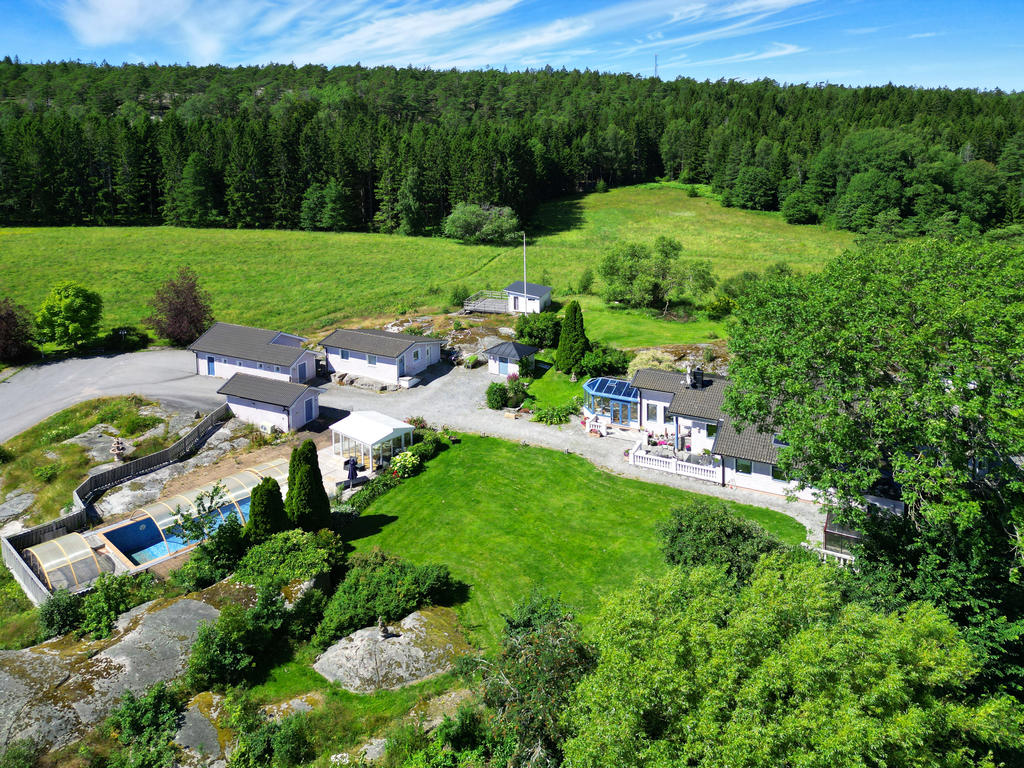 När du närmar dig egendomen möts du av en inbjudande uppfart som genast ger intrycket av den omsorg och kärlek som lagts ner på att sköta om platsen. Det finns gott om parkeringsplatser både utanför och inne i grinden, med ett dubbelgarage utrustat med elektriska portar och till och med ett singelgarage, vilket ger möjligheter för att arrangera större tillställningar eller ha gäster på besök. På andra sidan gården, en bit in på tomten, står en modern maskinhall som ger utrymme för förvaring av allt från verktyg och fordon till en hel verkstad. Du kommer vidare mot huset längs en stensatt gång som leder fram till entrén. På vägen passerar du en rymlig uteplats, omgärdad av staket, där ett poolhus med inglasning och en generös pool med ett tak på 5 x 10 meter bjuder in till avkoppling och nöje. På motsatt sida av poolområdet finner du ytterligare tre byggnader som kompletterar gården på bästa sätt. Ett kontorsutrymme på cirka 45 kvadratmeter, som också kan användas som gästhus vid behov, tillsammans med det dubbla garaget och ett större förråd, utrustat med sitt eget vattenreningsverk som garanterar högkvalitativt dricksvatten. Runt själva bostadshuset finns flera charmiga uteplatser av varierande slag, perfekta för att njuta av solen eller umgås med familj och vänner. Men det finns ännu mer att utforska. Intill bostadshuset, på en höjd, ligger ett gästhus med stora fönsterpartier och en egen liten altan, vilket ger en fantastisk start på dagen med en kopp kaffe i solens varma strålar. För de med gröna fingrar finns ett växthus där du kan odla dina egna blommor och grönsaker i överflöd, vilket bara lägger till den redan imponerande charmen och funktionaliteten hos denna fantastiska gård.