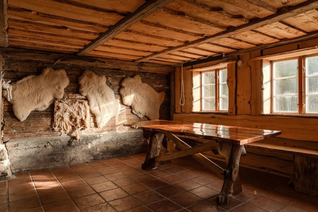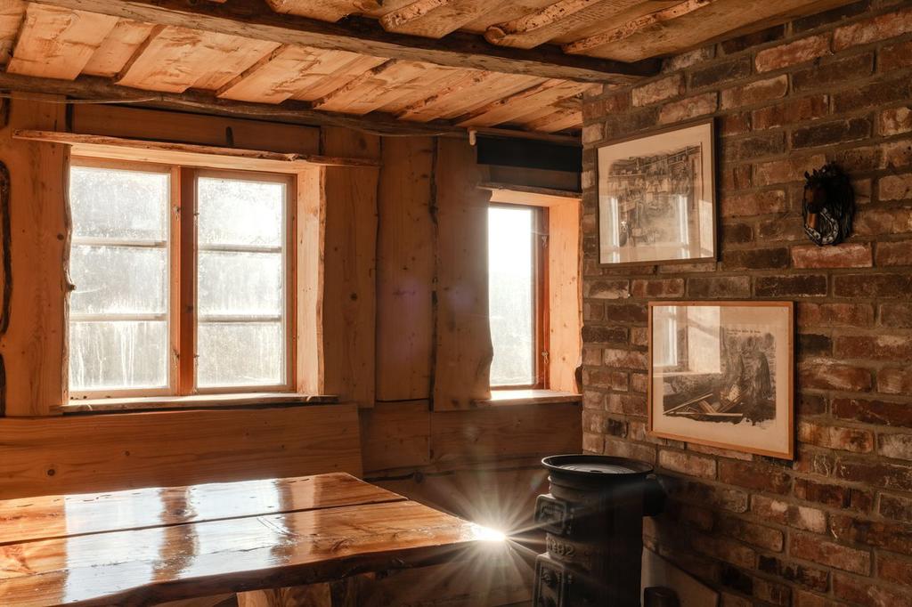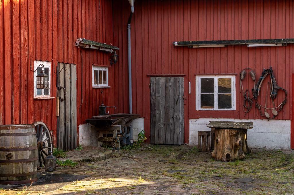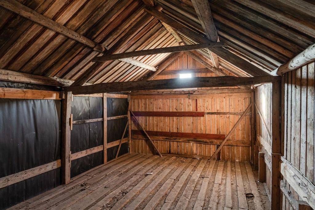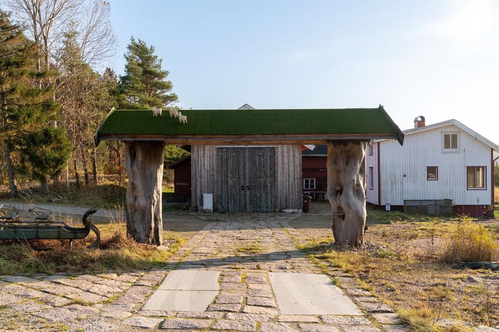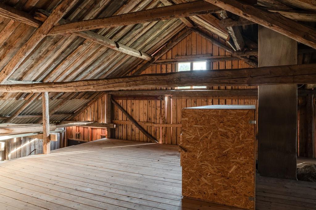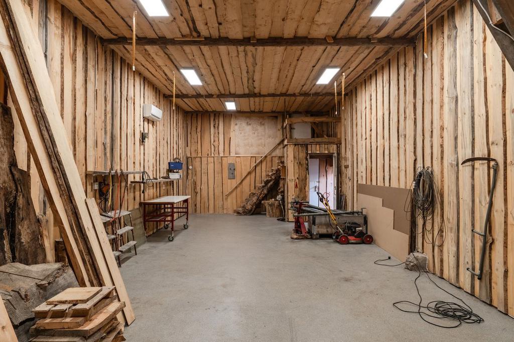 När du stiger in i ekonomibyggnaden känner du direkt atmosfären: en del inredd som gillestuga med värmande träpaneler, bekväma möbler och stora fönster som släpper in dagens skiftande ljus. Det är en varm och trivsam sällskapsyta, perfekt för familj och vänner, för stillsam avkoppling eller livliga stunder tillsammans. Bredvid ligger den generösa hall-/garage-/förvaringsdelen med högt i tak, stora portar och öppna ytor – här finns plats för maskiner, hobbyverksamhet, fordon eller att låta idéer få växa fritt.