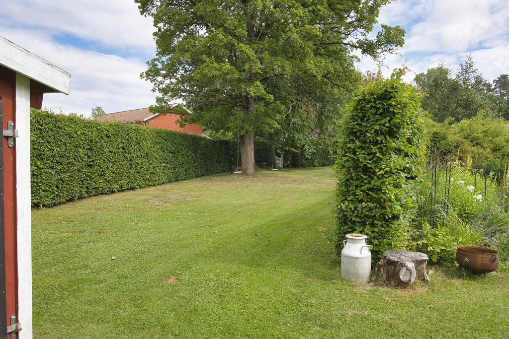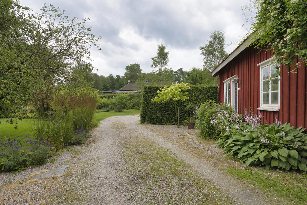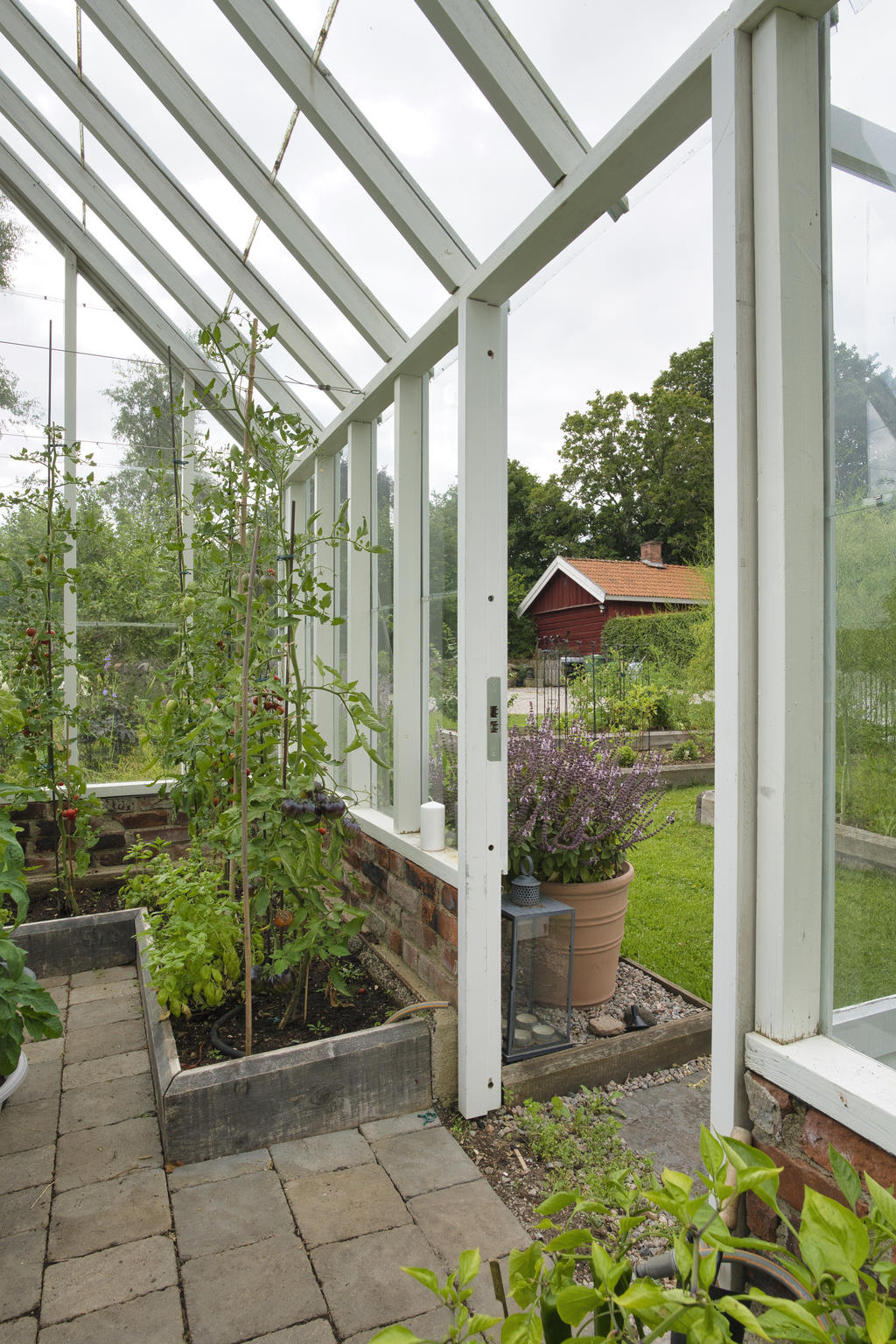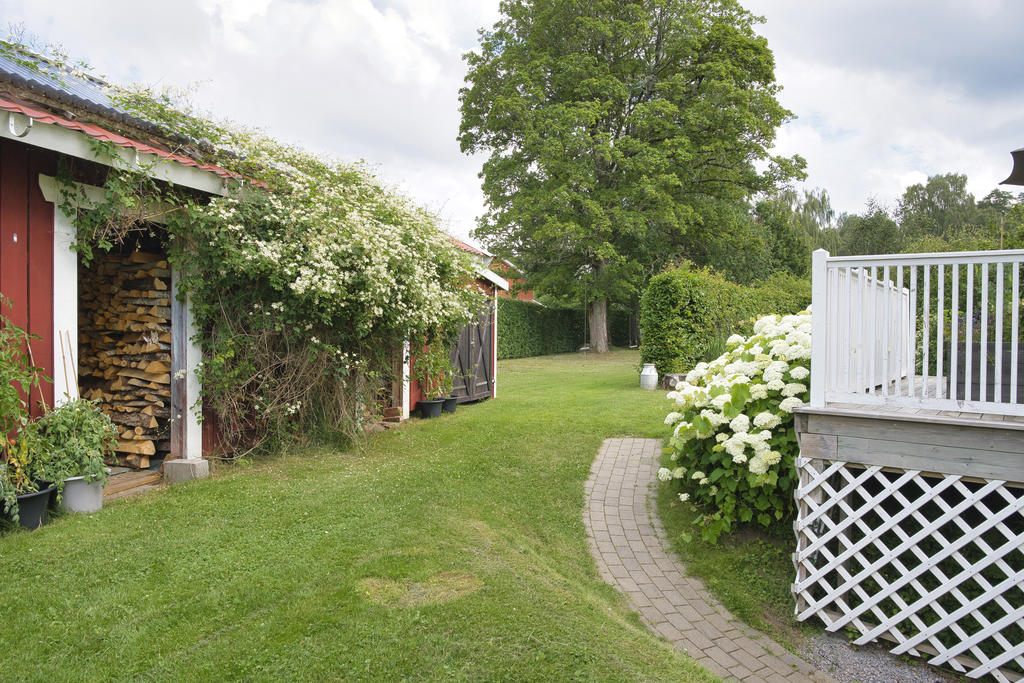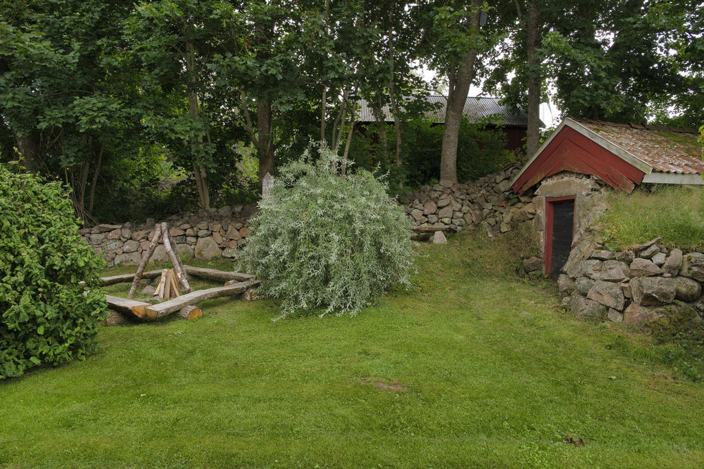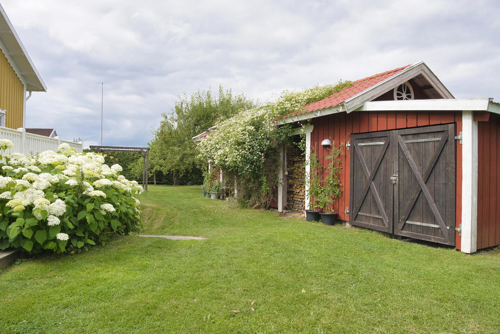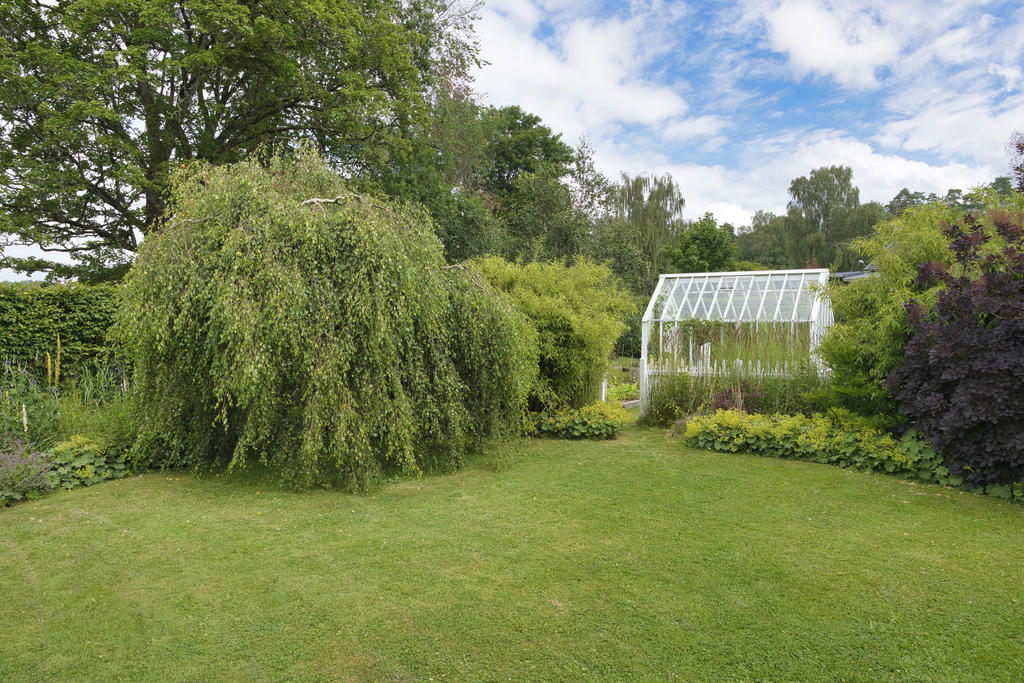 Trädgården är något alldeles särskilt – en genomtänkt och levande plats som förändras i takt med årstiderna. Här har man skapat olika rum: en skyddad uteplats för långa sommarkvällar, en blomstrande del där färgerna vandrar från vårens första spirande toner till sensommarens djupa prakt, och mer stillsamma hörn där man kan slå sig ner och bara vara. Gångar leder besökaren vidare genom grönskan, och överallt finns små överraskningar som gör att trädgården ständigt känns ny. Här finns plats för både avkoppling och aktivitet – kanske i det stora stensatta växthuset där man kan njuta av både odling och lugna stunder, eller på den soliga altanen med utekök som bjuder in till sommarens måltider och gemenskap. Det charmiga hönshuset med tillhörande förrådsdel, den praktiska vedboden och den vackra jordkällaren med sitt valv bidrar till gårdens unika karaktär och funktion.