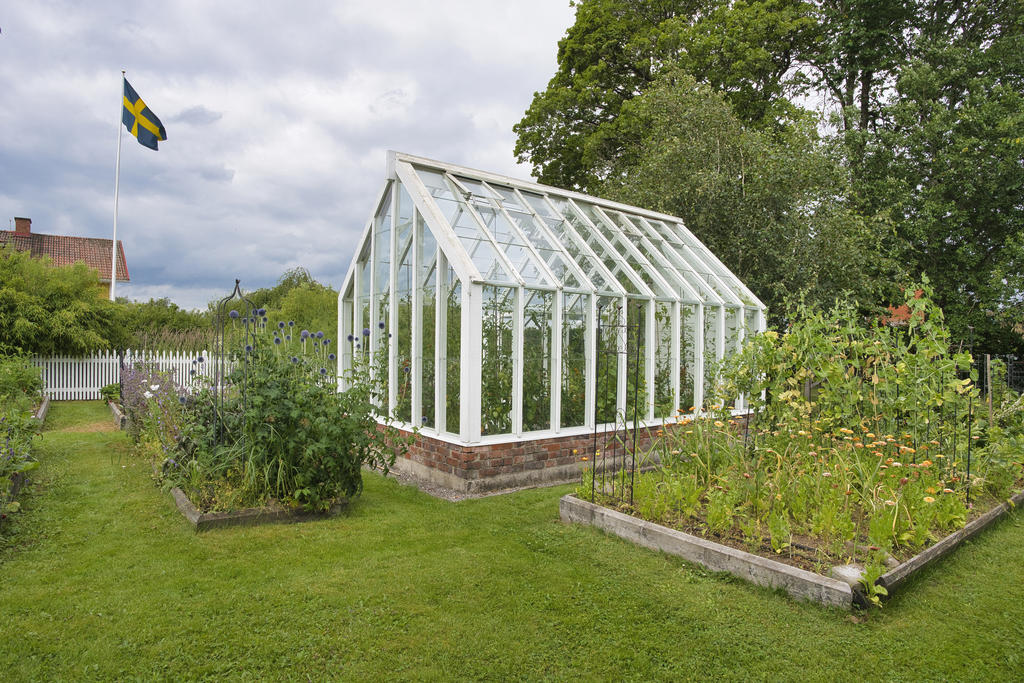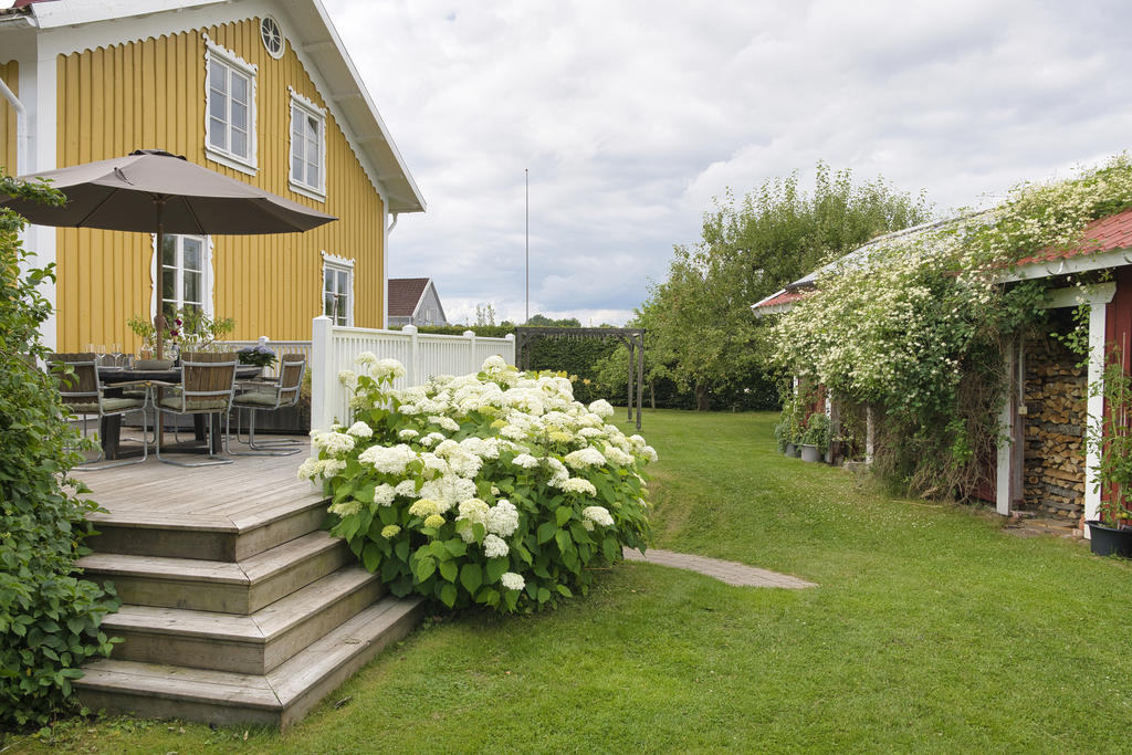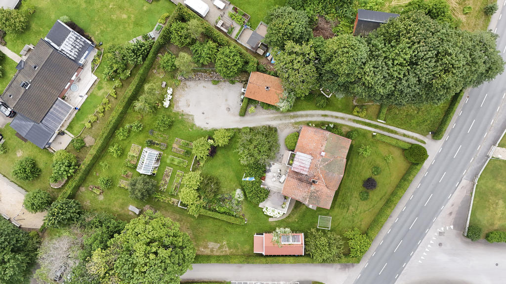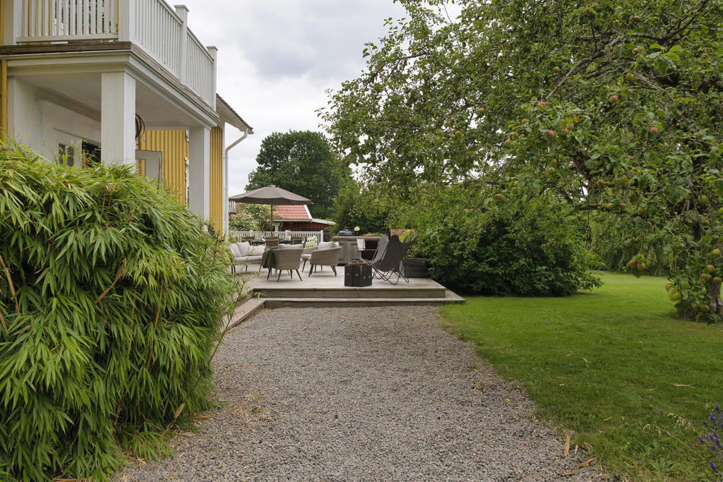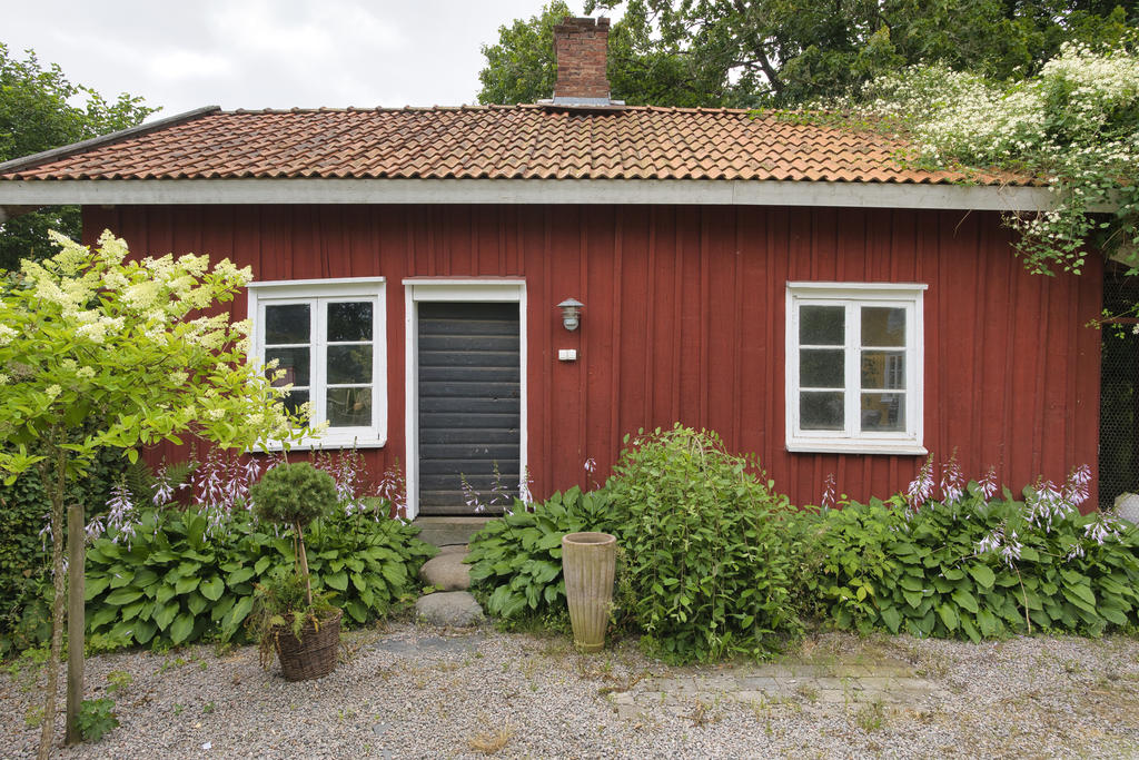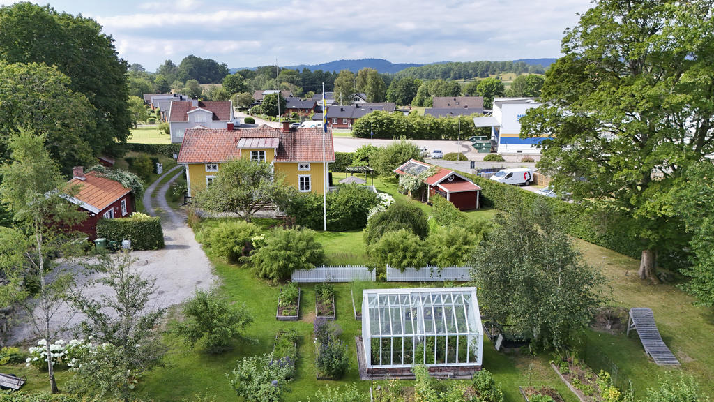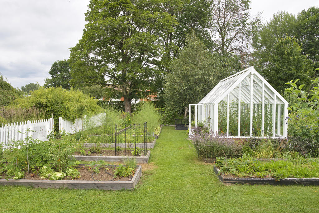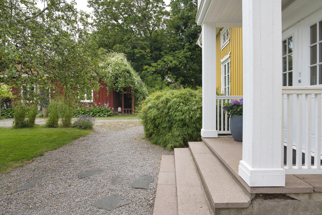 Trädgården är något alldeles särskilt – en genomtänkt och levande plats som förändras i takt med årstiderna. Här har man skapat olika rum: en skyddad uteplats för långa sommarkvällar, en blomstrande del där färgerna vandrar från vårens första spirande toner till sensommarens djupa prakt, och mer stillsamma hörn där man kan slå sig ner och bara vara. Gångar leder besökaren vidare genom grönskan, och överallt finns små överraskningar som gör att trädgården ständigt känns ny. Här finns plats för både avkoppling och aktivitet – kanske i det stora stensatta växthuset där man kan njuta av både odling och lugna stunder, eller på den soliga altanen med utekök som bjuder in till sommarens måltider och gemenskap. Det charmiga hönshuset med tillhörande förrådsdel, den praktiska vedboden och den vackra jordkällaren med sitt valv bidrar till gårdens unika karaktär och funktion.