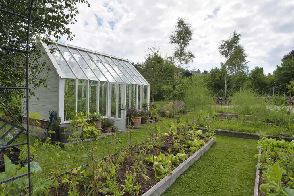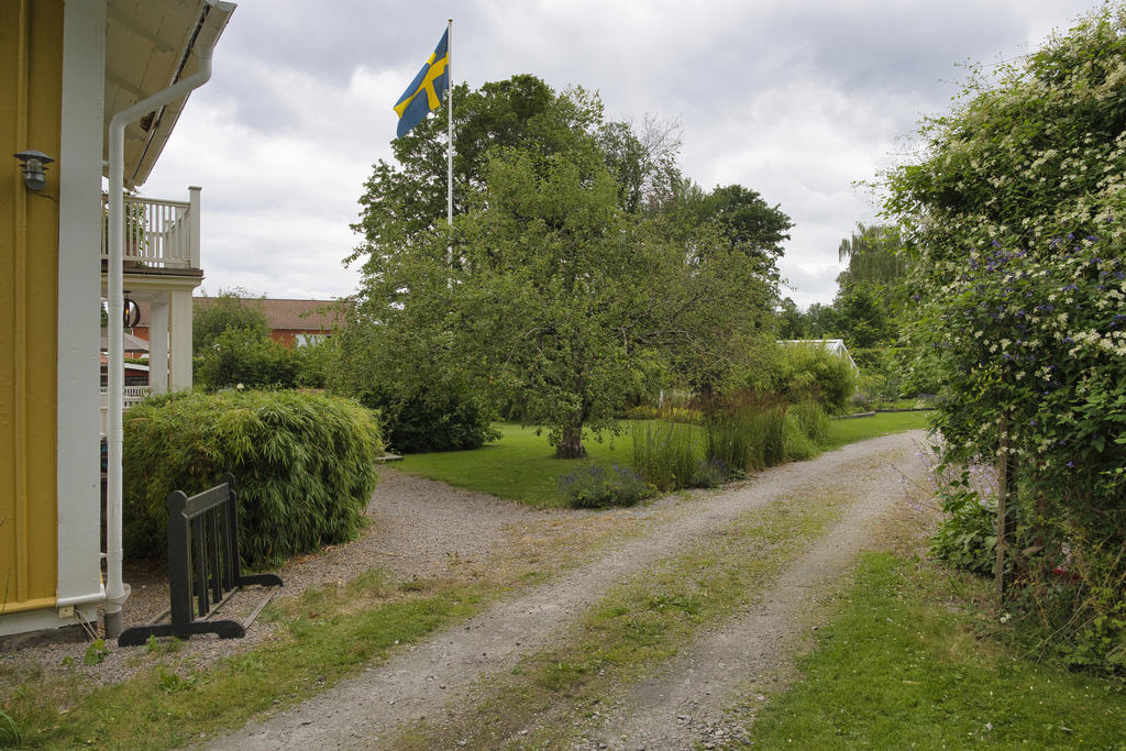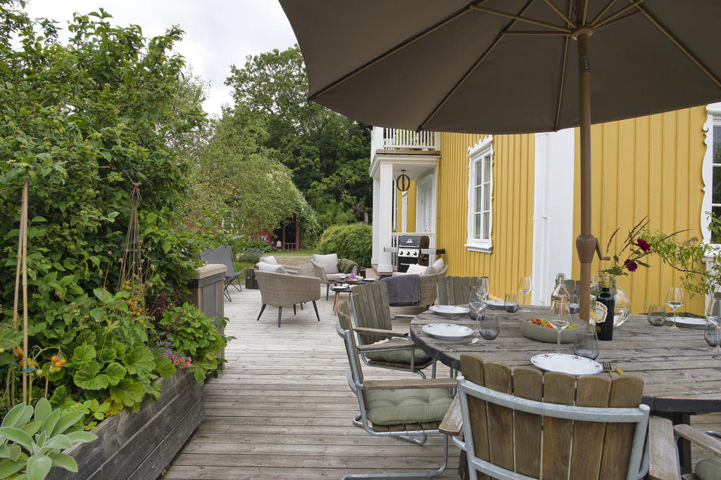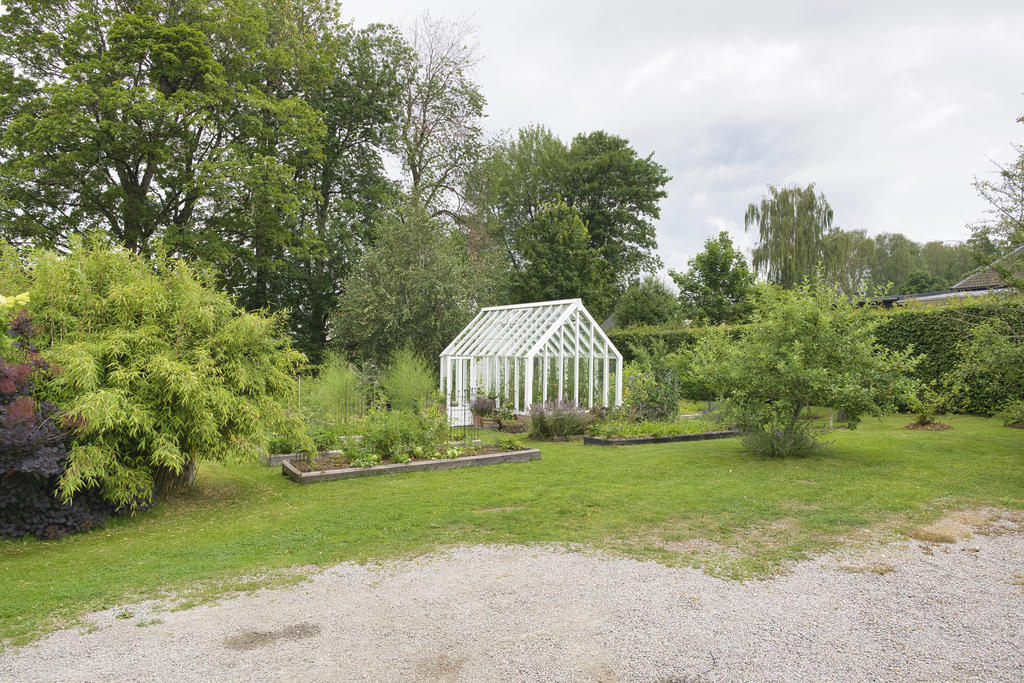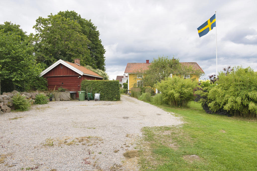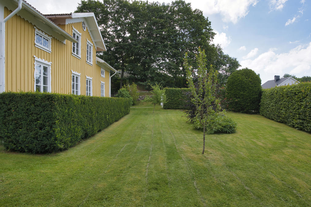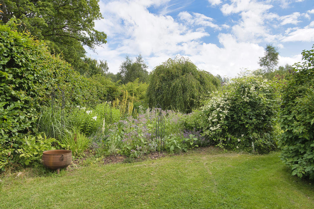 Trädgården är något alldeles särskilt – en genomtänkt och levande plats som förändras i takt med årstiderna. Här har man skapat olika rum: en skyddad uteplats för långa sommarkvällar, en blomstrande del där färgerna vandrar från vårens första spirande toner till sensommarens djupa prakt, och mer stillsamma hörn där man kan slå sig ner och bara vara. Gångar leder besökaren vidare genom grönskan, och överallt finns små överraskningar som gör att trädgården ständigt känns ny. Här finns plats för både avkoppling och aktivitet – kanske i det stora stensatta växthuset där man kan njuta av både odling och lugna stunder, eller på den soliga altanen med utekök som bjuder in till sommarens måltider och gemenskap. Det charmiga hönshuset med tillhörande förrådsdel, den praktiska vedboden och den vackra jordkällaren med sitt valv bidrar till gårdens unika karaktär och funktion.