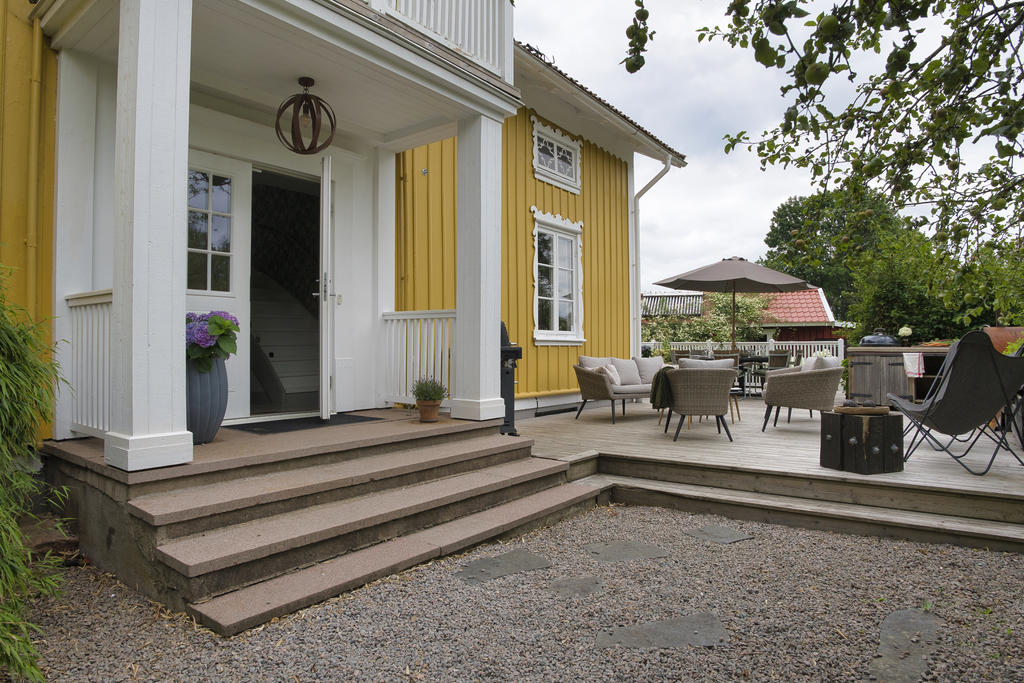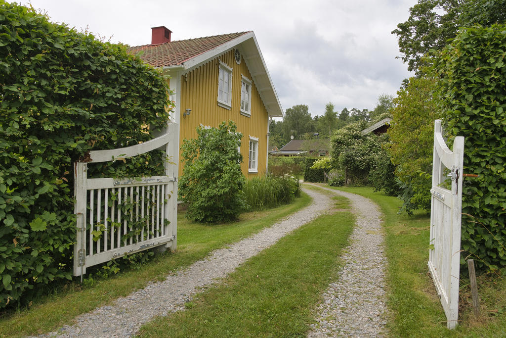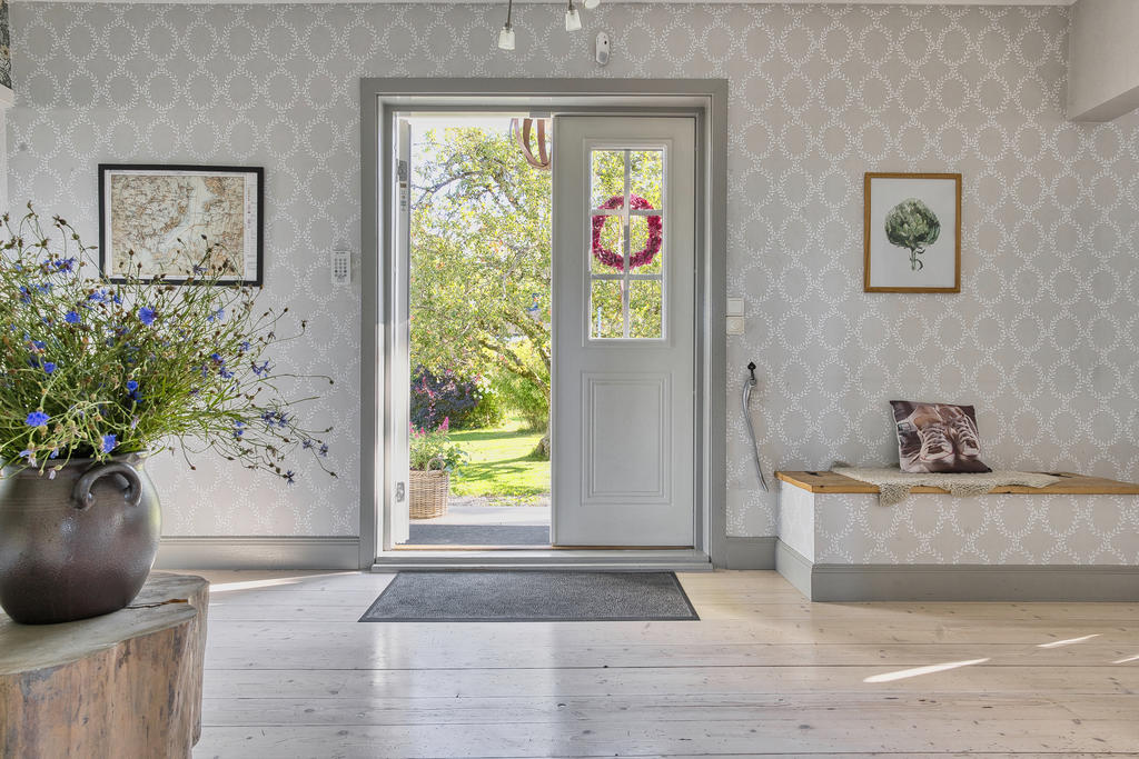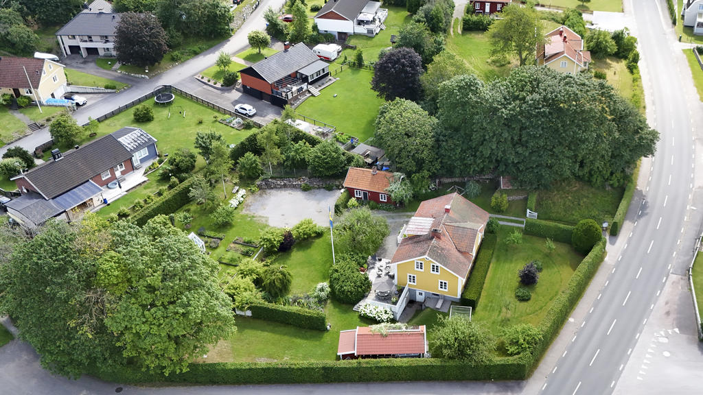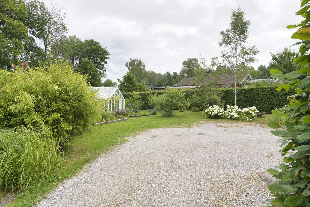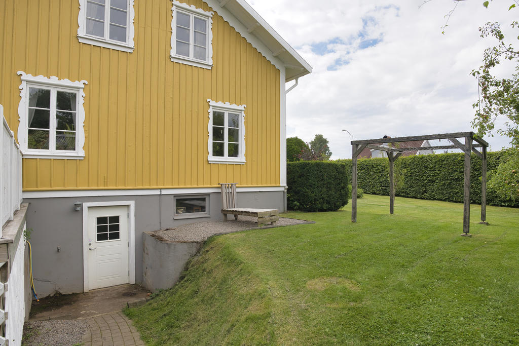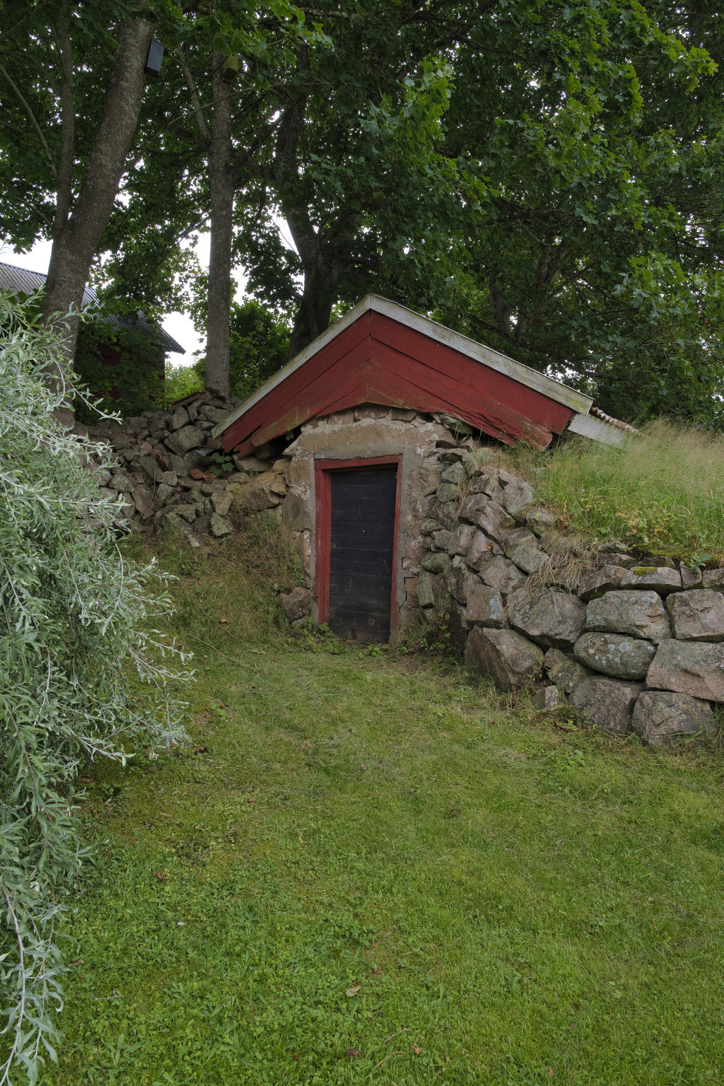 Trädgården är något alldeles särskilt – en genomtänkt och levande plats som förändras i takt med årstiderna. Här har man skapat olika rum: en skyddad uteplats för långa sommarkvällar, en blomstrande del där färgerna vandrar från vårens första spirande toner till sensommarens djupa prakt, och mer stillsamma hörn där man kan slå sig ner och bara vara. Gångar leder besökaren vidare genom grönskan, och överallt finns små överraskningar som gör att trädgården ständigt känns ny. Här finns plats för både avkoppling och aktivitet – kanske i det stora stensatta växthuset där man kan njuta av både odling och lugna stunder, eller på den soliga altanen med utekök som bjuder in till sommarens måltider och gemenskap. Det charmiga hönshuset med tillhörande förrådsdel, den praktiska vedboden och den vackra jordkällaren med sitt valv bidrar till gårdens unika karaktär och funktion.