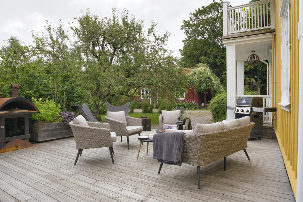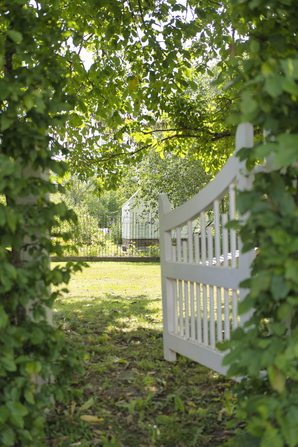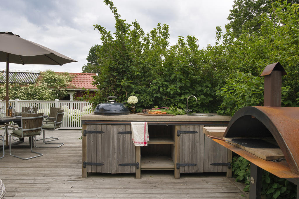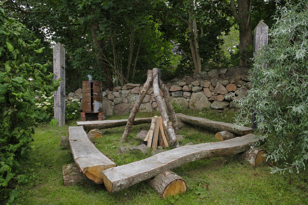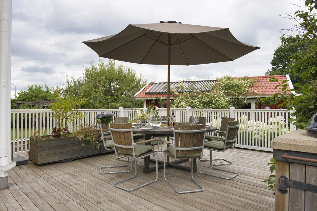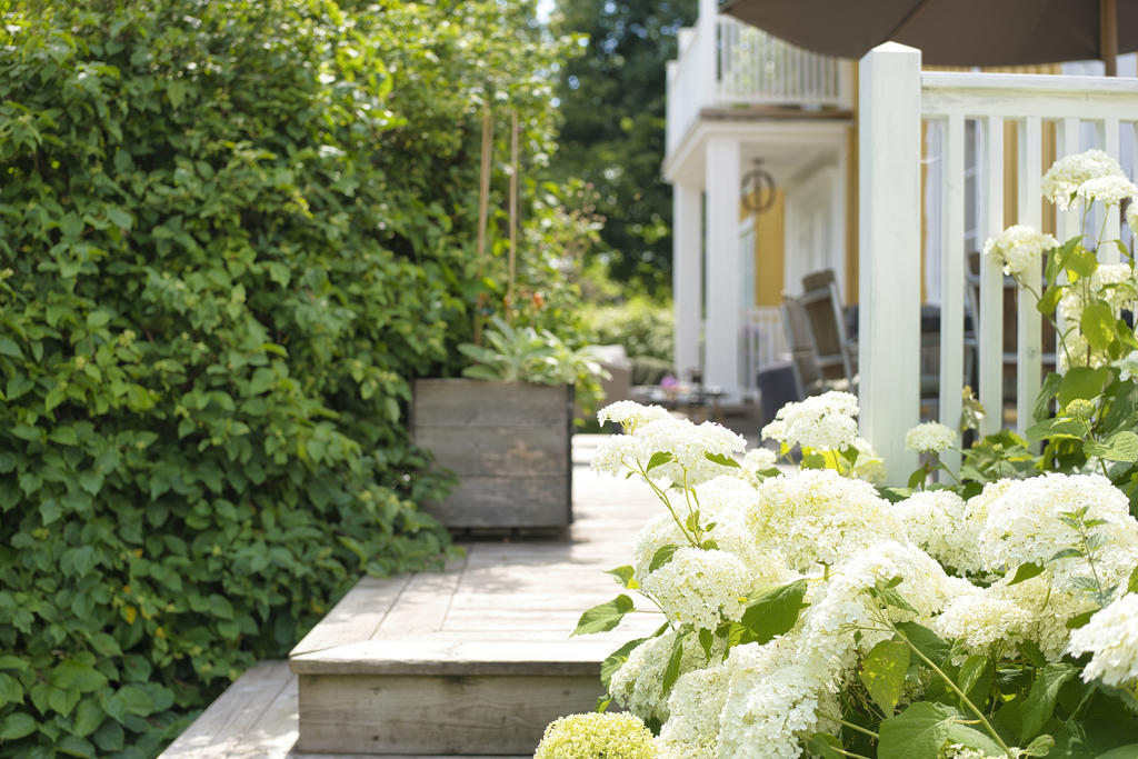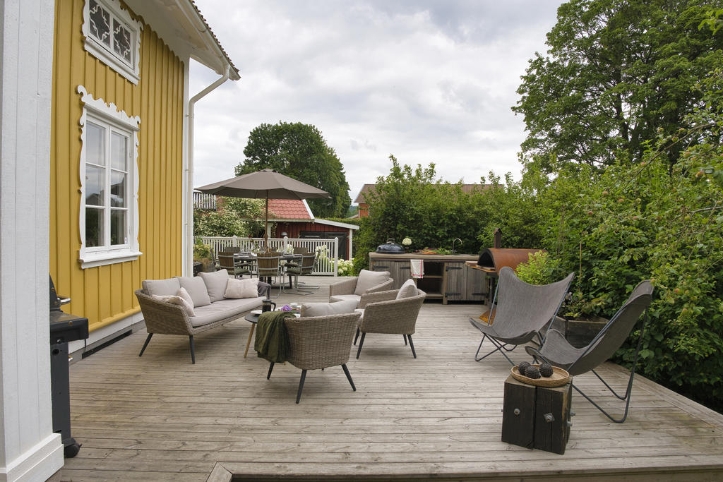 Trädgården är något alldeles särskilt – en genomtänkt och levande plats som förändras i takt med årstiderna. Här har man skapat olika rum: en skyddad uteplats för långa sommarkvällar, en blomstrande del där färgerna vandrar från vårens första spirande toner till sensommarens djupa prakt, och mer stillsamma hörn där man kan slå sig ner och bara vara. Gångar leder besökaren vidare genom grönskan, och överallt finns små överraskningar som gör att trädgården ständigt känns ny. Här finns plats för både avkoppling och aktivitet – kanske i det stora stensatta växthuset där man kan njuta av både odling och lugna stunder, eller på den soliga altanen med utekök som bjuder in till sommarens måltider och gemenskap. Det charmiga hönshuset med tillhörande förrådsdel, den praktiska vedboden och den vackra jordkällaren med sitt valv bidrar till gårdens unika karaktär och funktion.