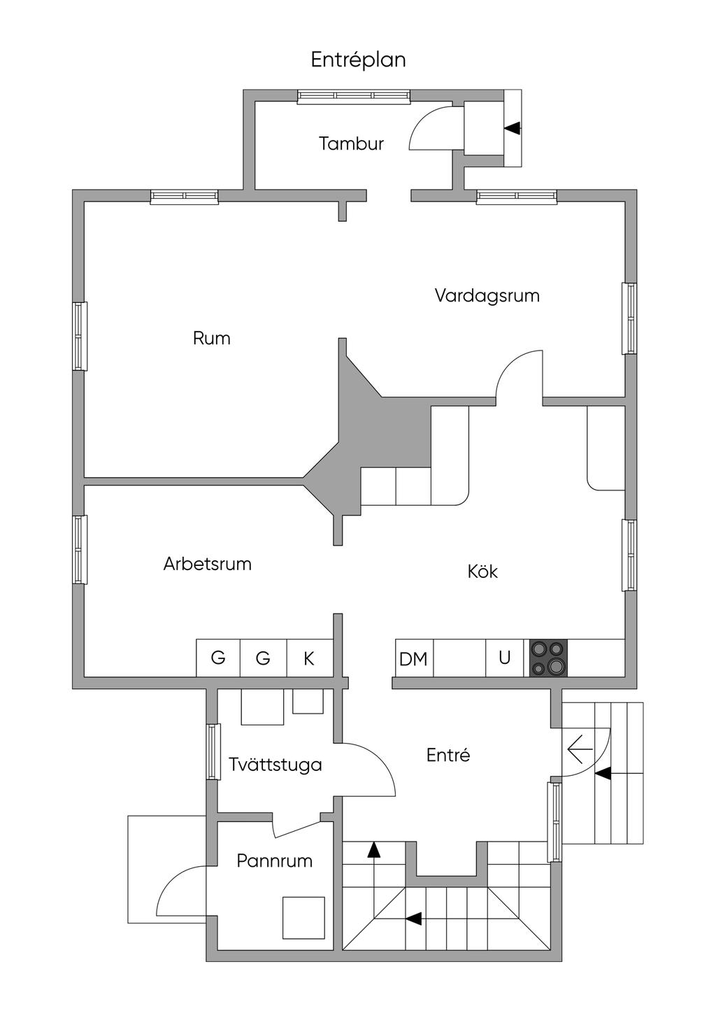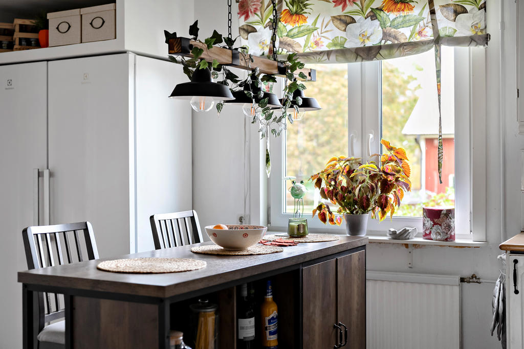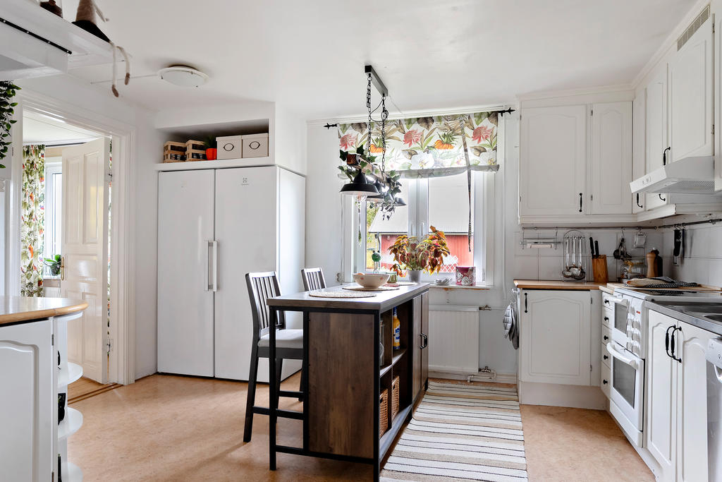 Boningshuset är rymligt och funktionellt, med fyra sovrum och två allrum som ger plats för både vardag och gäster. Köket har bevarat sin lantliga själ med en vedspis, samtidigt som huset värms upp med modern bergvärme för bekväm och effektiv drift. Planlösningen är socialt inbjudande och bjuder på både gemenskap och avskildhet.