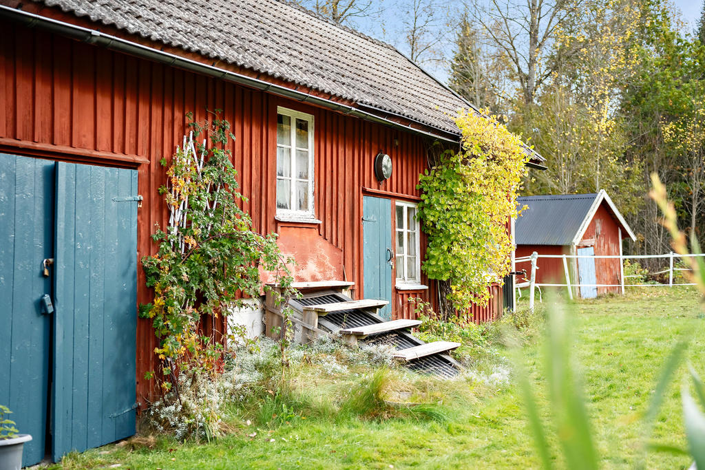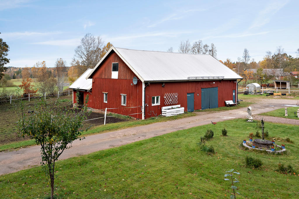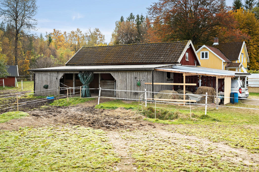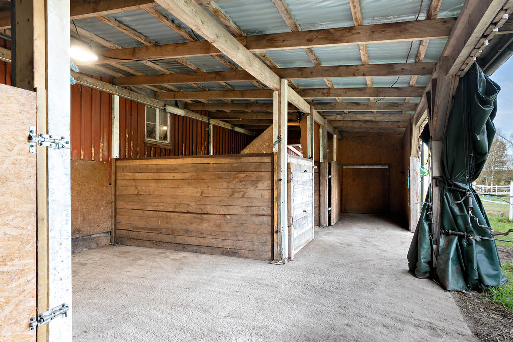 Stallbyggnaden på gården är inredd med tre boxar (möjlighet till en fjärde) och har dessutom flera förvaringsytor samt ett charmigt sommarrum som fungerar utmärkt som tillfälligt gästrum. Det finns fyra färdiginhägnade hagar samt ytterligare en ladugård med verkstad och förråd – perfekt för den som vill meka, snickra eller utveckla en gårdsverksamhet.