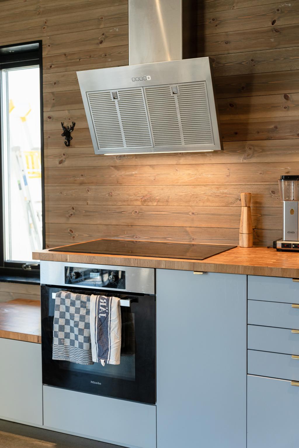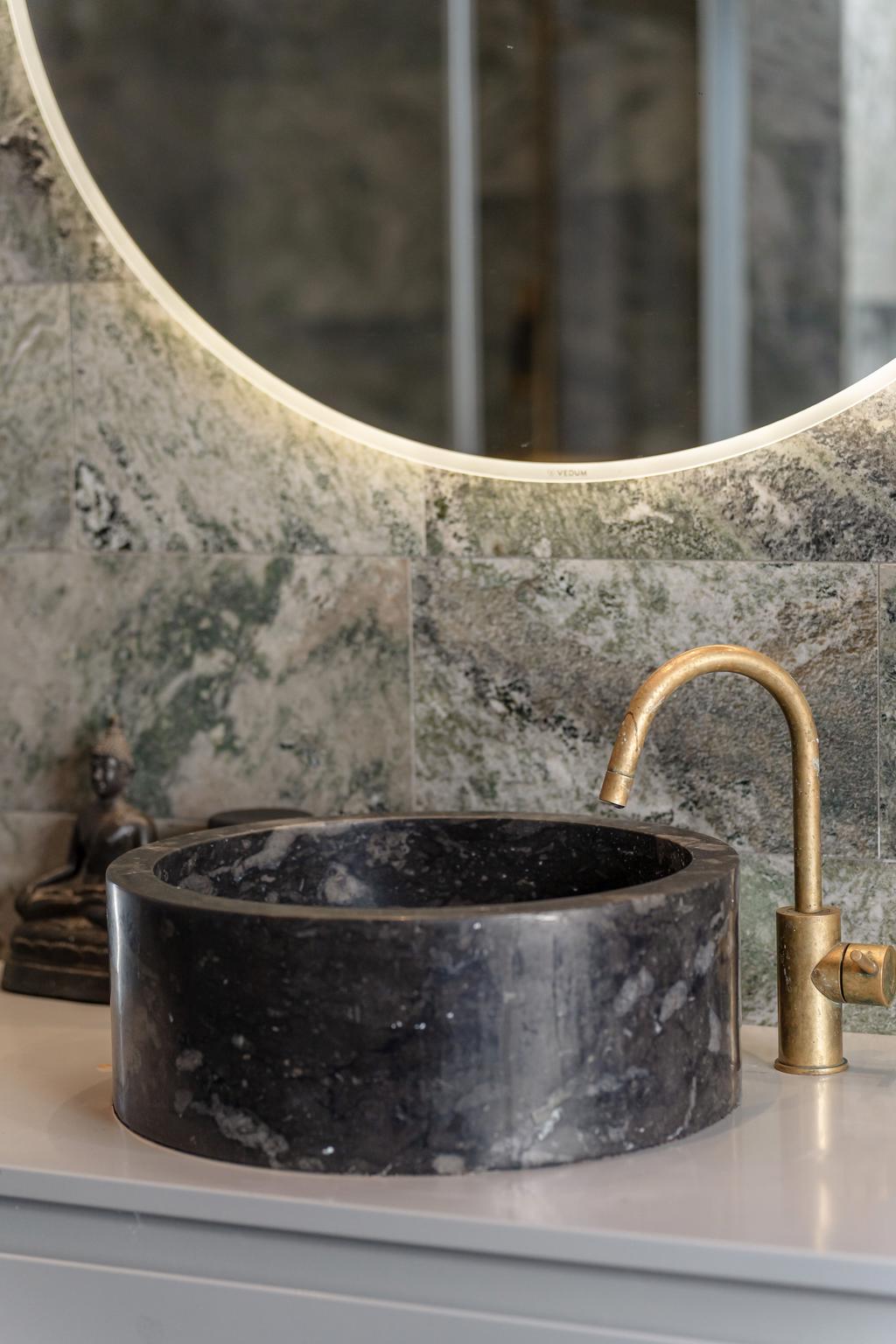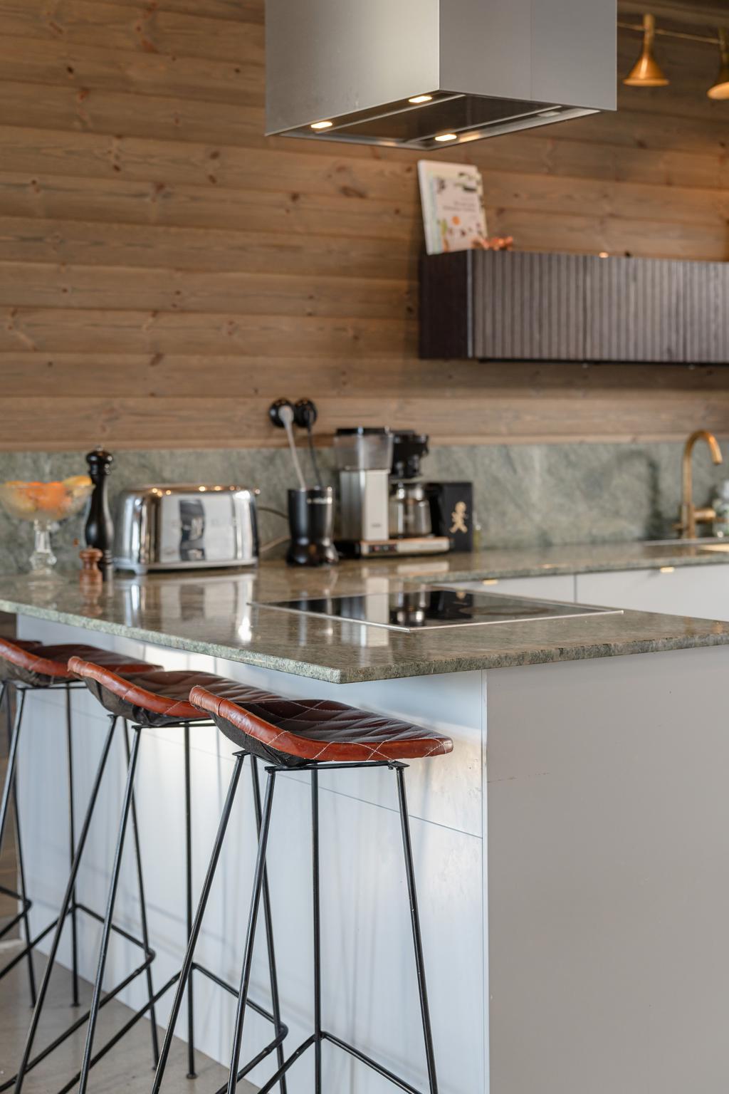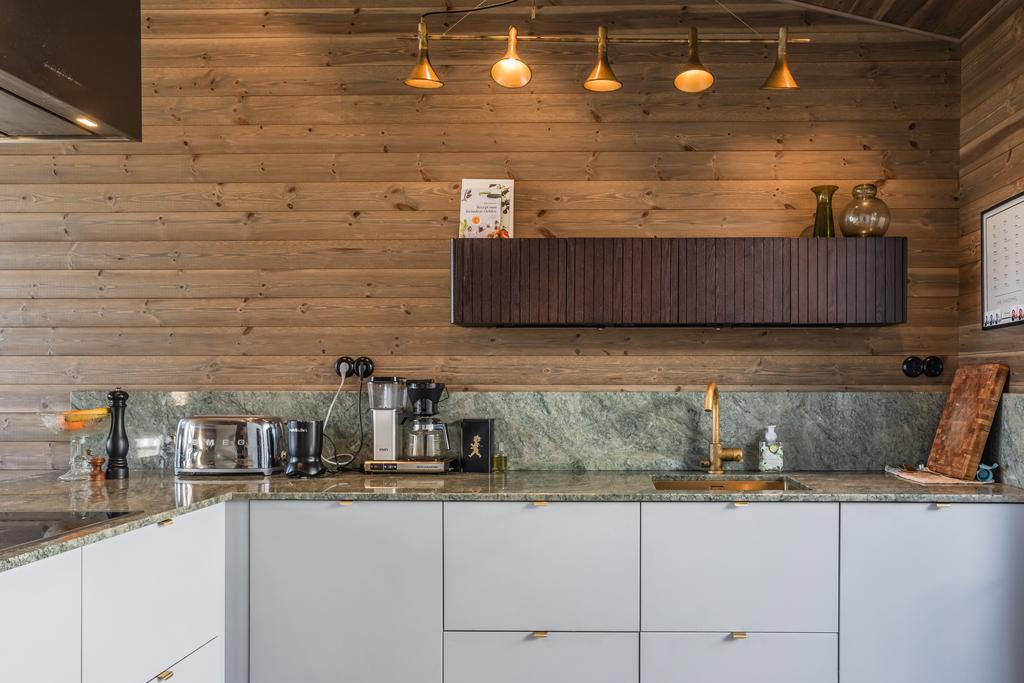 Två fullt utrustade kök – ett primärt och ett produktionskök – möjliggör både vardag och större tillställningar. Inredning från Vedum och vitvaror från Miele kombineras med material som grön marmor, ekfaner och mässing från Tapwell.