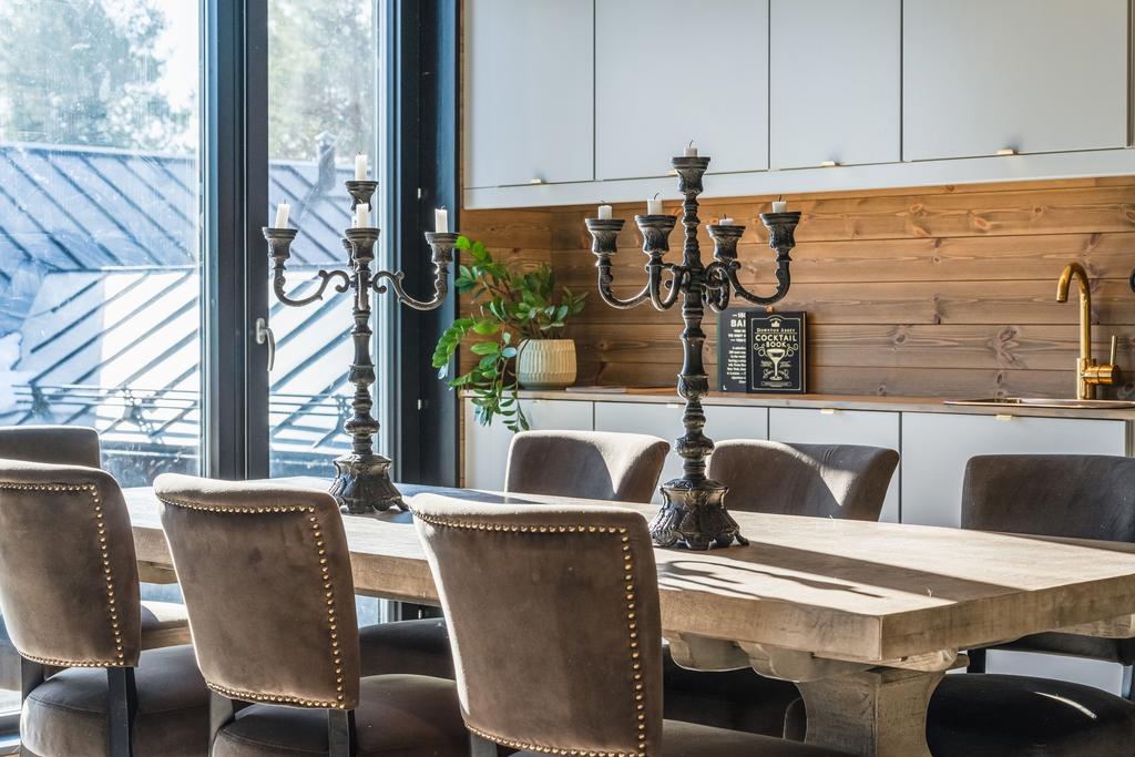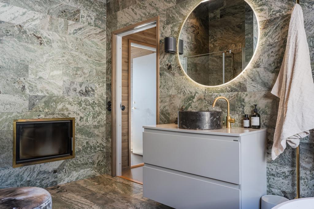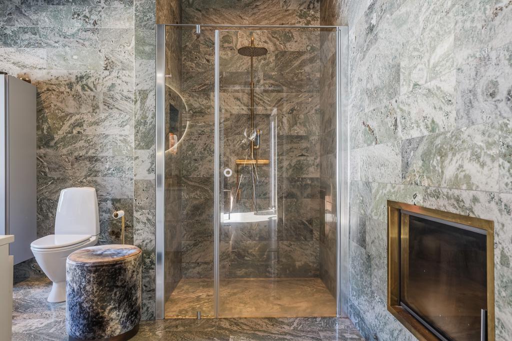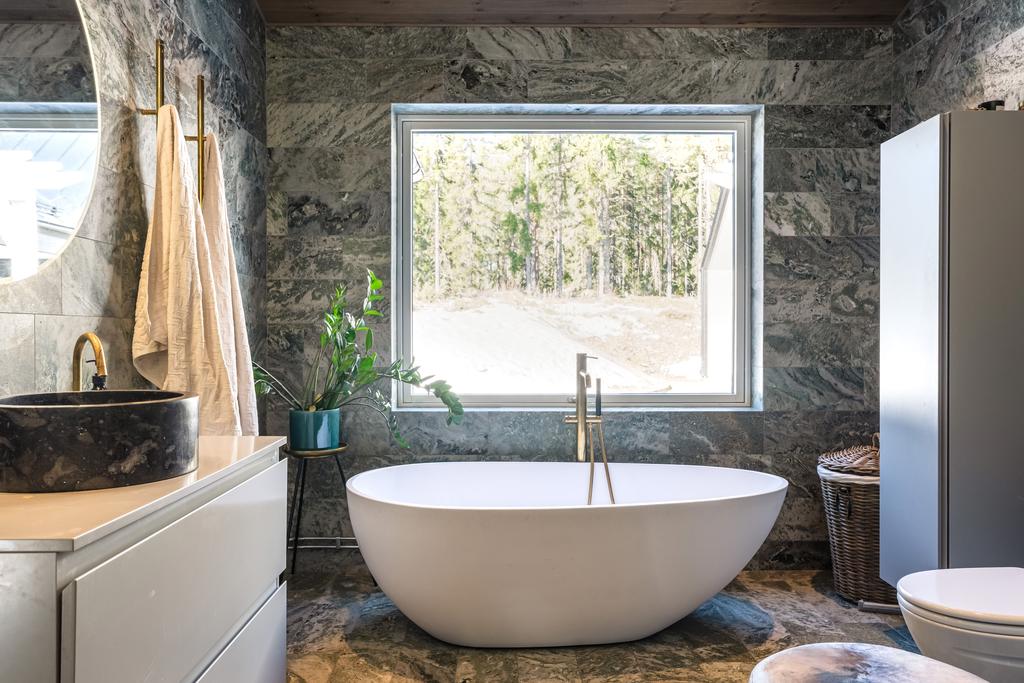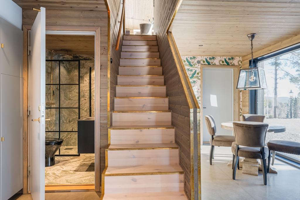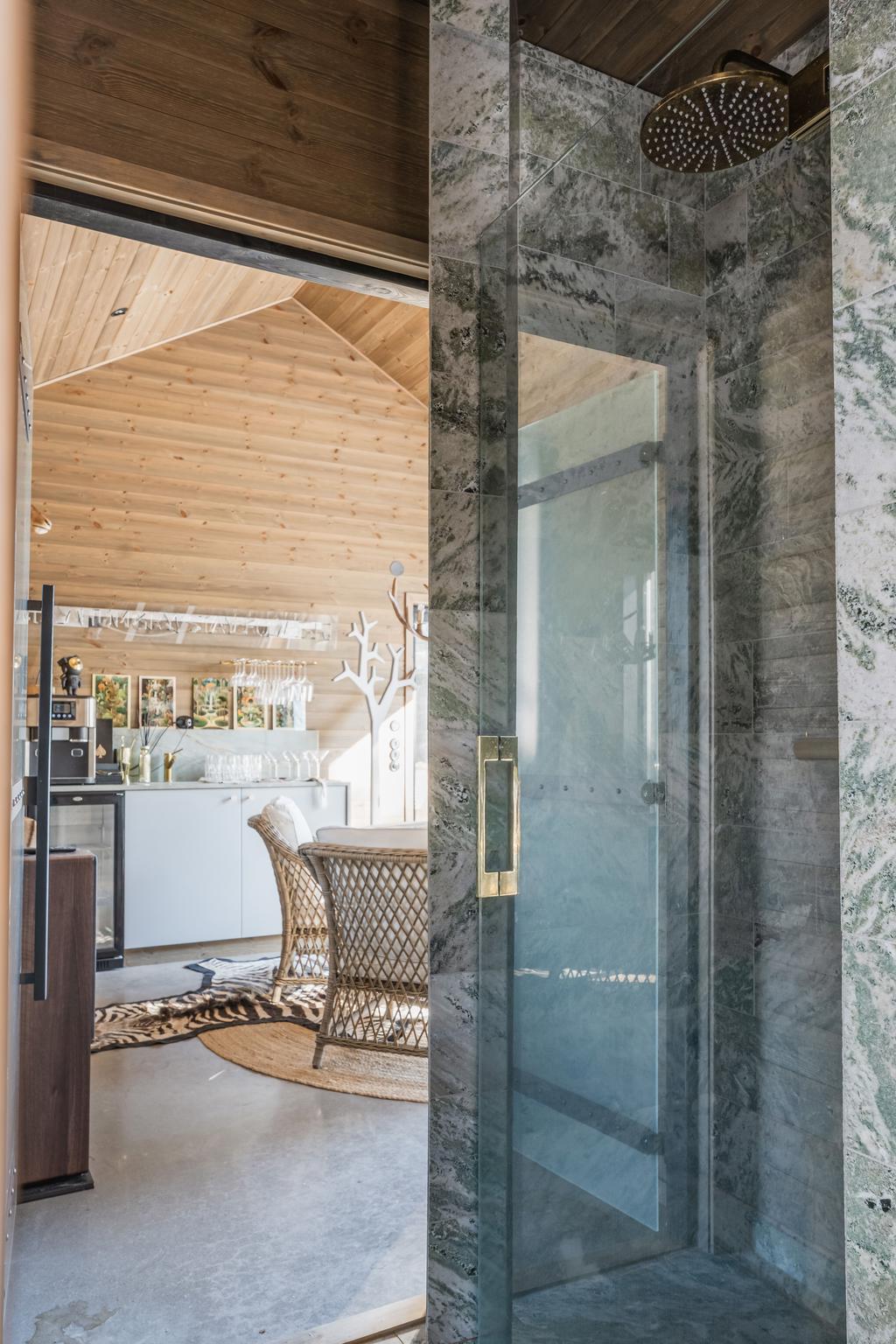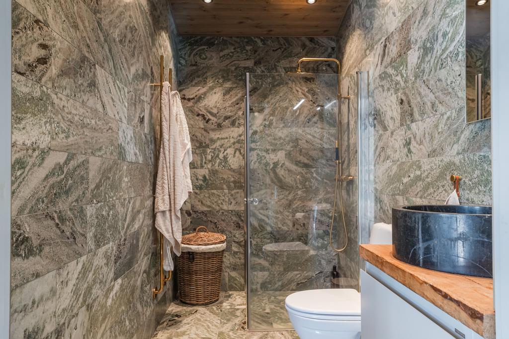 Inrett av Slettvoll i samspel med Artwood och exklusiv belysning. Badrum i kolmårdsmarmor med takduschar och mässingsdetaljer. Exteriört präglas fastigheten av sten, granit och plåttak från Järvsö Plåt. Entrén i kraftigt timmer med skiffergolv sätter tonen direkt vid ankomst.