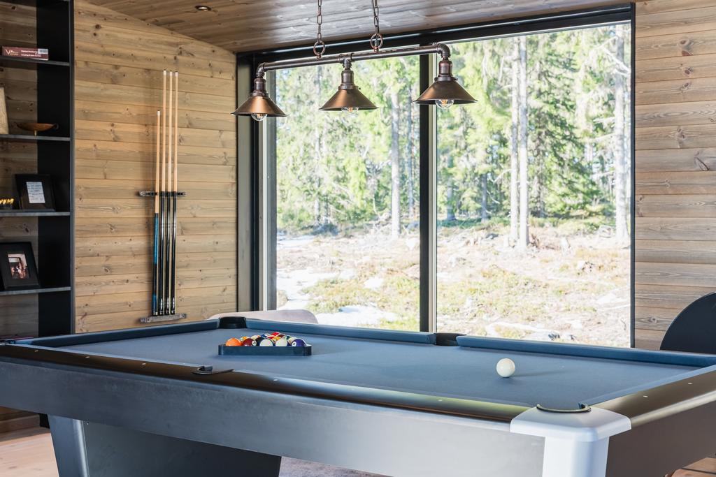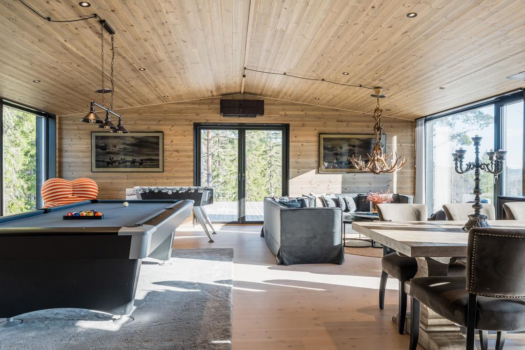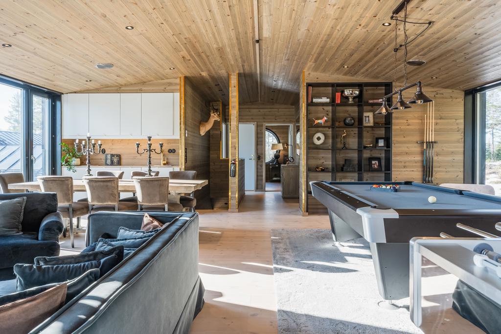 Sociala ytor inkluderar två vardagsrum, biorum och flera matplatser. Huvudvardagsrummet om ca 60 kvm rymmer biljard, matsal för upp till 18 personer, lounge och eldstad.