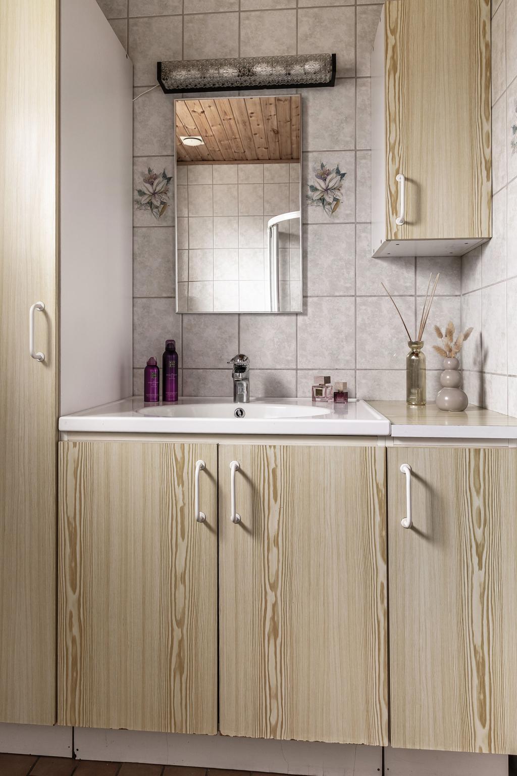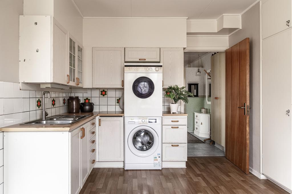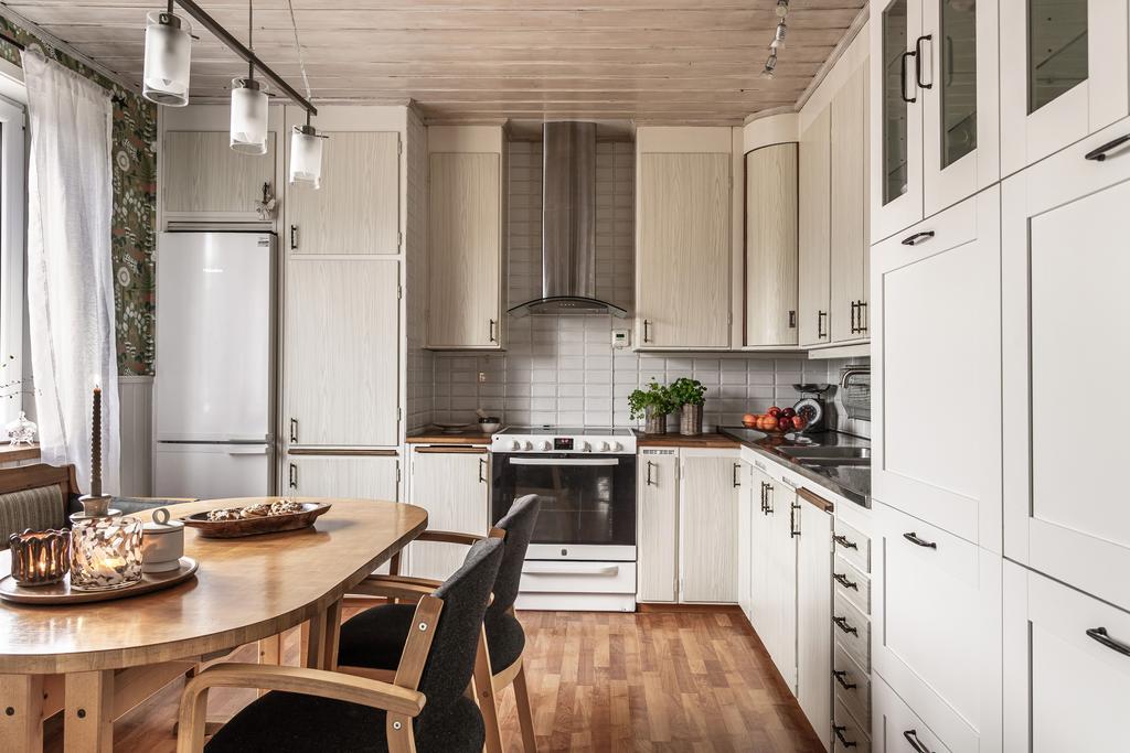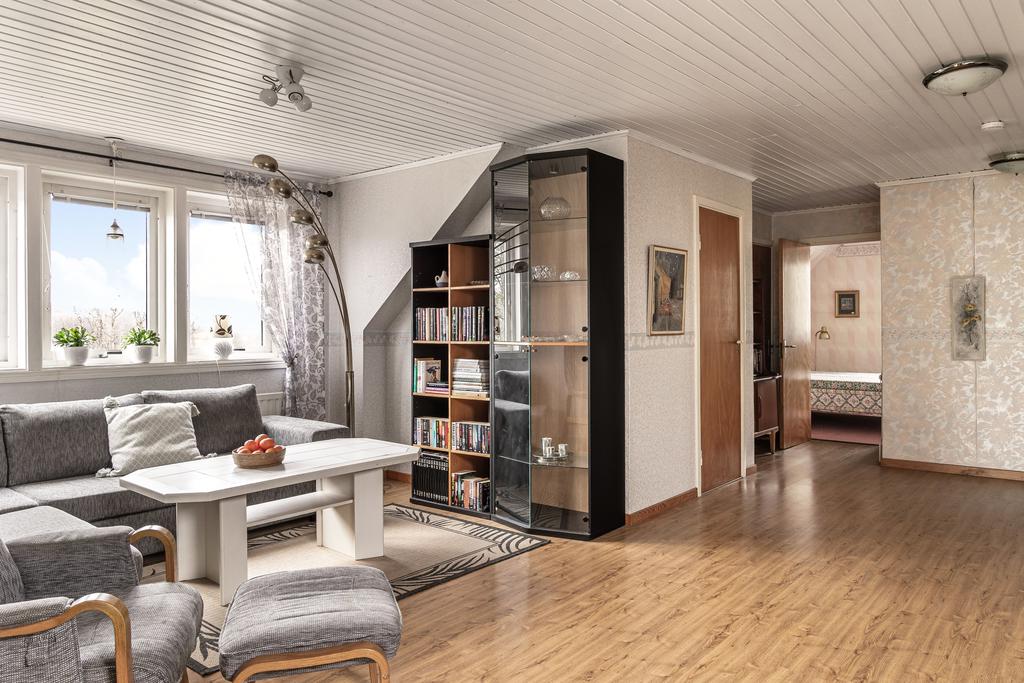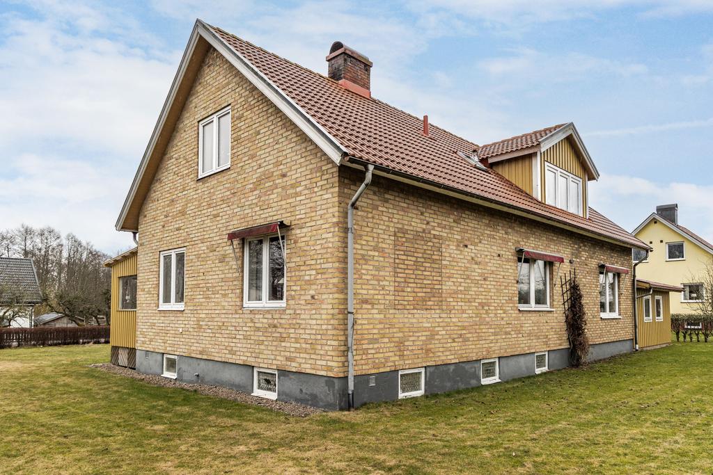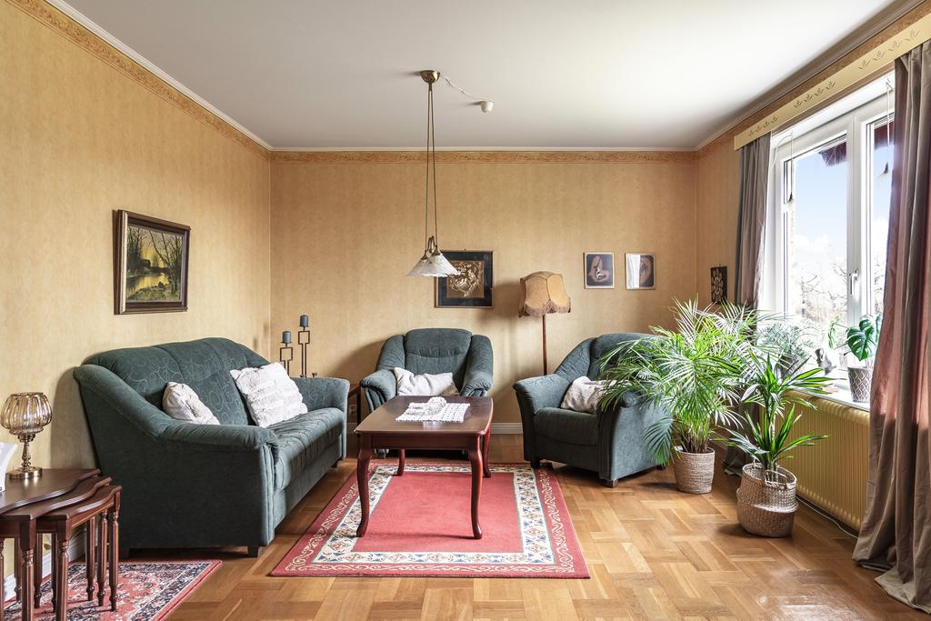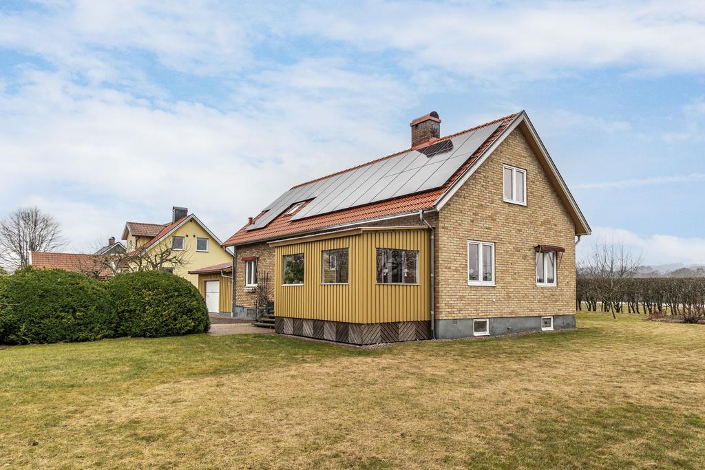 Rymlig 1½-plansvilla på lummig tomt med solceller, garage och källare