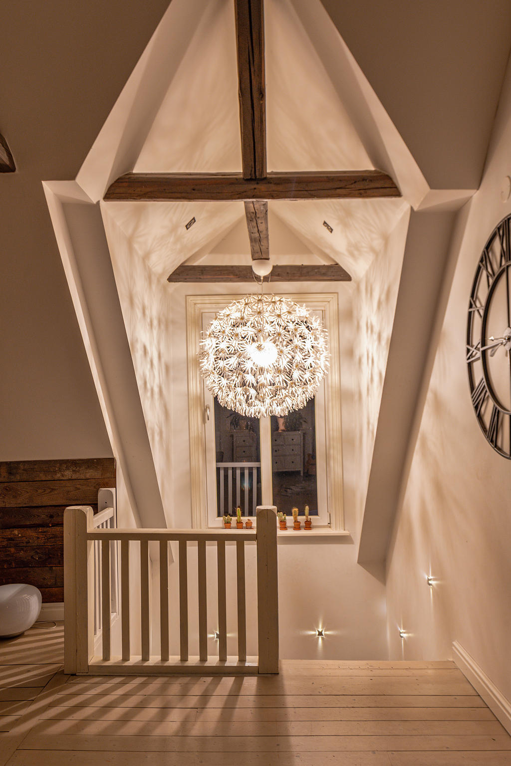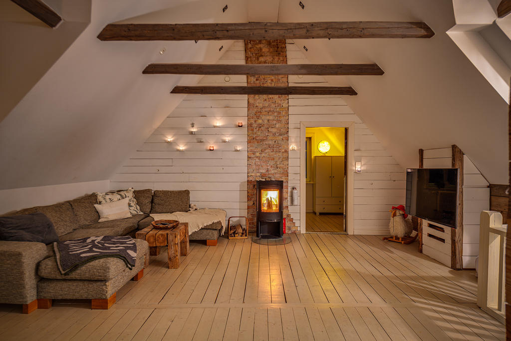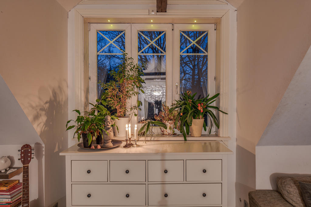 Huset är rikt på karaktär och bjuder på många fina, genomtänkta detaljer. Här samsas ett fantastiskt golv av breda solida träplankor, vackra balkar på övervåningen och naturliga materialval som ger ett genuint, ombonat intryck. Flera kreativa lösningar förstärker husets personlighet, som exempelvis en gammal dörr som fått nytt liv som fönsterbräda. Alla väggar och snedtak har träskiva bakom, vilket inte bara är praktiskt utan också gör det enkelt att inreda och hänga upp sådant som gör ett hus till ett hem.
