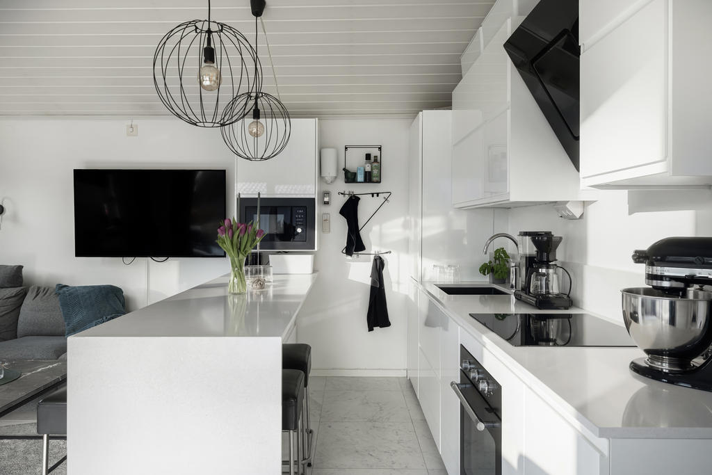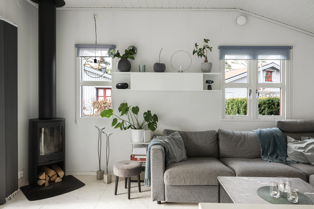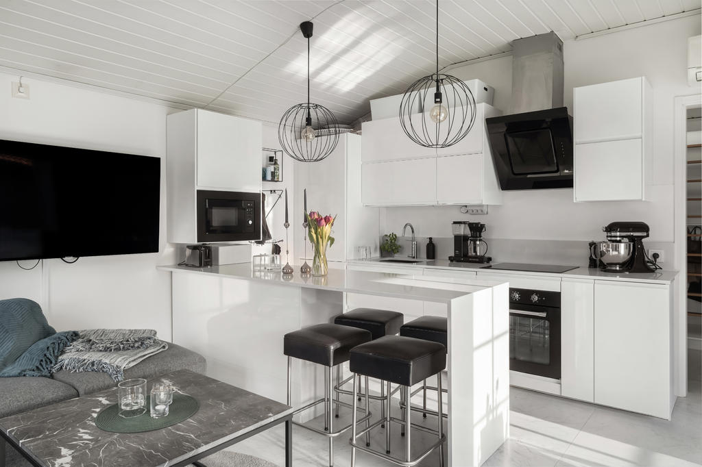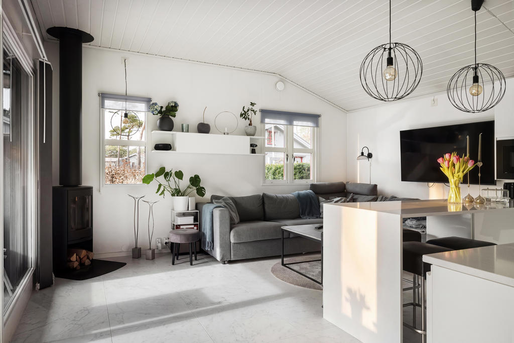 Bostaden är smart planerad i ett plan med sovloft och erbjuder en ljus och social planlösning. Det öppna vardagsrummet och köket i modern design bildar hemmets naturliga samlingspunkt. Köket är stilrent och fullt utrustat med köksö med sittplatser, vilket skapar en inbjudande plats för både matlagning och umgänge. Från vardagsrummet bidrar stora fönster till ett härligt ljusinsläpp och här finns även en kamin som ger både värme och extra trivsel under årets kallare dagar.