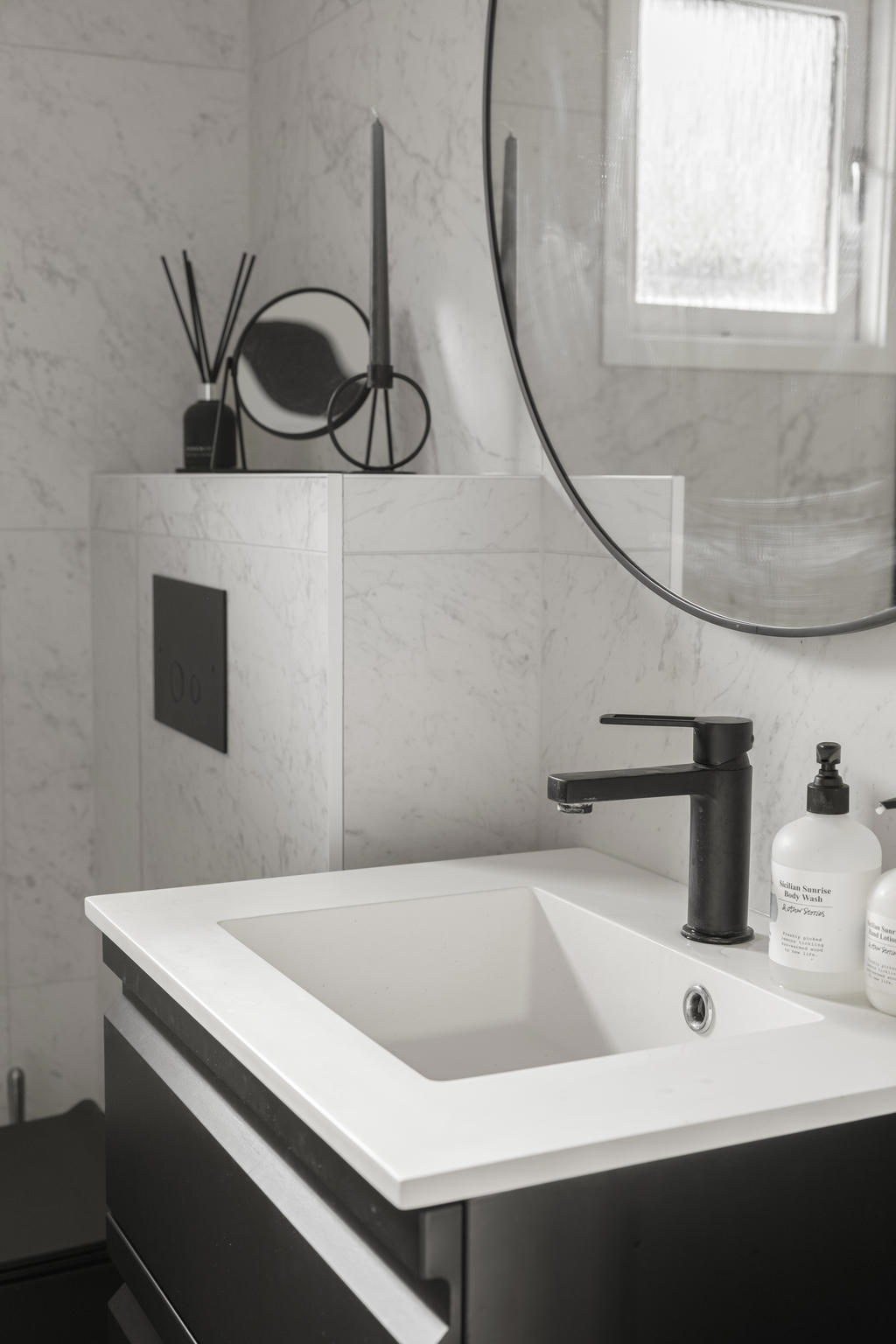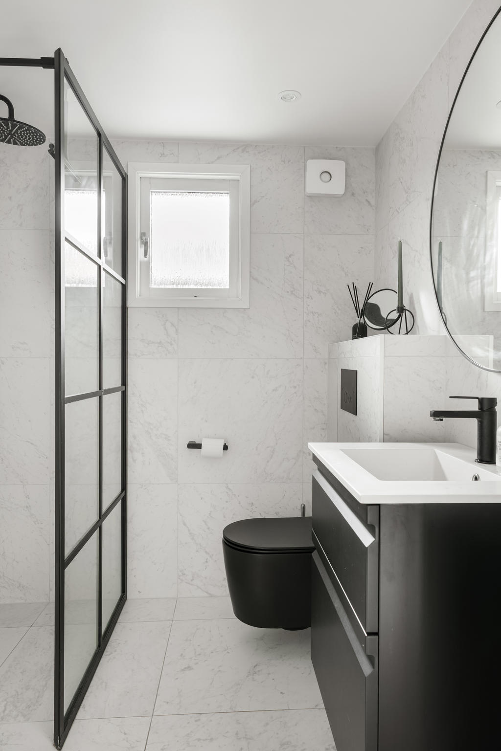 Det helkaklade badrummet, renoverat i modern stil, är smakfullt utformat med stora kakelplattor, dusch med glasväggar samt stilrena detaljer som skapar en exklusiv känsla.