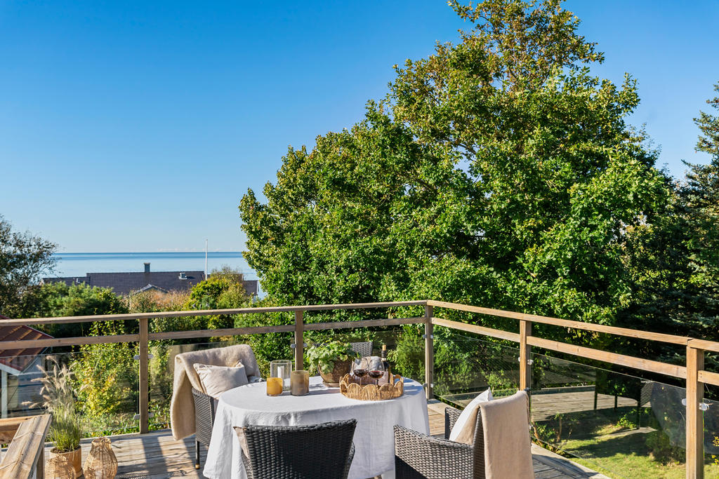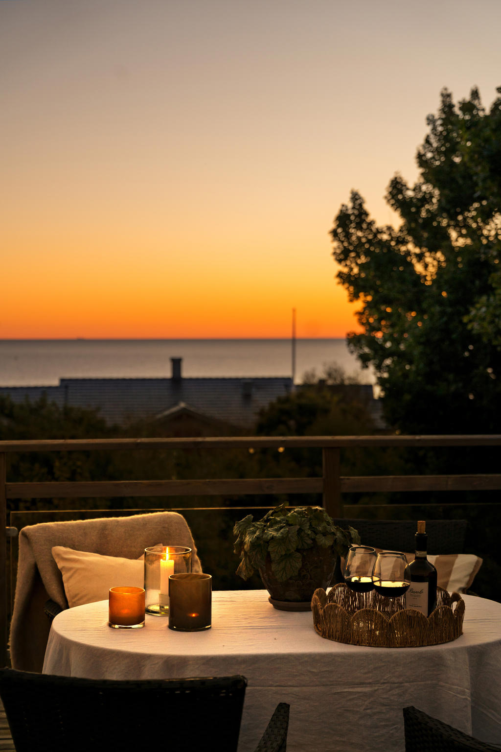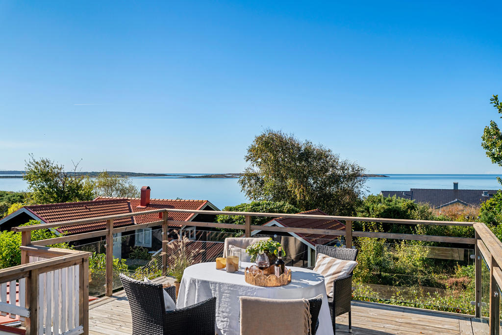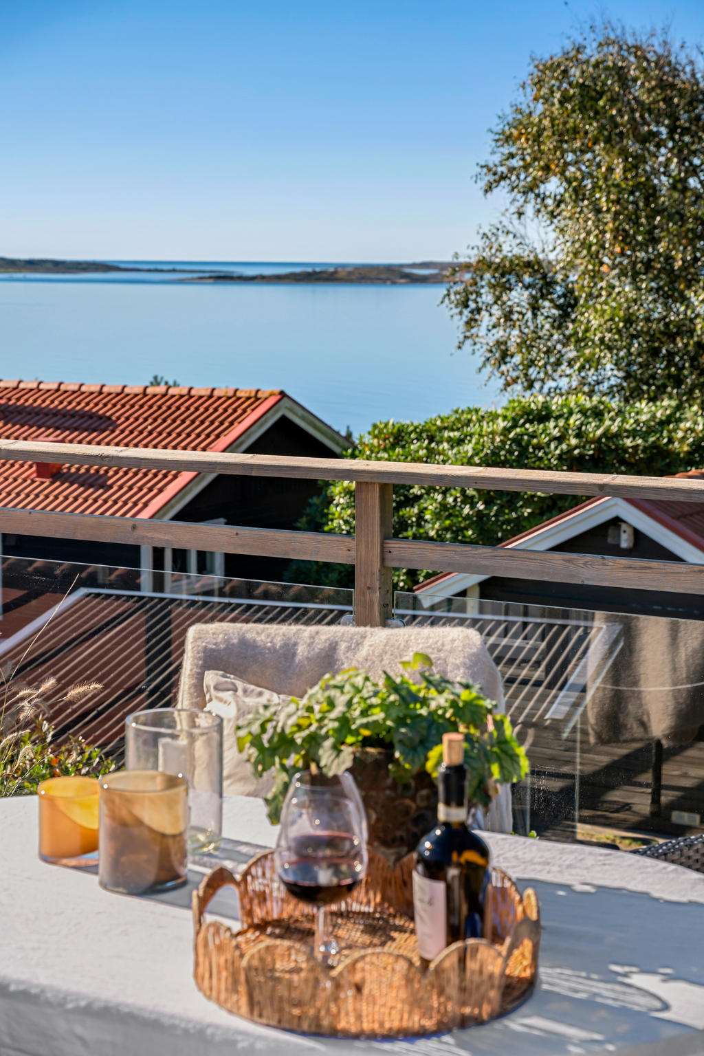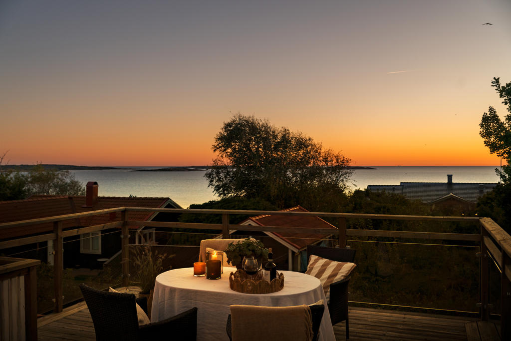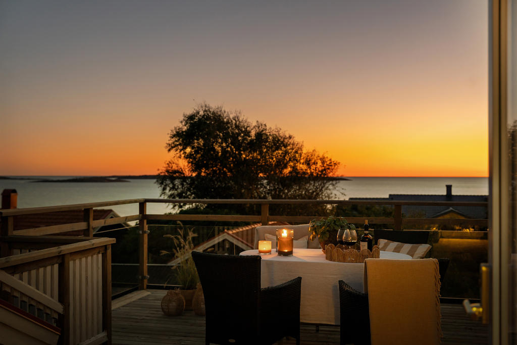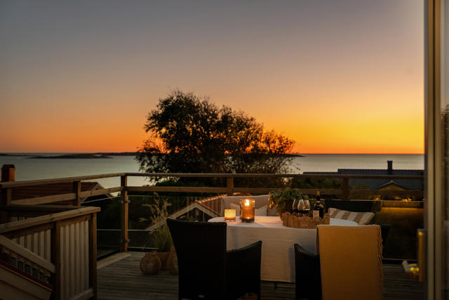 Takterrassens generösa storlek ger möjlighet att möblera med både soffgrupp och matplats. Den otroliga vyn över havet gör att man gärna spenderar långa stunder här både i solen om dagarna och till solnedgångarna om kvällarna.