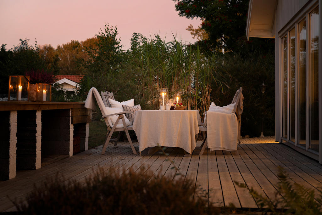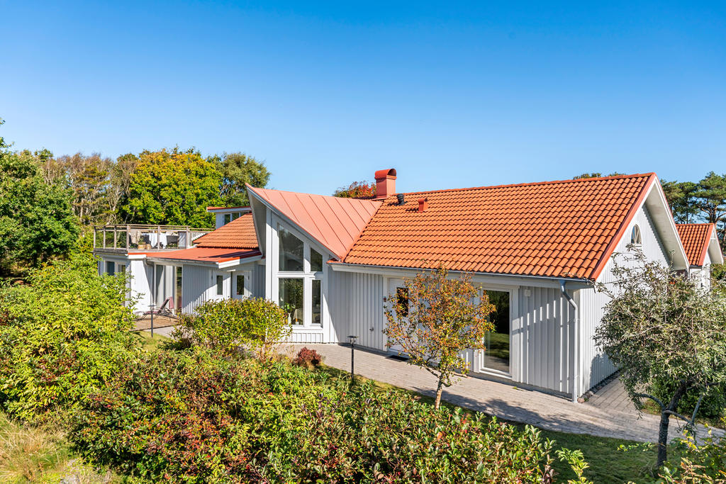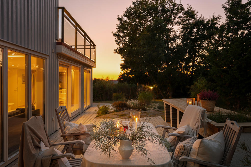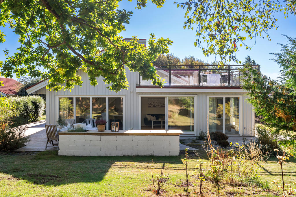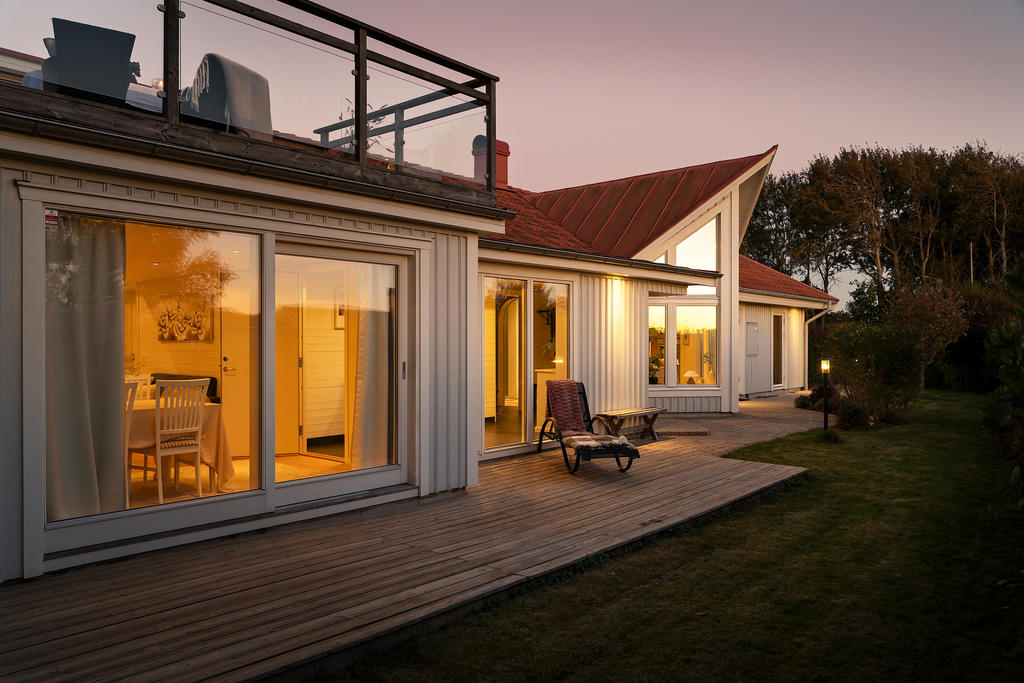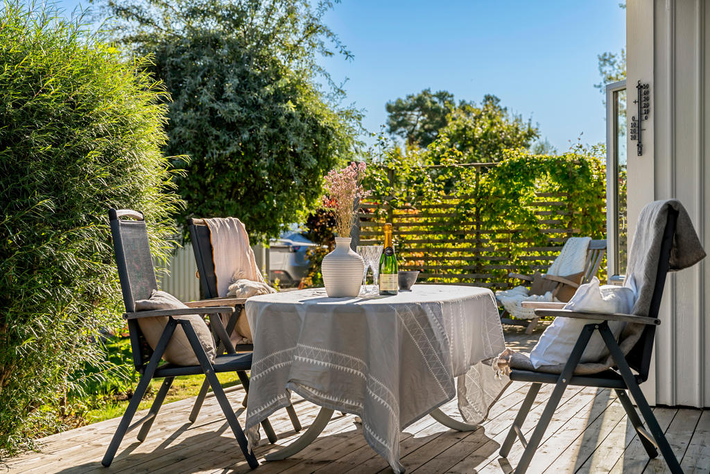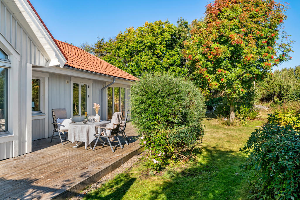 Runt huset finns uteplatser för alla tider på dygnet. Här är det enkelt att följa solens gång och det finns alltid en plats att slå sig ner oavsett om du önskar sol eller skugga. Den stora altanen sträcker sig över tre av husets sidor och har stora ytor för såväl matgrupper som solsängar och loungemöbler. Vid uteplatsen som vetter mot skogen finns en platsbyggd bänk som i kombination med er grill blir ett härligt utekök.