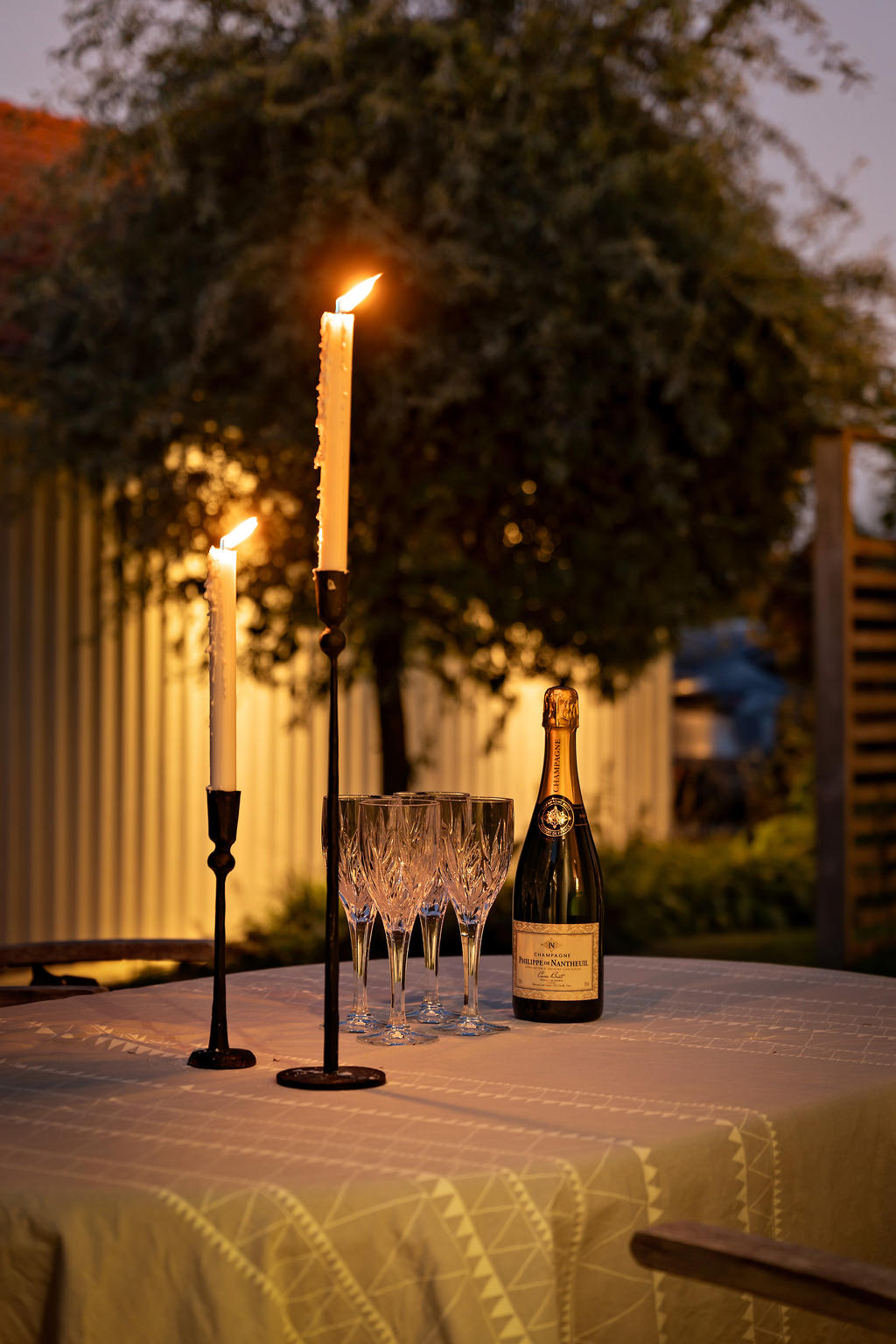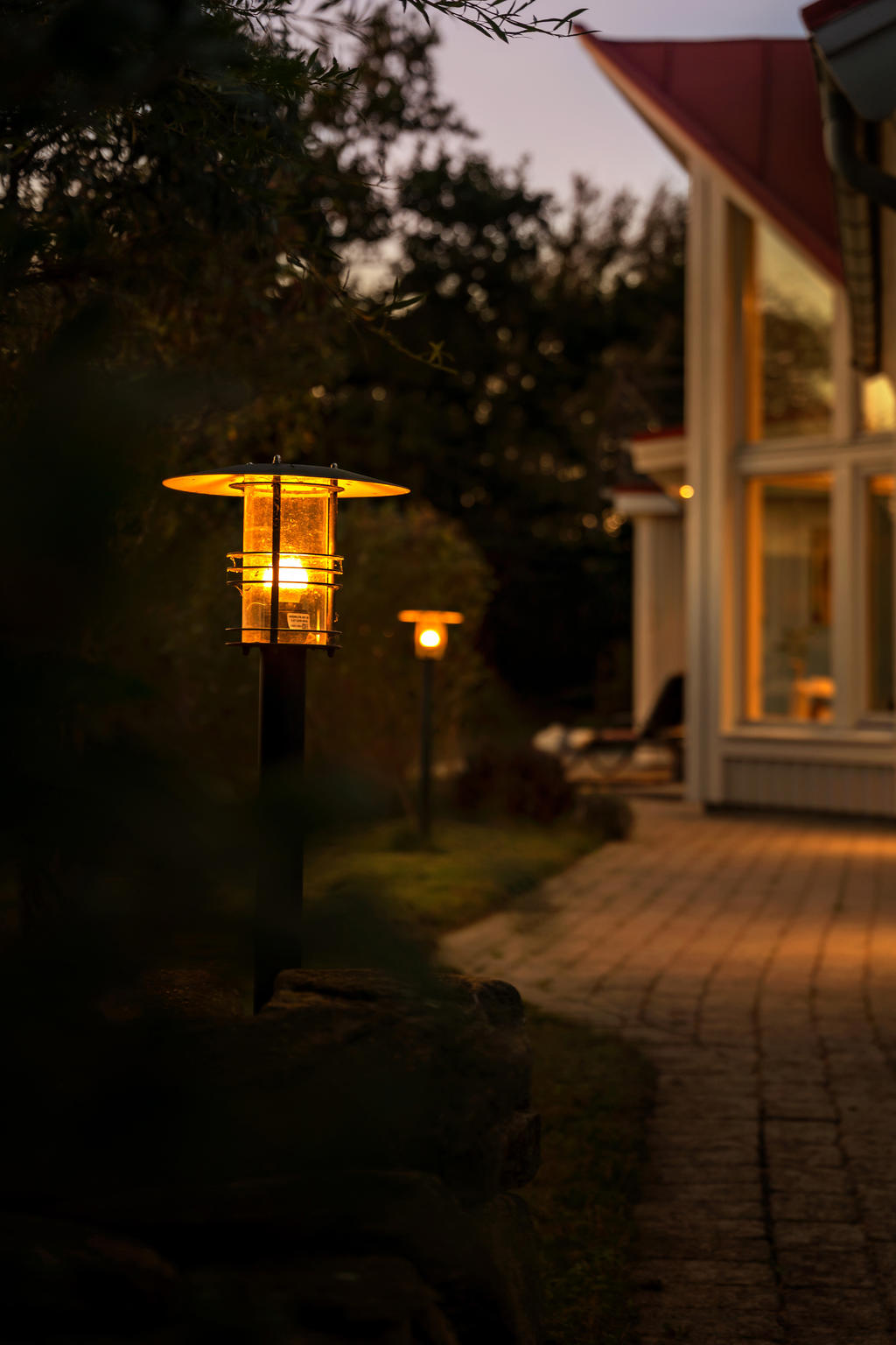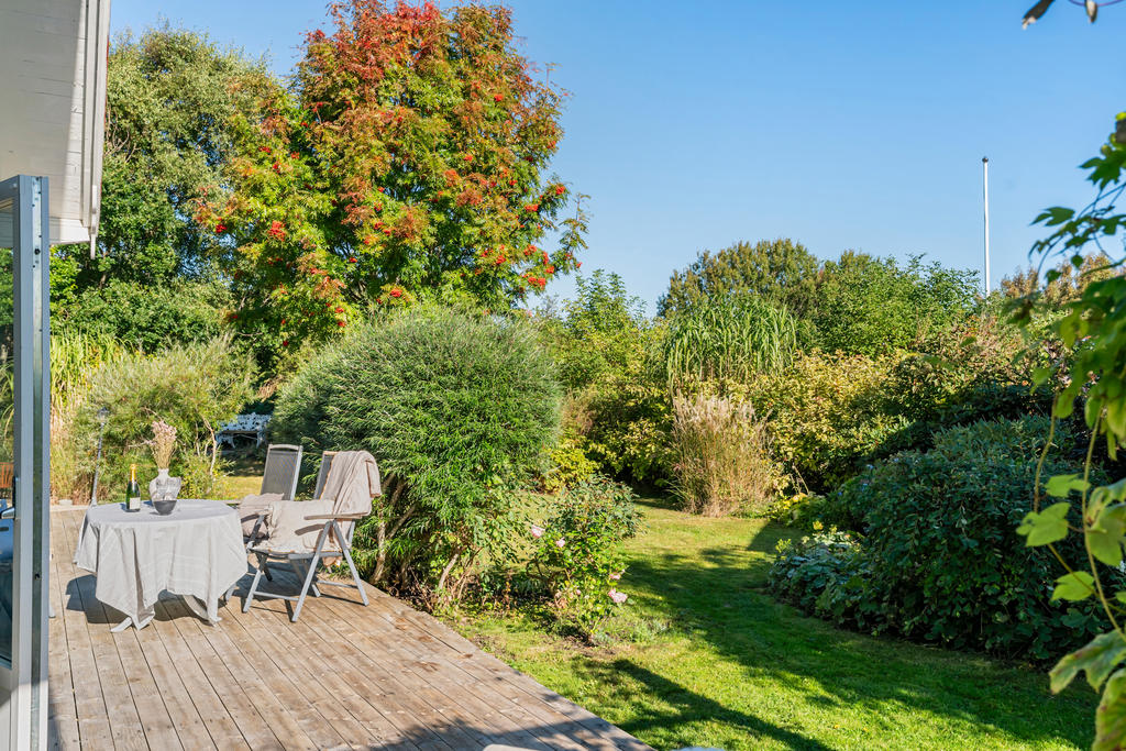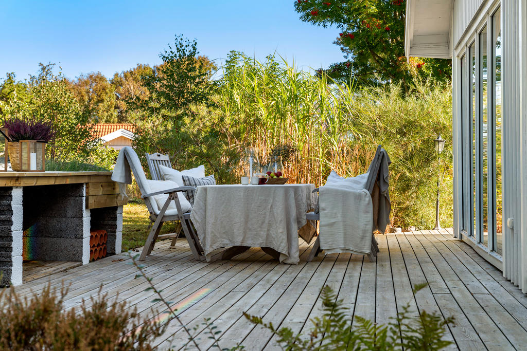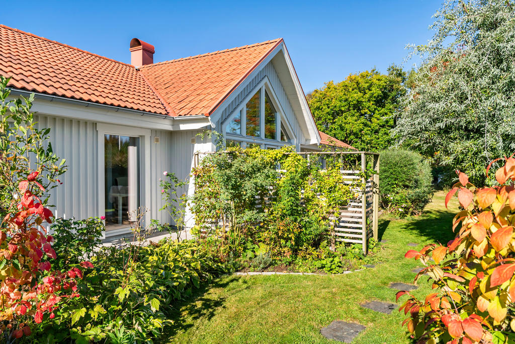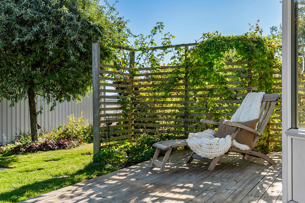 Runt huset finns uteplatser för alla tider på dygnet. Här är det enkelt att följa solens gång och det finns alltid en plats att slå sig ner oavsett om du önskar sol eller skugga. Den stora altanen sträcker sig över tre av husets sidor och har stora ytor för såväl matgrupper som solsängar och loungemöbler. Vid uteplatsen som vetter mot skogen finns en platsbyggd bänk som i kombination med er grill blir ett härligt utekök.