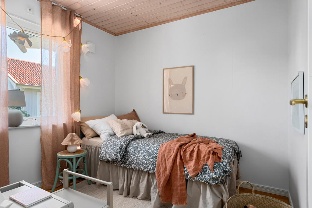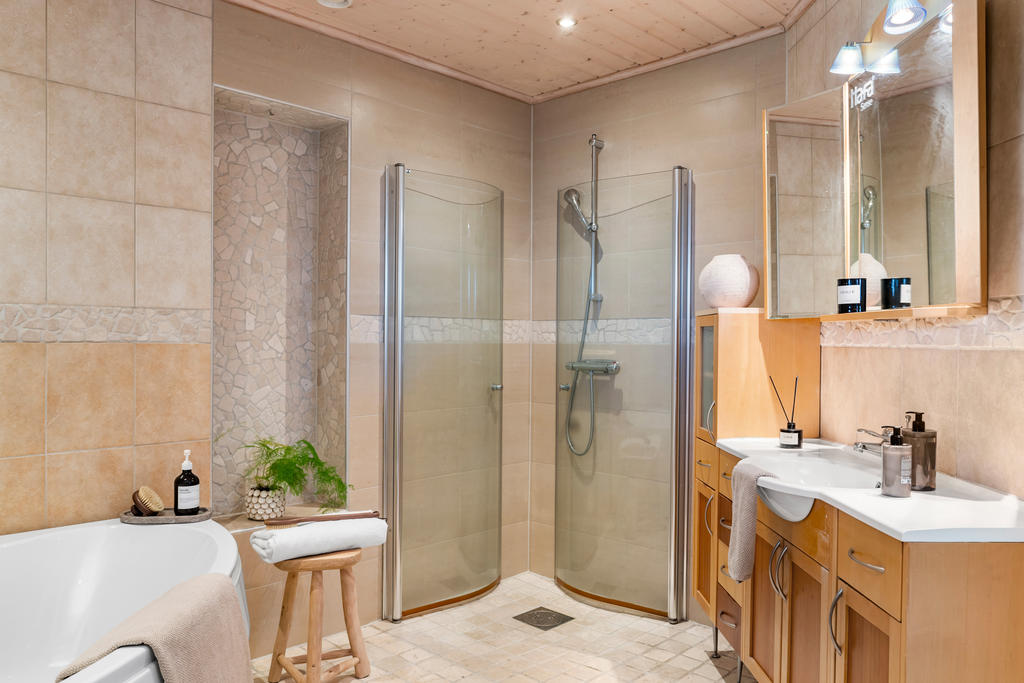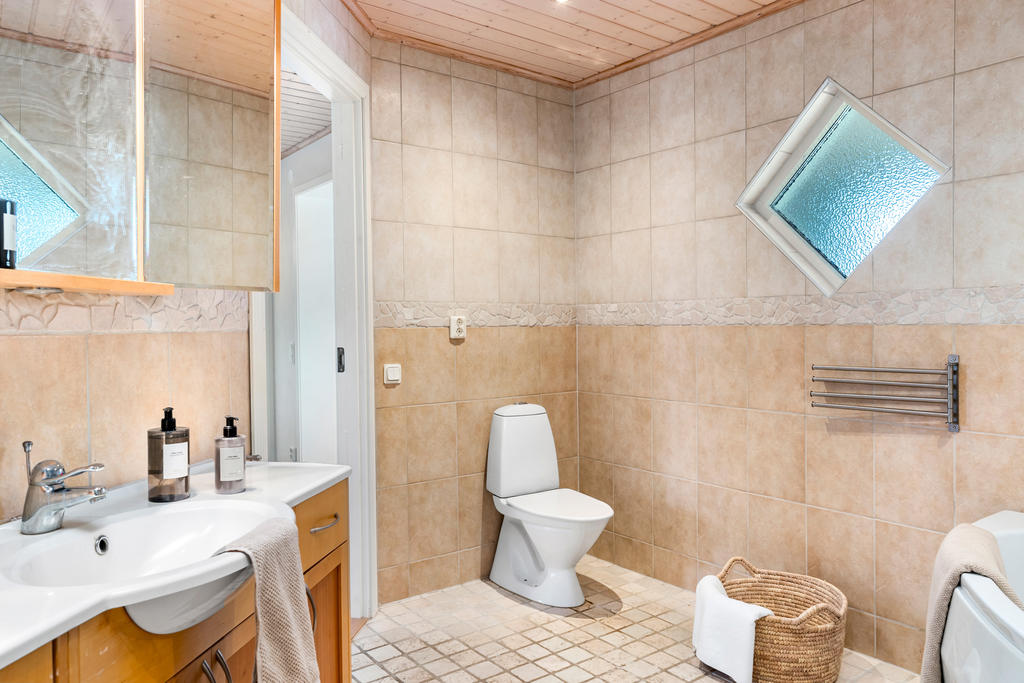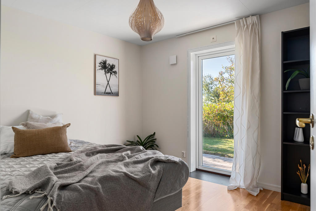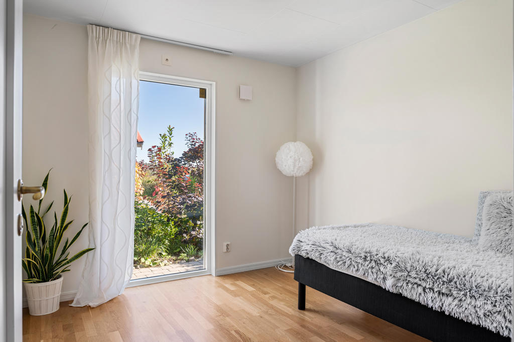 Master bedroom hittar ni intill entréhallen. Detta är ett ovanligt stort rum med tillhörande klädkammare. Trivsamt finns altandörr i helglas som möjliggör att ni enkelt kan öppna upp och släppa in den friska utomhusluften. I anslutning till sovrummet finns ytterligare ett sovrum som i dagsläget är inrett som barnrum, detta skulle även kunna bli ett perfekt arbetsrum. Från entréhallen når ni även två helkaklade badrum. Det större badrummet har en lugn beige färgsättning, är väl tilltaget och inrett med både dusch och hörnbadkar. Här finns gott om förvaringsmöjligheter i skåp och kommod. Även det tredje badrummet är inrett med dusch, handfat och wc.