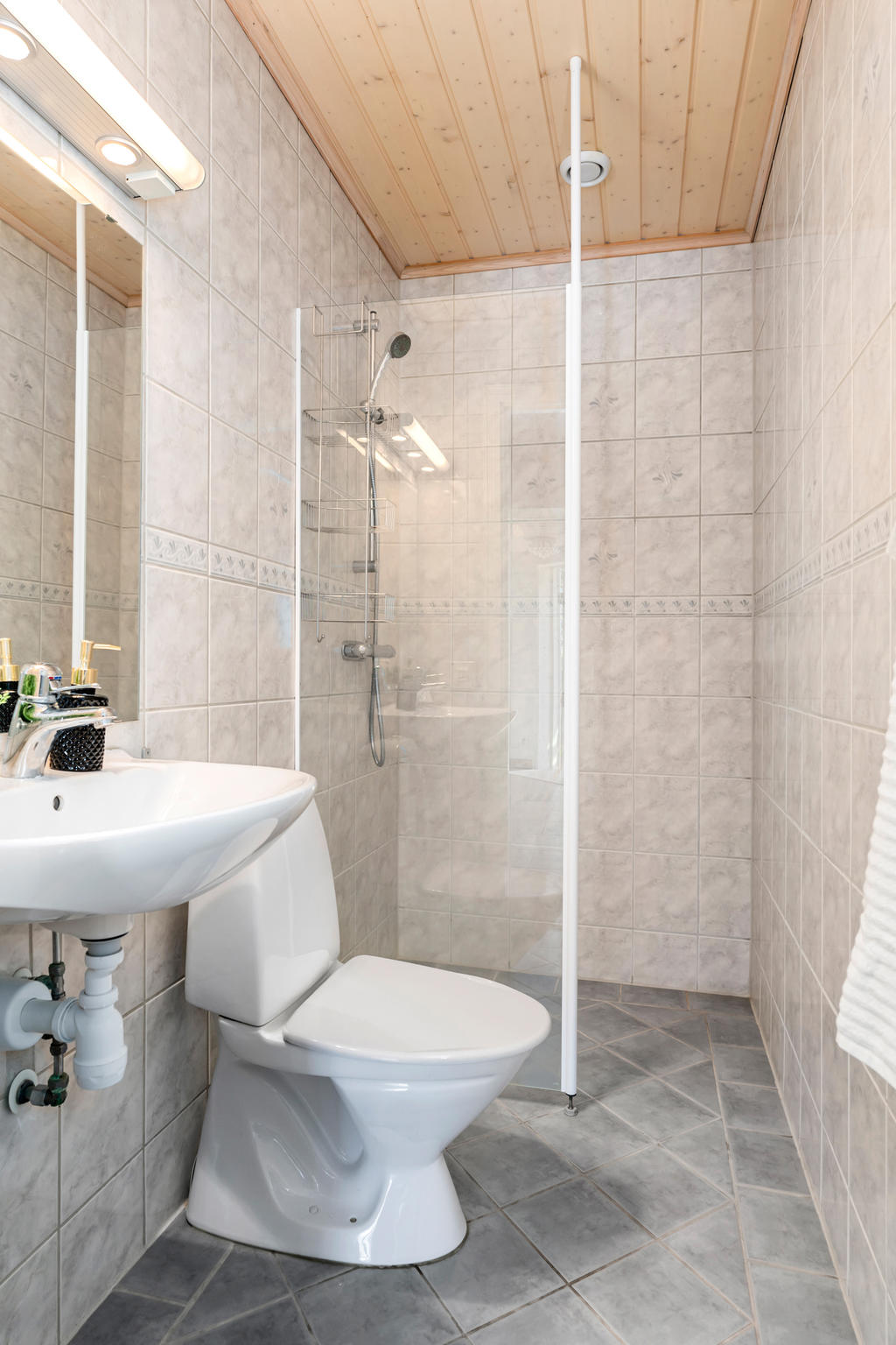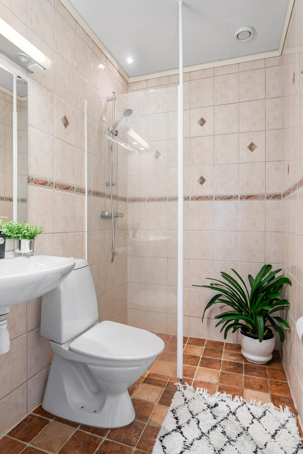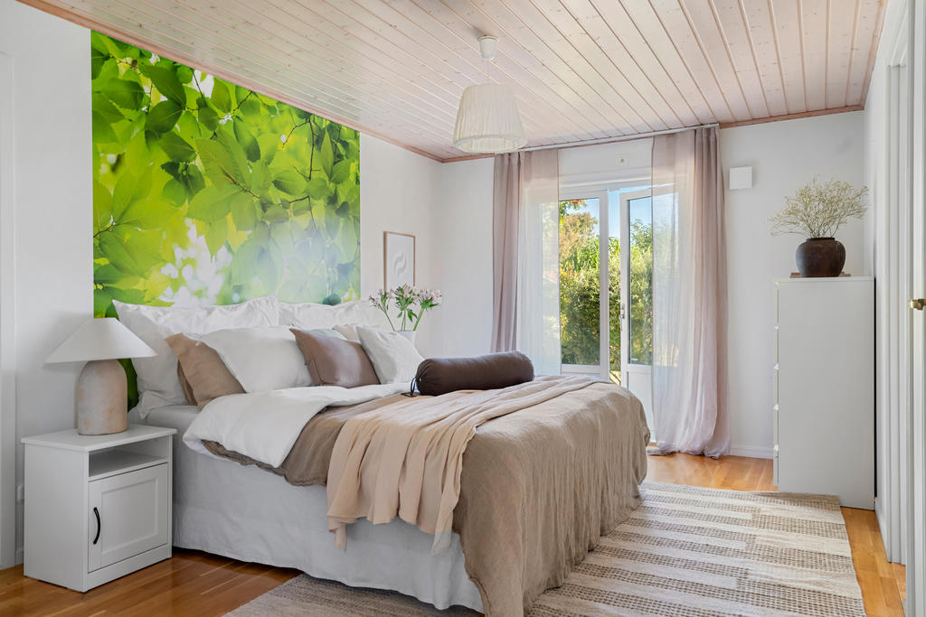 Master bedroom hittar ni intill entréhallen. Detta är ett ovanligt stort rum med tillhörande klädkammare. Trivsamt finns altandörr i helglas som möjliggör att ni enkelt kan öppna upp och släppa in den friska utomhusluften. I anslutning till sovrummet finns ytterligare ett sovrum som i dagsläget är inrett som barnrum, detta skulle även kunna bli ett perfekt arbetsrum. Från entréhallen når ni även två helkaklade badrum. Det större badrummet har en lugn beige färgsättning, är väl tilltaget och inrett med både dusch och hörnbadkar. Här finns gott om förvaringsmöjligheter i skåp och kommod. Även det tredje badrummet är inrett med dusch, handfat och wc.