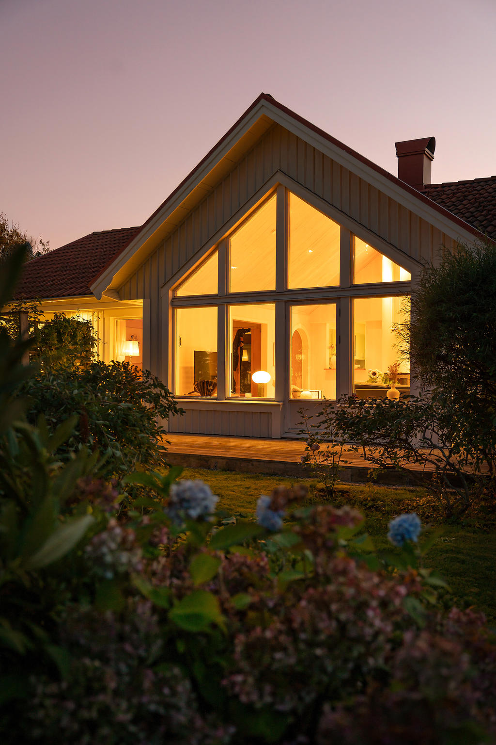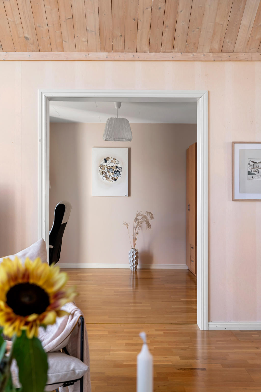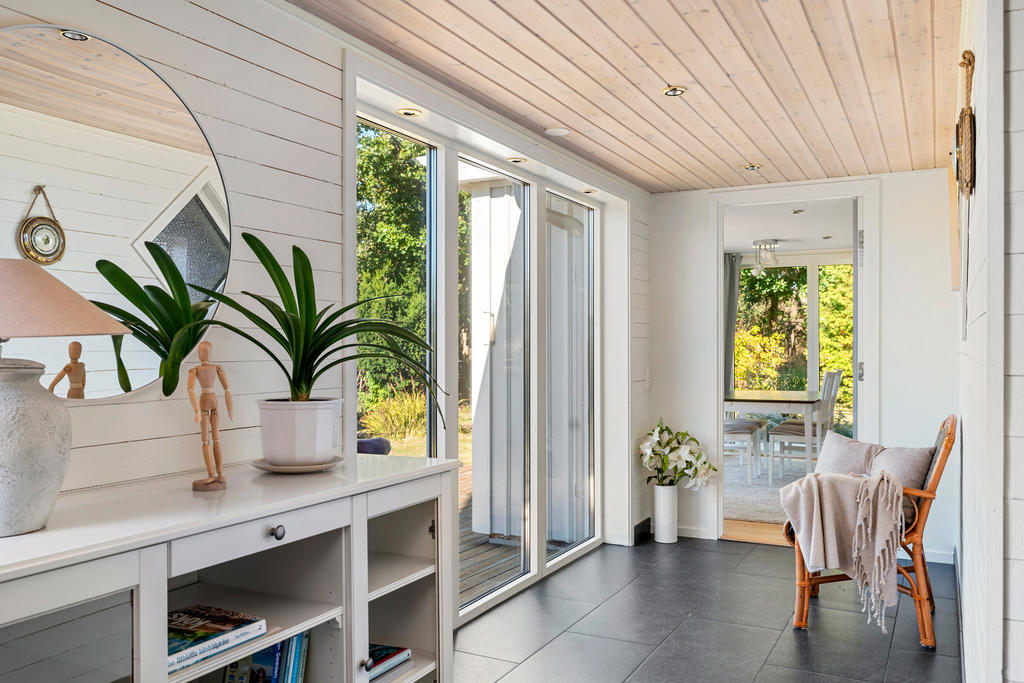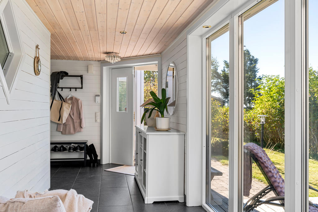 När ni kliver in i huset och möts ni direkt av en ljus och välkomnande hall med praktiskt klinkergolv, goda avhängningsmöjligheter och en stor skjutdörrsgarderob med spegeldörrar. Ljusinsläppet genomsyrar hela bostaden tack vare det höga och fria läget tillsammans med stora och höga fönsterpartier, skjutdörrspartier och altandörrar helt i glas.
