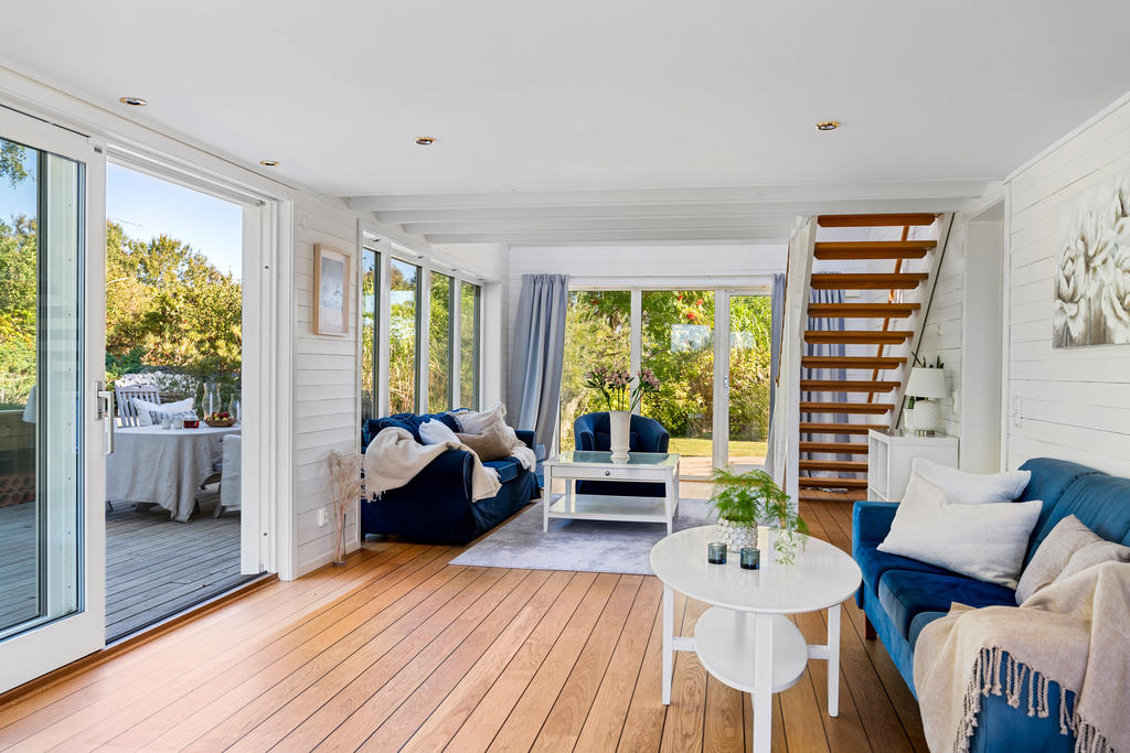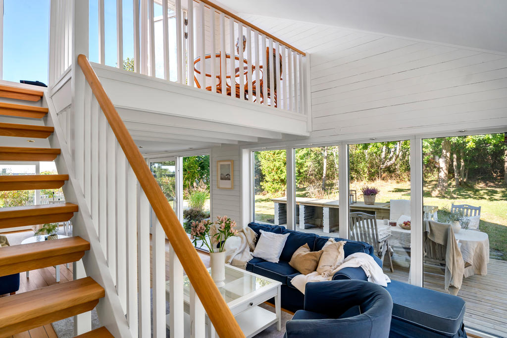 I den bortre delen av huset som vetter mot skogen finns det generöst tilltagna allrummet som bjuder in till både vardag och fest. Här flödar ljuset in genom stora fönster och skjutdörrspartier som suddar ut gränsen mellan inne och ute. Rummet är perfekt för långa middagar, livliga nyårsfester eller stämningsfulla julaftnar – här får både släkt och vänner plats. Vidare leds ni upp för trappan till en mysig hörna med plats för ett par fotöljer där ni skönt kan slå er ner för en stunds läsning eller med en kikare i högsta hugg för att beskåda havslivet eller stjärnhimmlen. Härifrån når ni den fantastiska takterassen.
