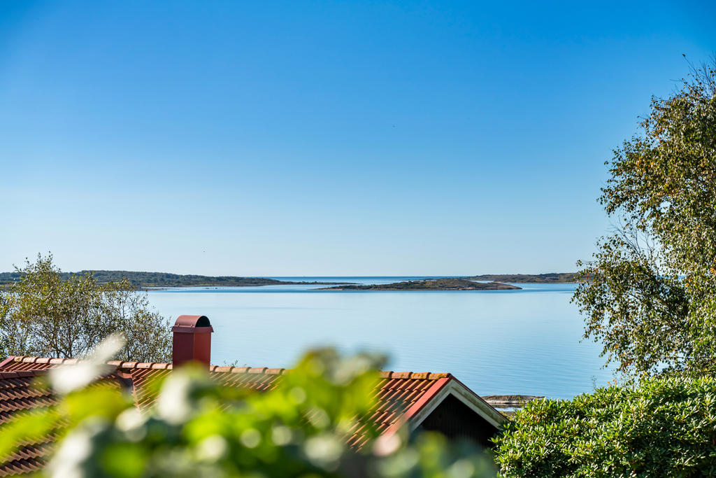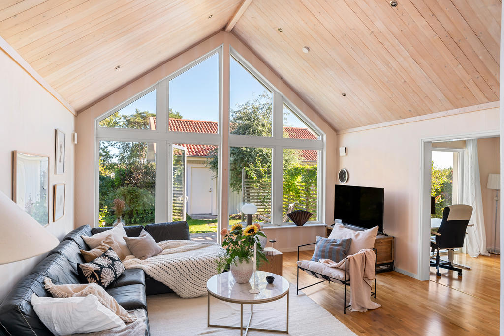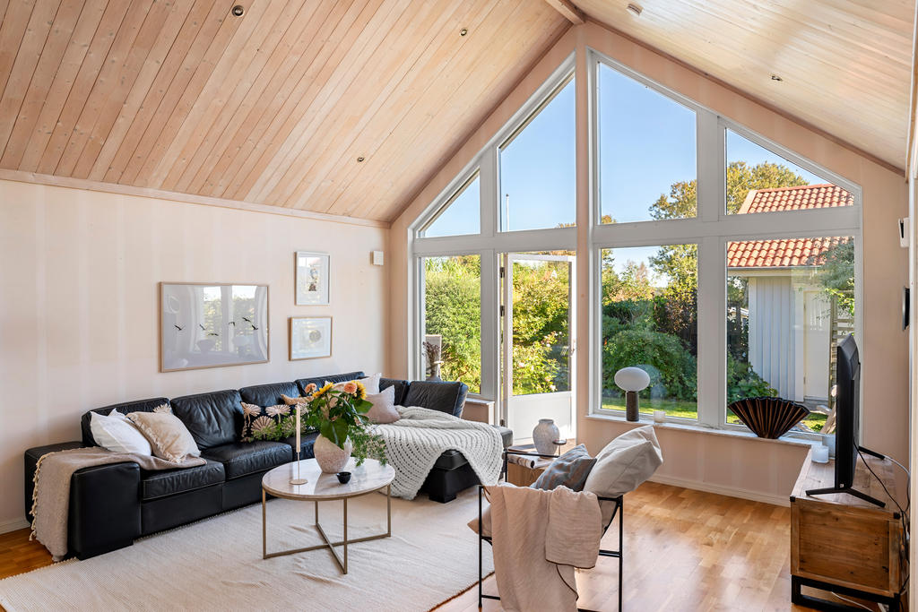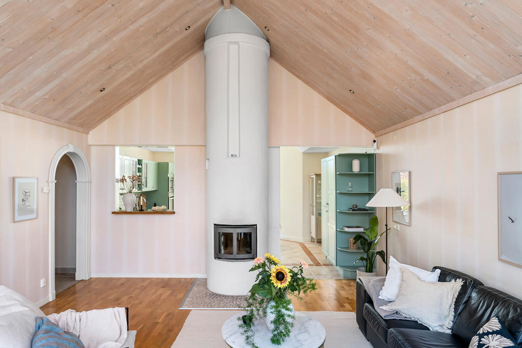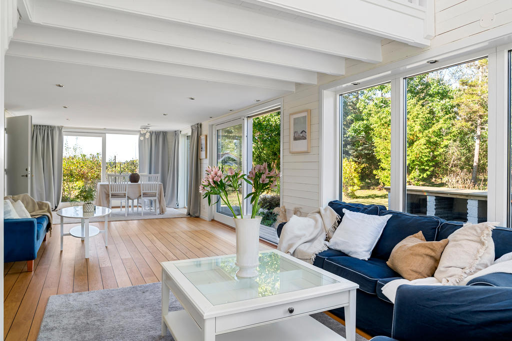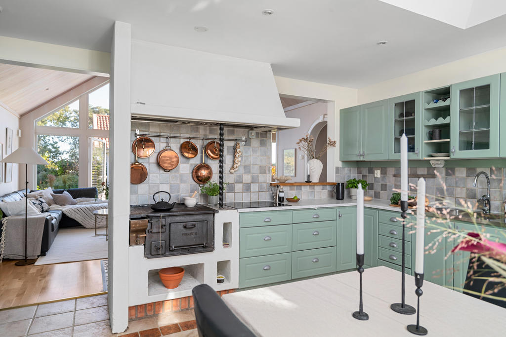 Vidare in i huset når ni det ombonade köket som i delvis öppen planlösning vetter mot vardagsrummet. Den generösa takhöjden i rummen ger en härlig atmosfär. Köket i lantlig stil har en naturlig plats för större matbord invid fönsterpartiet med fönster från golv till tak. Härifrån kan ni glimta ut mot havets horisont. Köksluckorna har en behaglig dimgrön färgsättning och köket är inrett med spis, en otroligt vacker vedspis, kyl, frys, fläkt och diskmaskin - allt smakfullt integrerat. Vardagsrummet har samma rymliga takhöjd och hänförande fönsterparti som köket och dessutom en altandörr i glas som leder ut till den väl tilltagna altanen som löper runt större delen av huset. Vardagsrummet stoltserar med en putsad braskamin som bidrar med både värme och mysfaktor under de kallare årstiderna. Det är lätt att se rummet bli en naturlig samlingsplats under höst- och vinterkvällarna när elden sprakar i kaminen.
