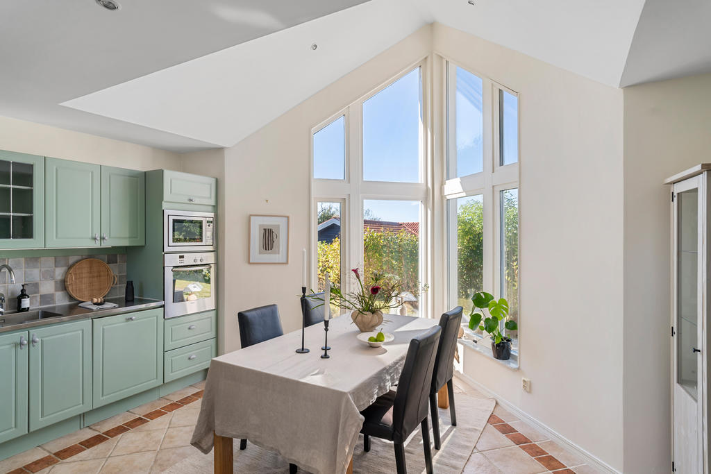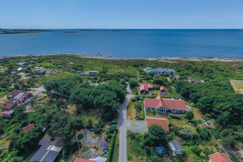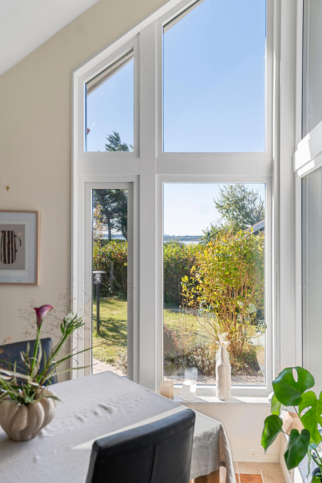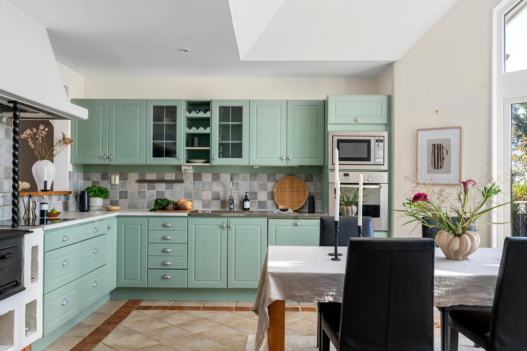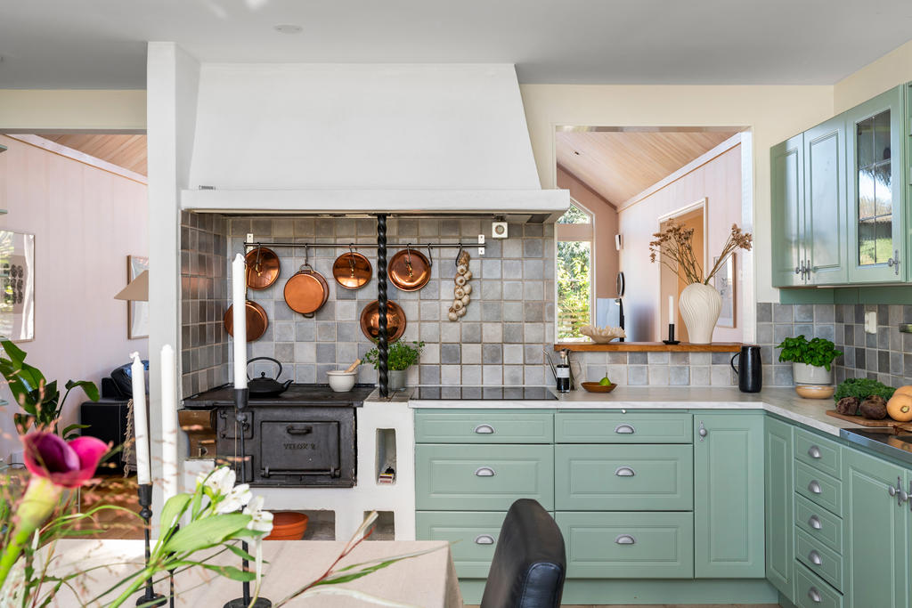 Vidare in i huset når ni det ombonade köket som i delvis öppen planlösning vetter mot vardagsrummet. Den generösa takhöjden i rummen ger en härlig atmosfär. Köket i lantlig stil har en naturlig plats för större matbord invid fönsterpartiet med fönster från golv till tak. Härifrån kan ni glimta ut mot havets horisont. Köksluckorna har en behaglig dimgrön färgsättning och köket är inrett med spis, en otroligt vacker vedspis, kyl, frys, fläkt och diskmaskin - allt smakfullt integrerat. Vardagsrummet har samma rymliga takhöjd och hänförande fönsterparti som köket och dessutom en altandörr i glas som leder ut till den väl tilltagna altanen som löper runt större delen av huset. Vardagsrummet stoltserar med en putsad braskamin som bidrar med både värme och mysfaktor under de kallare årstiderna. Det är lätt att se rummet bli en naturlig samlingsplats under höst- och vinterkvällarna när elden sprakar i kaminen.