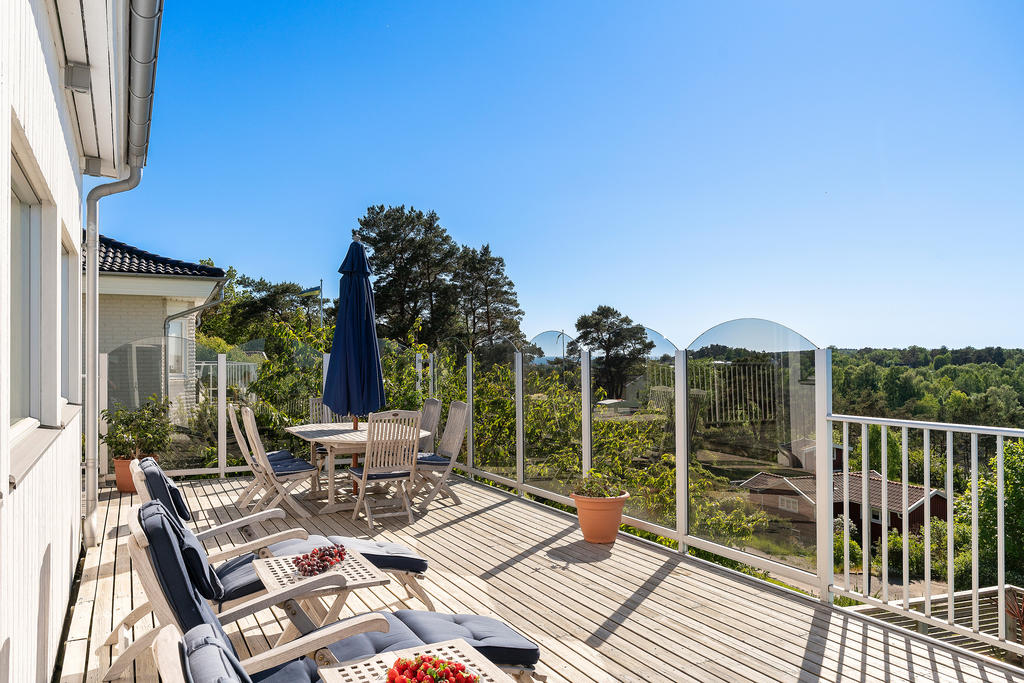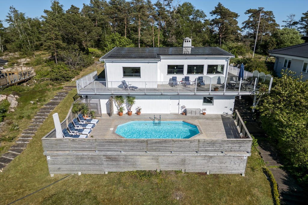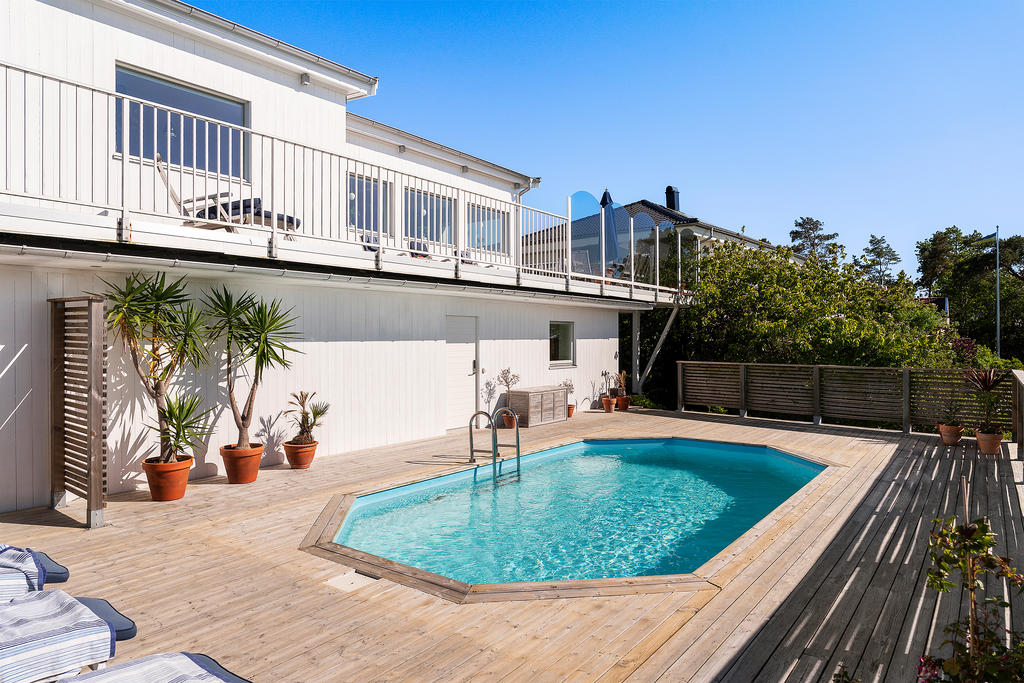 Tomten är planerad för minimalt underhåll och maximal njutning. Altaner i flera nivåer, privat pool och generösa ytor för utemöblering skapar en atmosfär som för tankarna till varmare breddgrader. Det höga läget ger både insynsskydd och en svårslagen utsikt.