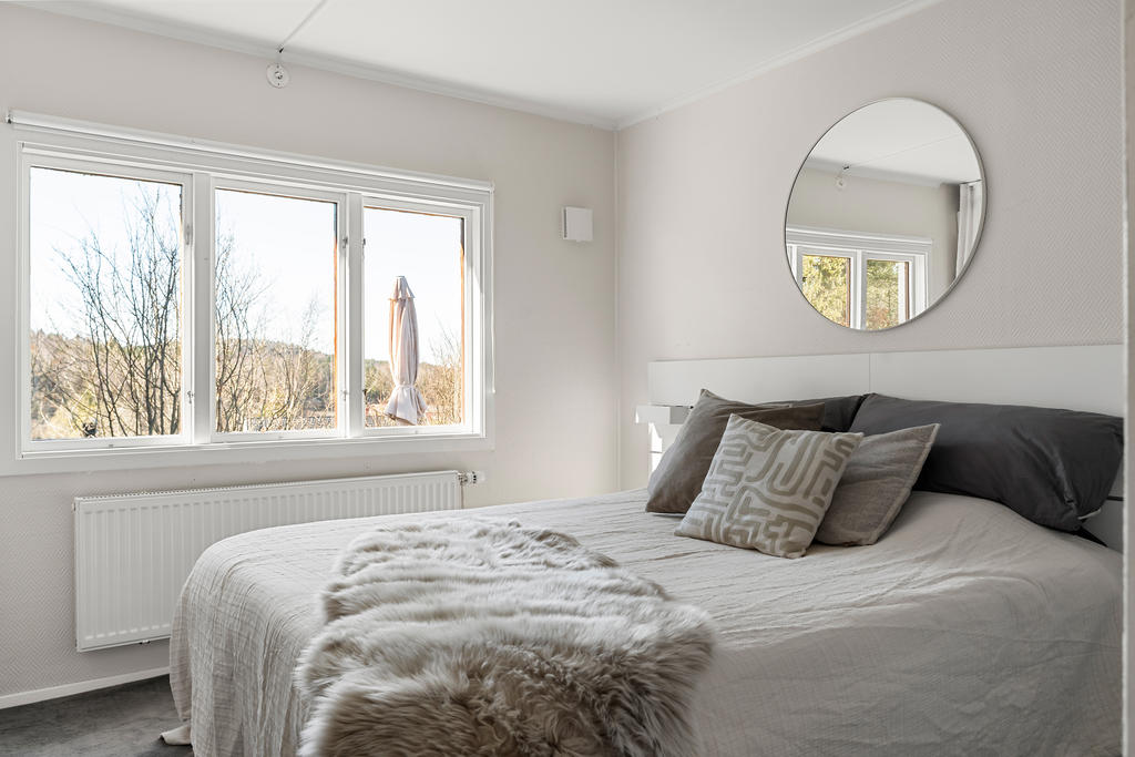 Huset sovrum har gott om plats för dubbelsäng och här finns även garderober som ger goda förvaringsmöjligheter. Du finner även ett förråd som du når via vardagsrummet samt en klädkammare i anslutning till hallen. Huset har en välgenomtänkt planlösning som maximerar både funktion och trivsel.