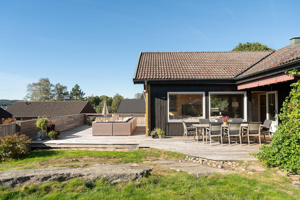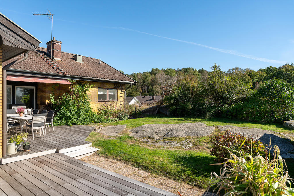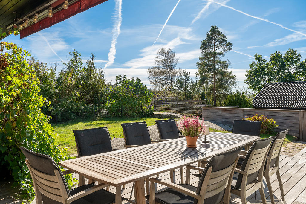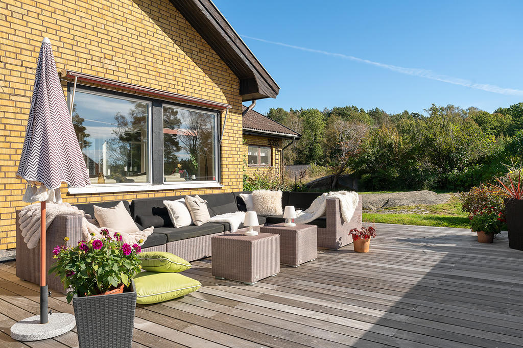 Trädgården är lummigt insynsskyddad samtidigt som ni har fria vyer över områdets takåsar tack vare det höga läget. Här finns en stor altan i påkostad brasiliansk valnöt som ger utrymme för både matgrupp, soffa och solsängar. Trädgården erbjuder både gräsmatta och vackra berg i dagen, en perfekt kombination som ger en lättskött utemiljö och gott om plats för både lek och avkoppling. Här kan barnen springa fritt medan de vuxna njuter av lugnet och avskildheten.