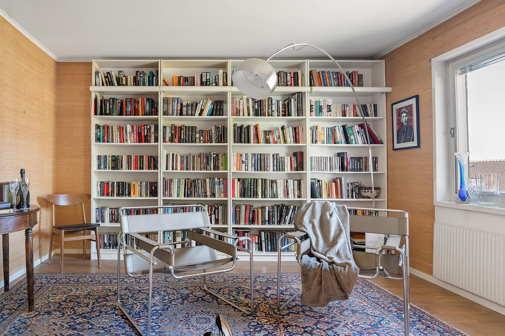 Här finns ett vardagsrum med gott om plats för såväl soffa, tv-möbel och fåtöljer men som också har plats för middagsbord för riktigt stora sällskap. Här kan man enkelt skapa långbord för släkt och vänner. Intill matplatsen finns ett biblioteksrum, eller ytterligare sällskapsrum, ett mycket uppskattat rum för nuvarande ägare.