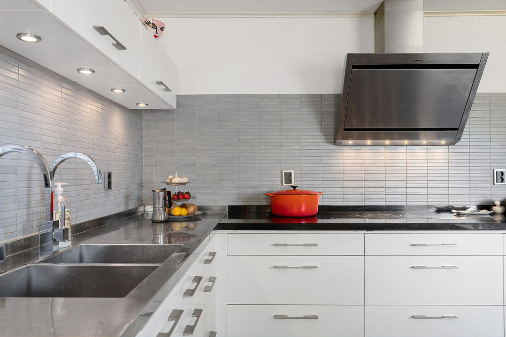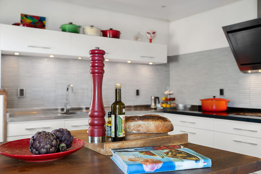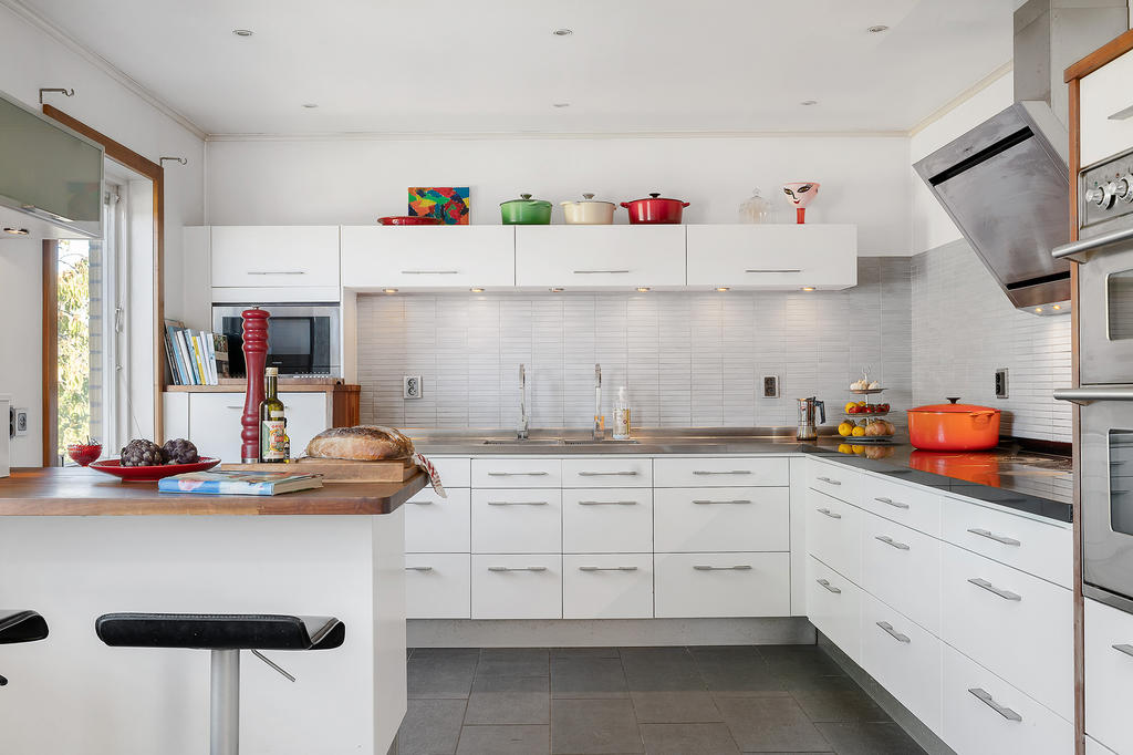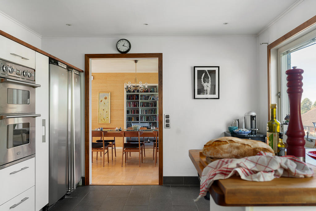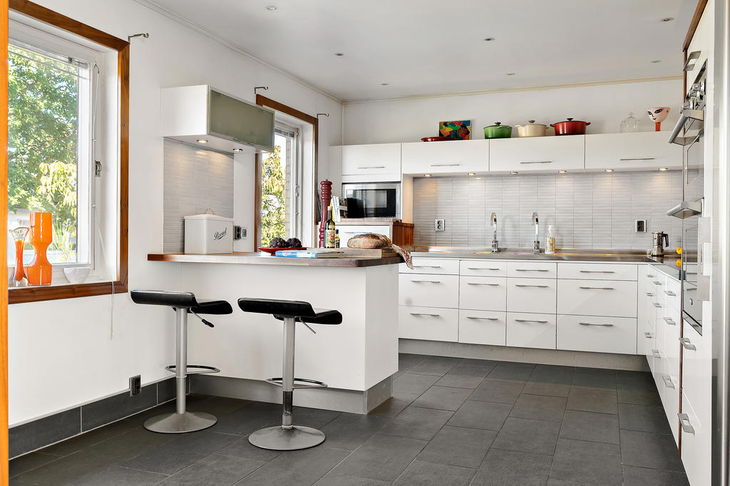 I anslutning till matplatsen finns också det moderna köket som är fullutrustat med all maskinell utrustning som kan önskas tillsammans med de generösa bänkytorna och köksön som alltid blir en central plats att samlas när familjen umgås runt matlagningen.