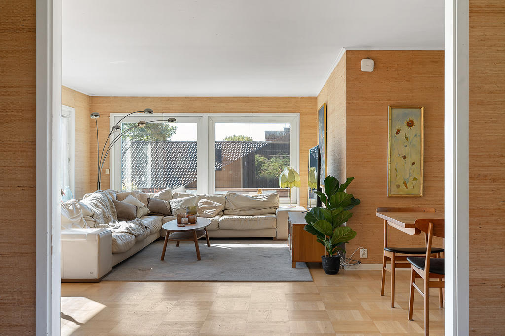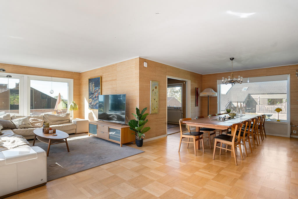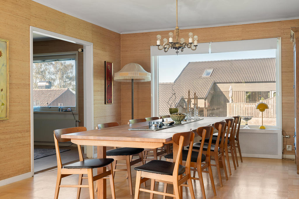 En trappa upp är de luftiga och ljusa sällskapsytorna slående. Få hus erbjuder sådana ytor för umgänge som detta hus!