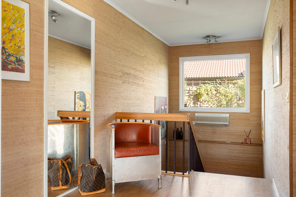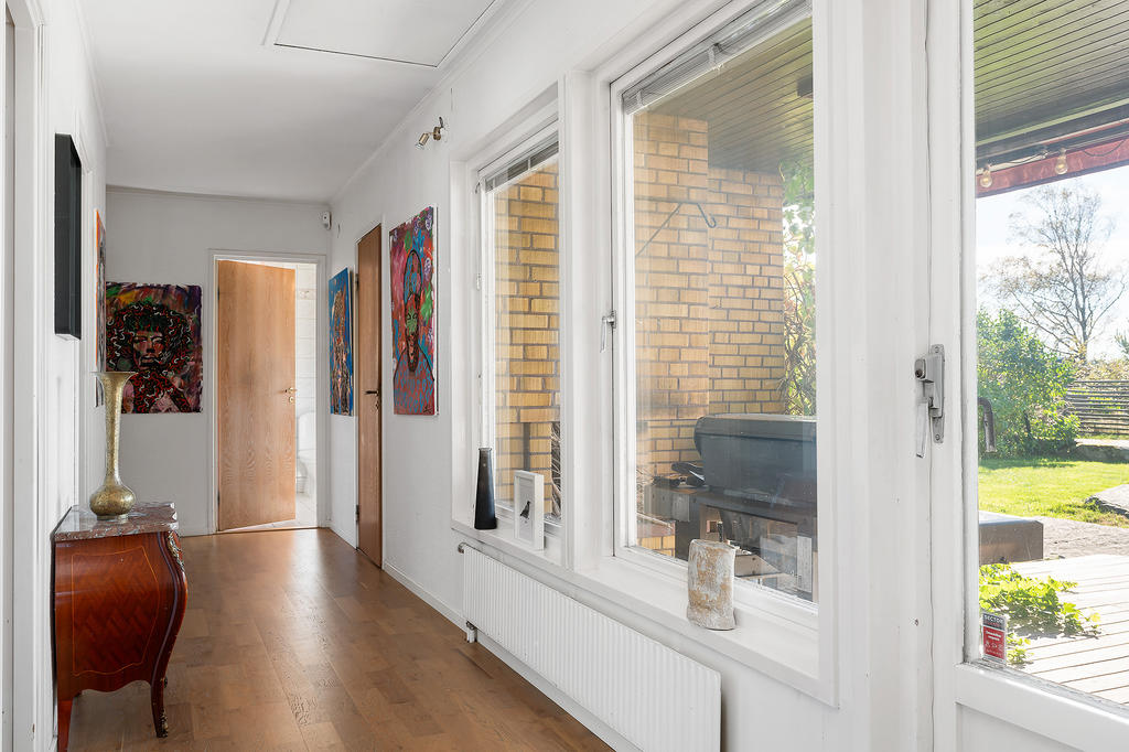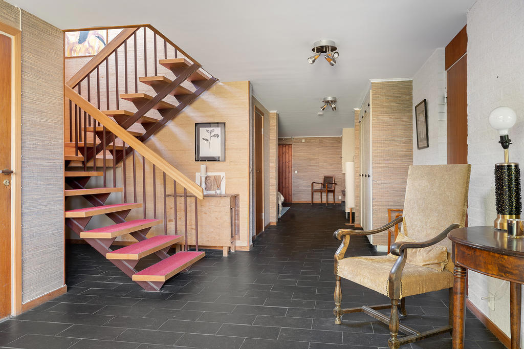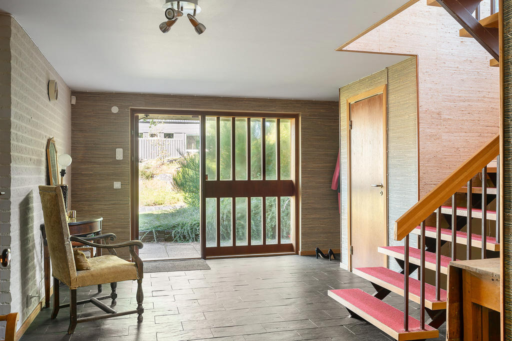 Redan vid första steget in i huset möts ni de generösa ytorna när ni kliver in i den väl tilltagna och mycket välkomnande entréhallen. Här finns gott om plats för avhängning av ytterkläder och skor både i öppen förvaring och i den praktiska klädkammaren som ger utrymme till hela familjens alla ytterkläder. In i hallen flödar dagsljuset genom de många sidoljusen som är typiska för 70-talets arkitektur bredvid den ståtliga dörren i trä.