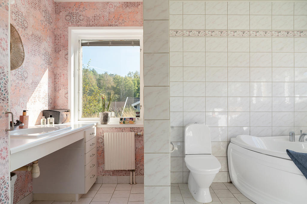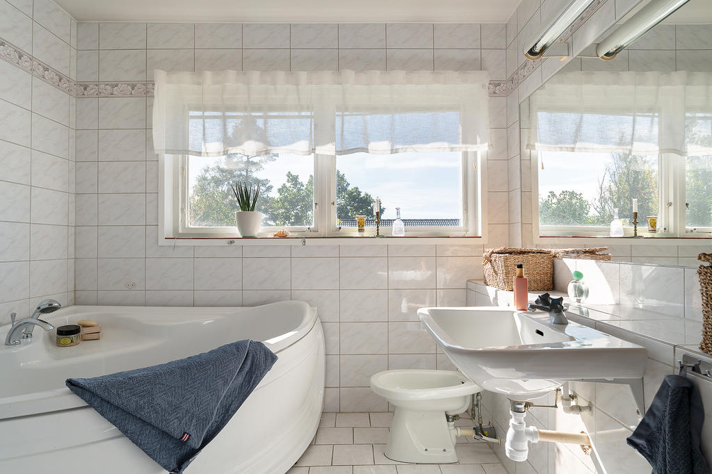 Privat beläget i husets ena del ligger fyra rymliga sovrum och två helkaklade badrum. Det ena badrummet renoverades 2017 och har sobert beige och brun färgsättning. Detta badrum är utrustat med duschhörna, wc och handfat. Det andra badrummet är i äldre utförande och har hörnbadkar, handfat, wc och en separat "sminkhörna".
