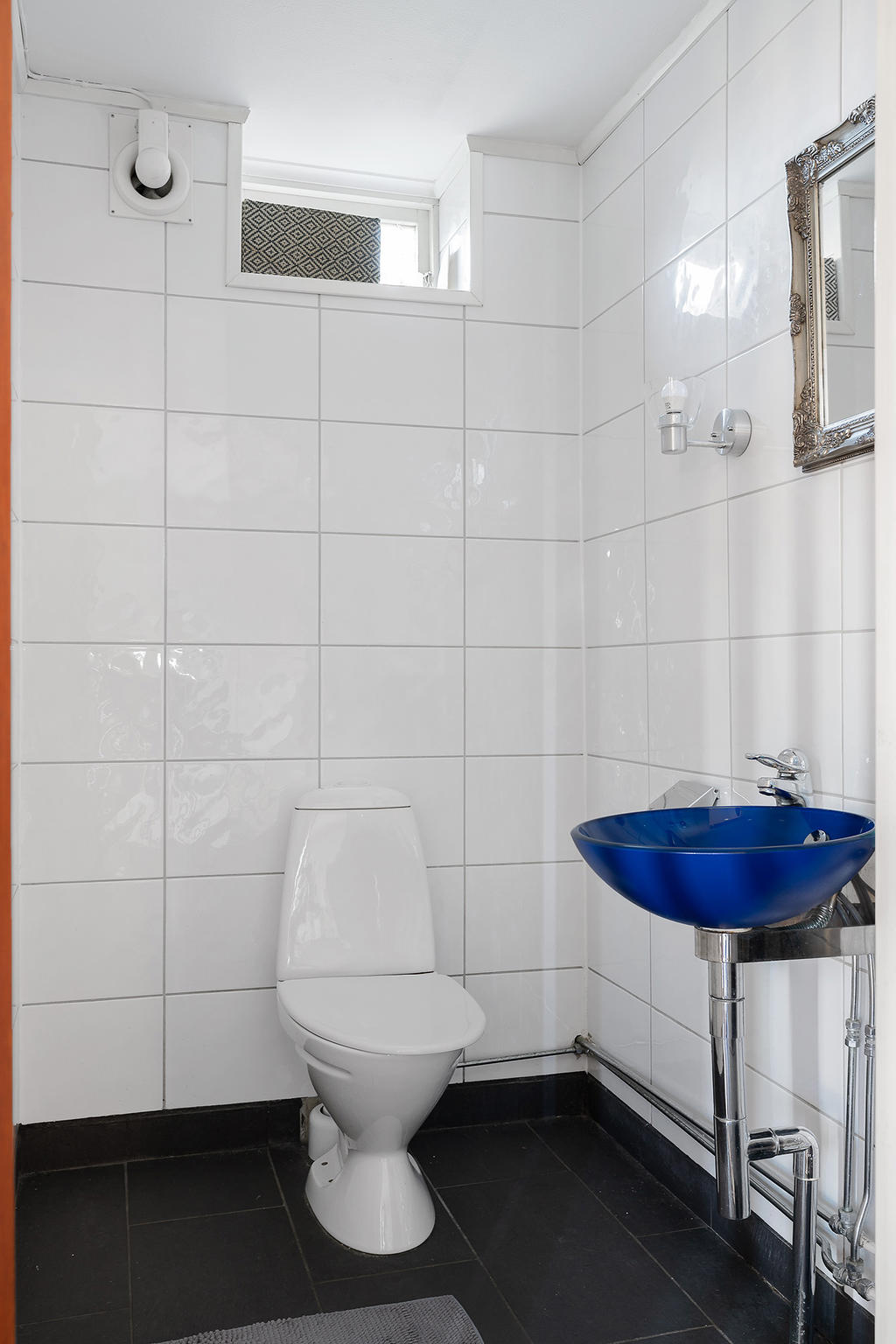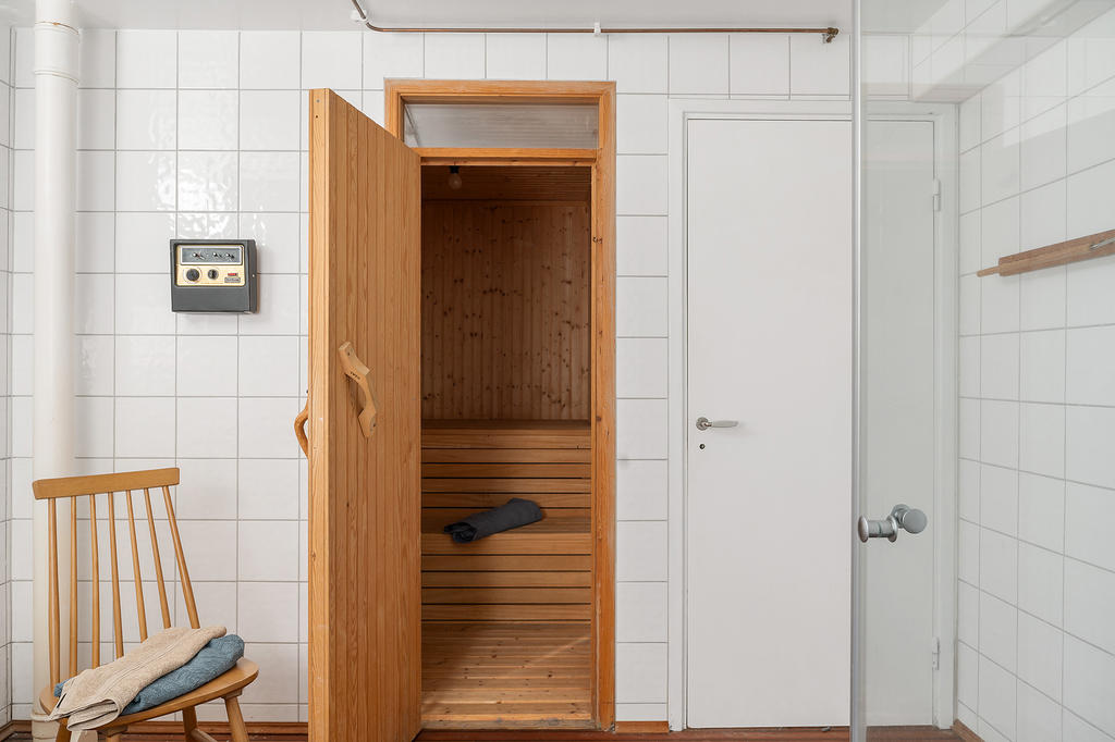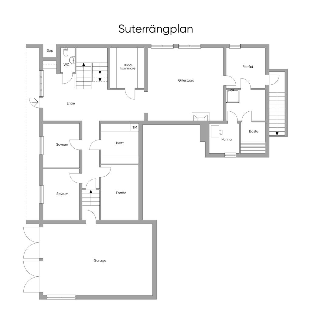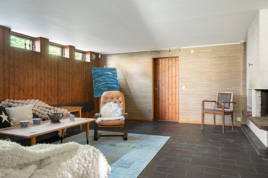 Intill hallen finns en gästwc. Rakt fram från hallen finns ett stort allrum med en vacker eldstad, perfekt för mysiga kvällar eller som ungdomarnas egna samlingsrum om det behovet finns. På suterrängplanet finns även två sovrum, en separat tvättstuga, två förråd varav det ena med fördel kan användas som gym då ett av husets tre badrum är beläget innanför detta rum. I badrummet (renoverat 2005) finns även en bastu, perfekt för trötta muskler efter en stunds träning.