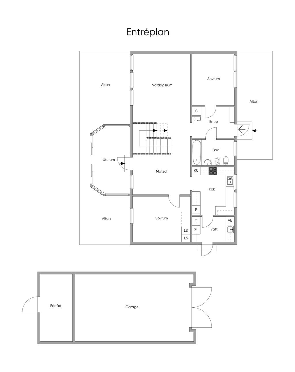 Vidare genom köket finner du groventré och tvättstuga inrett med klinkergolv och golvvärme. Här finner du tvättmaskin, torktumlare, vask och gott om förvaringsmöjligheter och arbetsytor. På entréplanet finns två sovrum varav ett ligger i anslutning till vardagsrummet och det andra sovrummet når du från entréhallen.