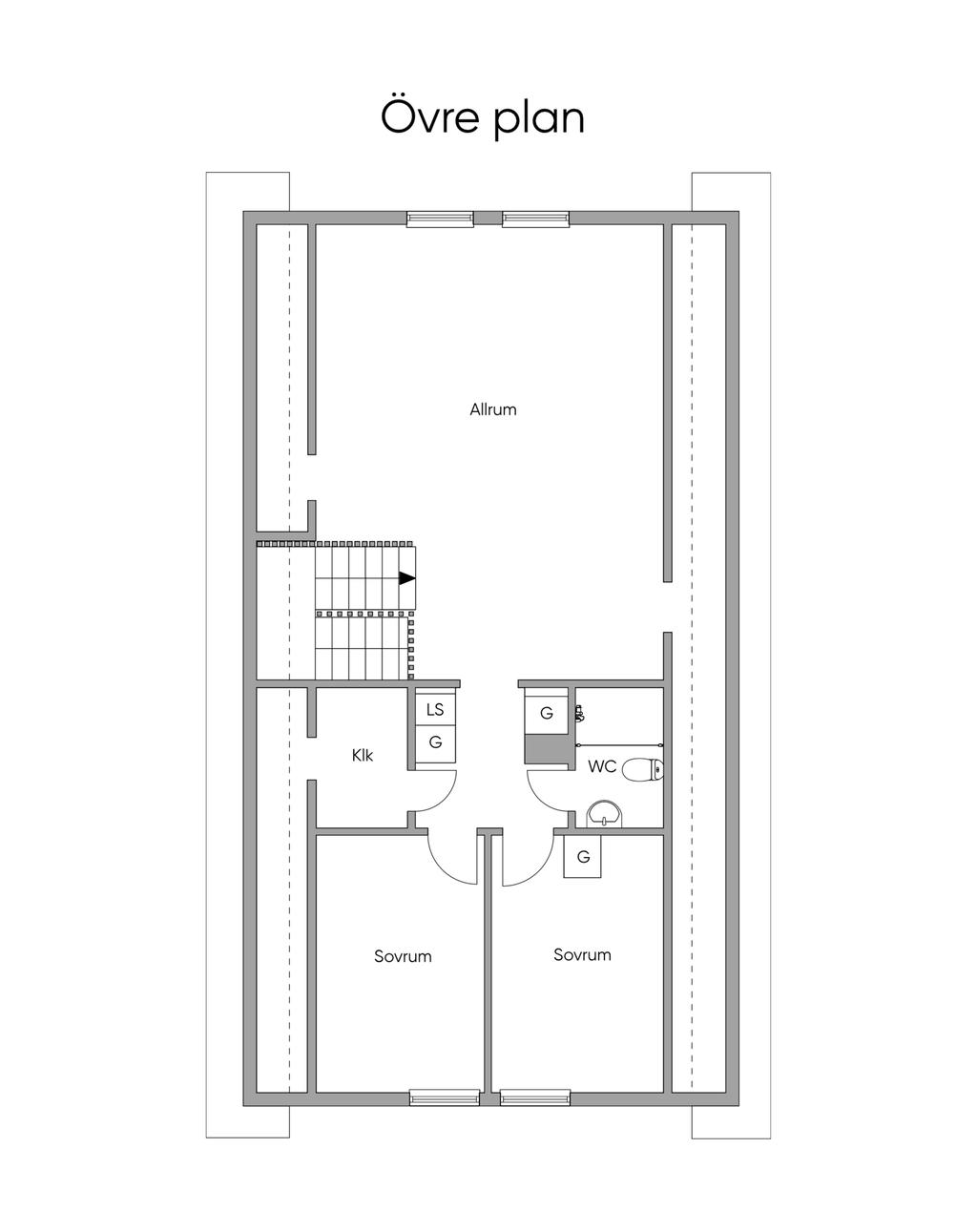 Övervåningen rymmer ytterligare två sovrum samt ett stort och luftigt allrum med generös takhöjd. Här finns goda möjligheter att skapa fler sovrum för den som har behov av det. Huset har två badrum, ett på varje plan, vilket ger extra komfort i vardagen.