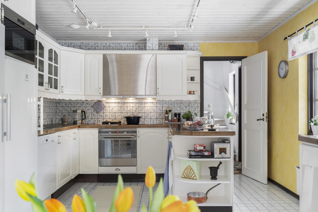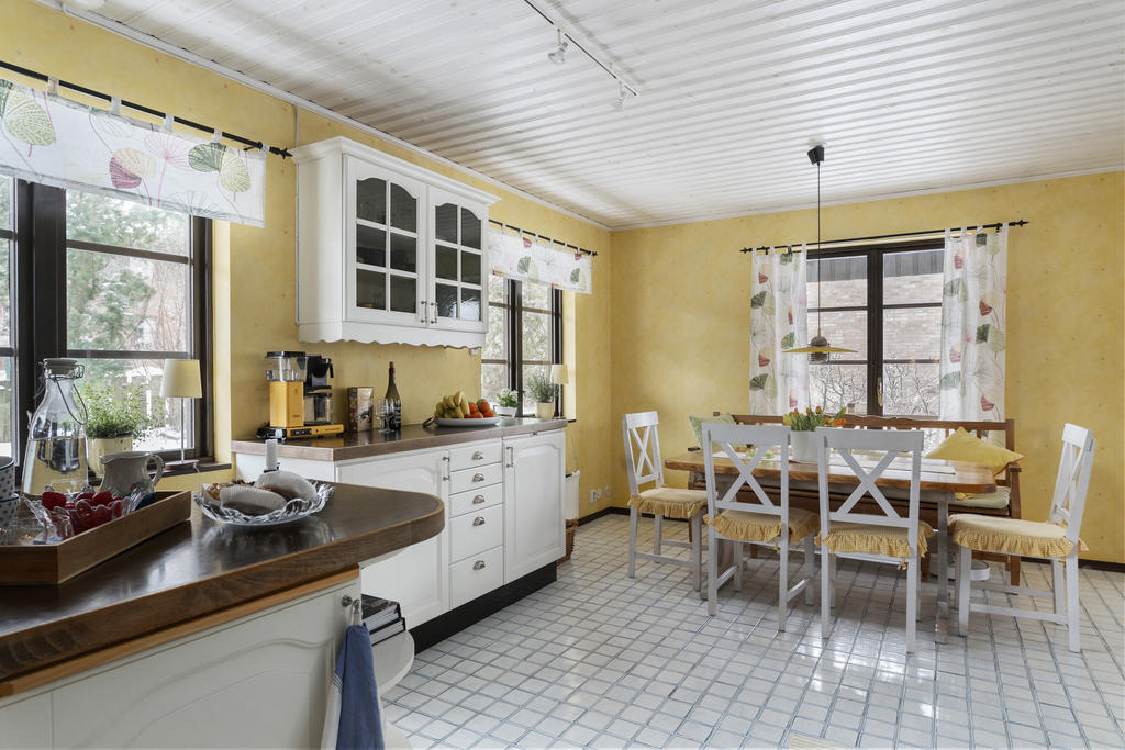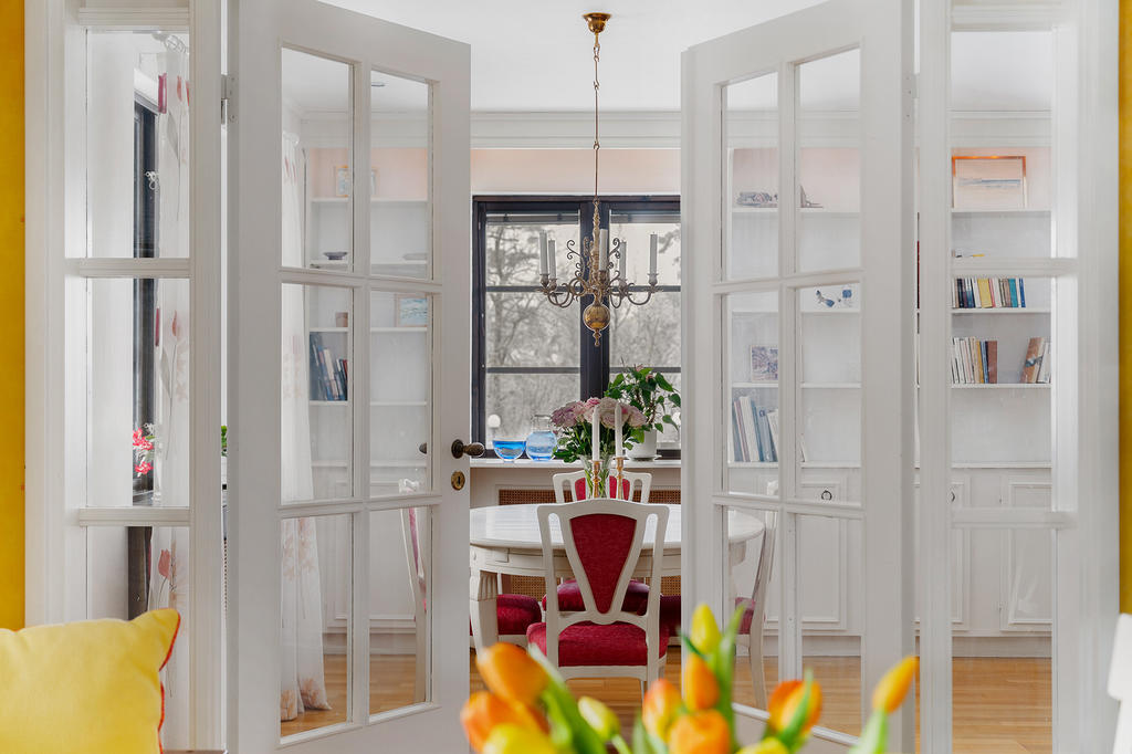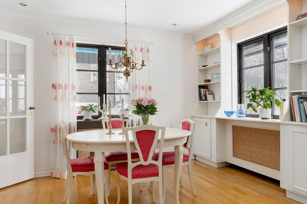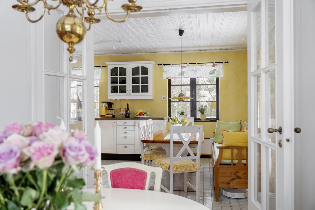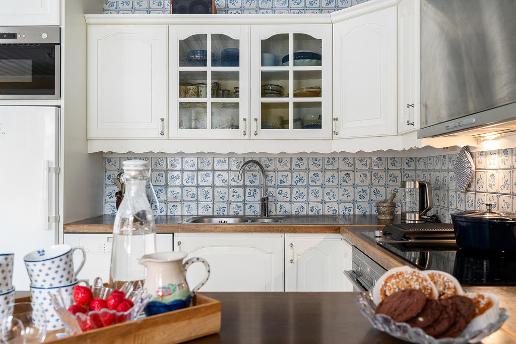 Intill vardagsrummet, avgränsat med vackra pardörrar i glas finner ni det stora hemtrevliga köket med sina generösa arbetsytor, franska detaljer och plats för både familj och vänner. Det klassiska köket har gott om skåp och bänkytor, platsbyggda hyllor och är utrustat med kyl och frys i fullhöjd, induktionshäll, elgrillplatta, mikro, fläkt och diskmaskin. I ena änden av köket finns en given matplats för ett större matbord. Från köket nås altanen på husets gavel och vidare ut i trädgården där ett eget äppelträd som ger mycket god frukt.