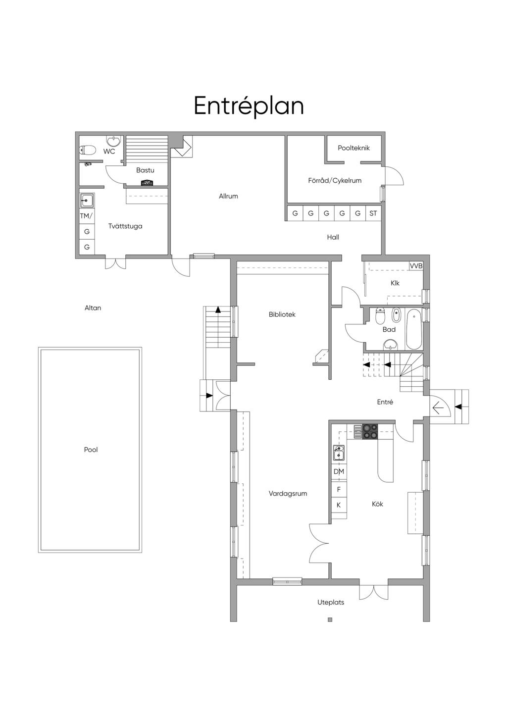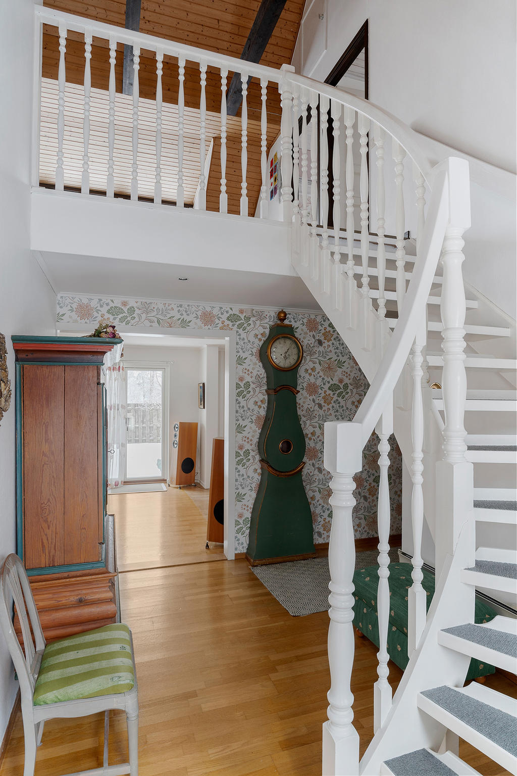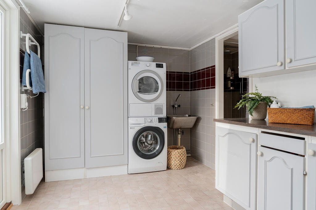 Invändigt möts ni av ljus, rymd och genomgående väl tilltagna ytor. Vardagsentrén vid uppfarten har ett praktiskt klinkergolv med värmeslingor, flera garderober och en praktisk klädkammare bakom skjutdörrar med spegelglas, här finns plats för familjens alla ytterkläder och skor oavsett säsong. I denna del av huset finns ett trivsamt allrum som stoltserar med en vacker braskamin som ger både behaglig värme och stor mysfaktor. Från rummet blickar ni ut över poolområdet och de grönskande omgivningarna. Intill allrummet finns en stor tvättstuga med tvättmaskin, torktumlare, vask och gott om förvaringsmöjligheter och arbetsytor. Dessutom finns bra med plats att hänga tvätten på tork utan att den är i vägen för vardagslivet. I anslutning till tvättstugan finns en dusch, en separat wc samt en fin bastu. Perfekt är att man genom pardörrarna i tvättstugan kommer rakt ut till altanen och poolen, så dusch, wc och bastun är lättillgänglig.