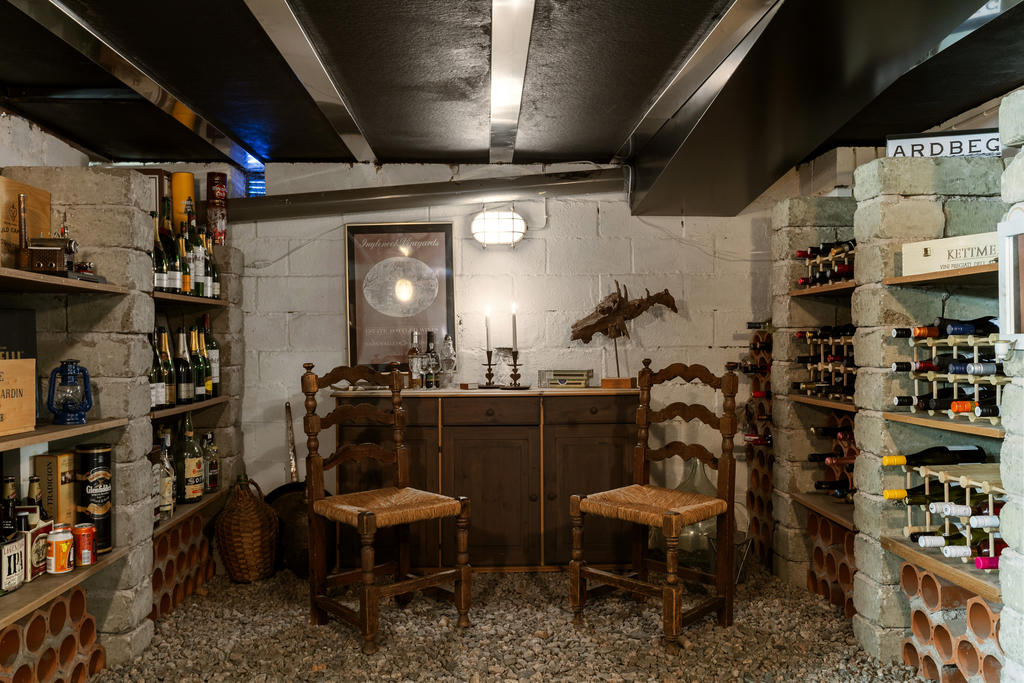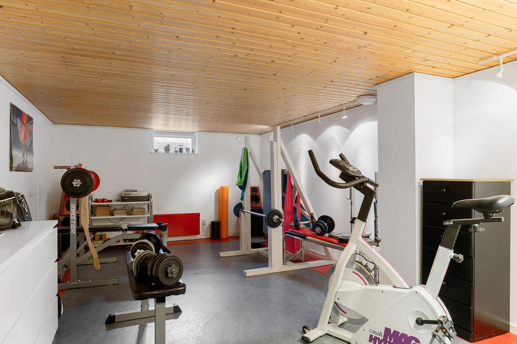 Källarvåningen som nås från trappan vid altanen erbjuder goda förvaringsytor, snickerirum, hemmagym och en riktigt charmig och stämningsfull vinkällare. Här finns också två bra förrådsrum.