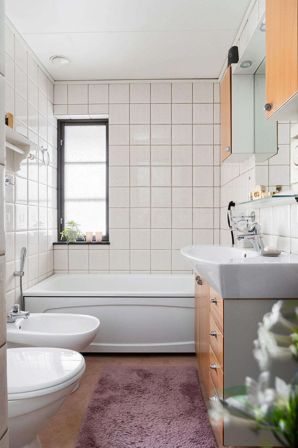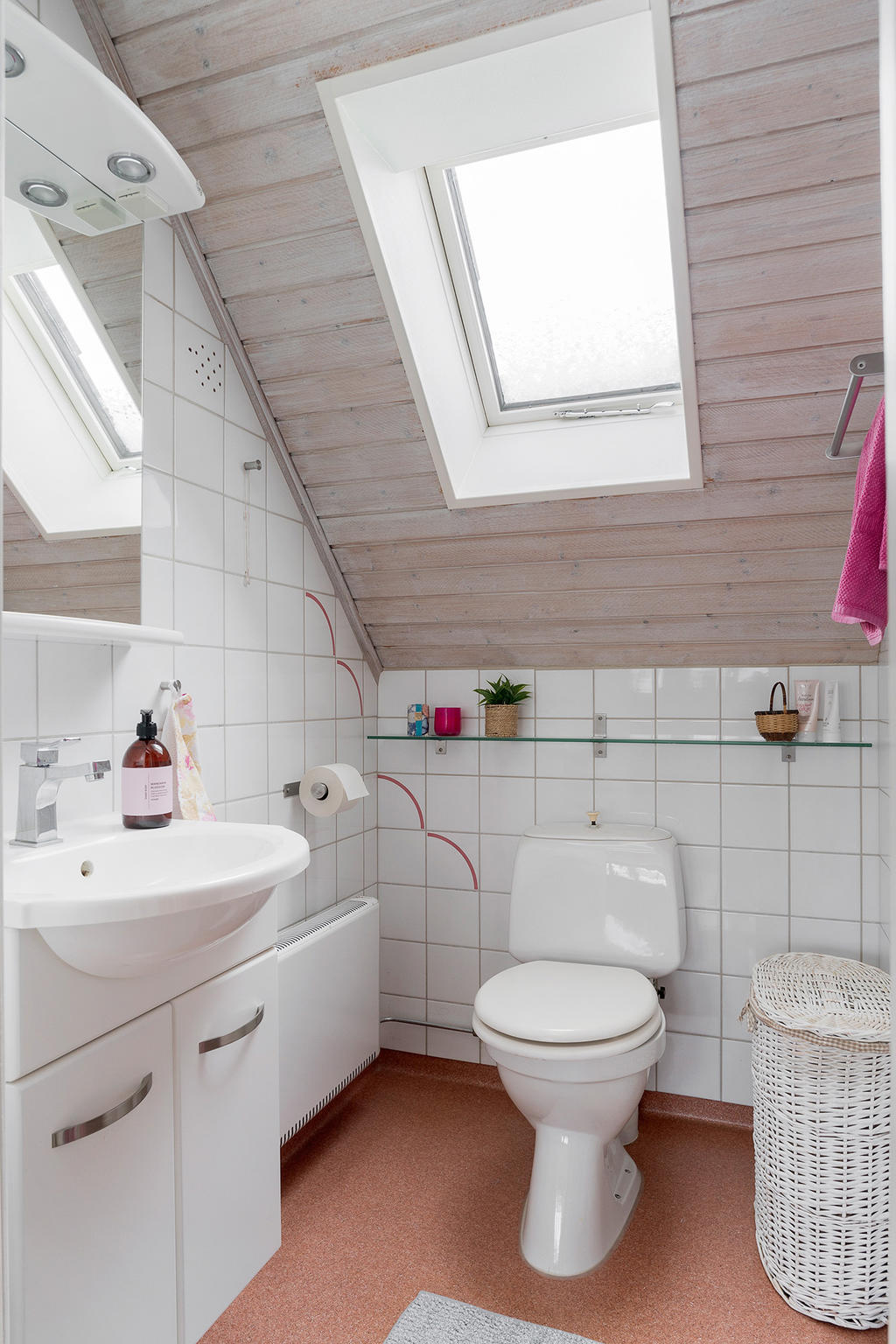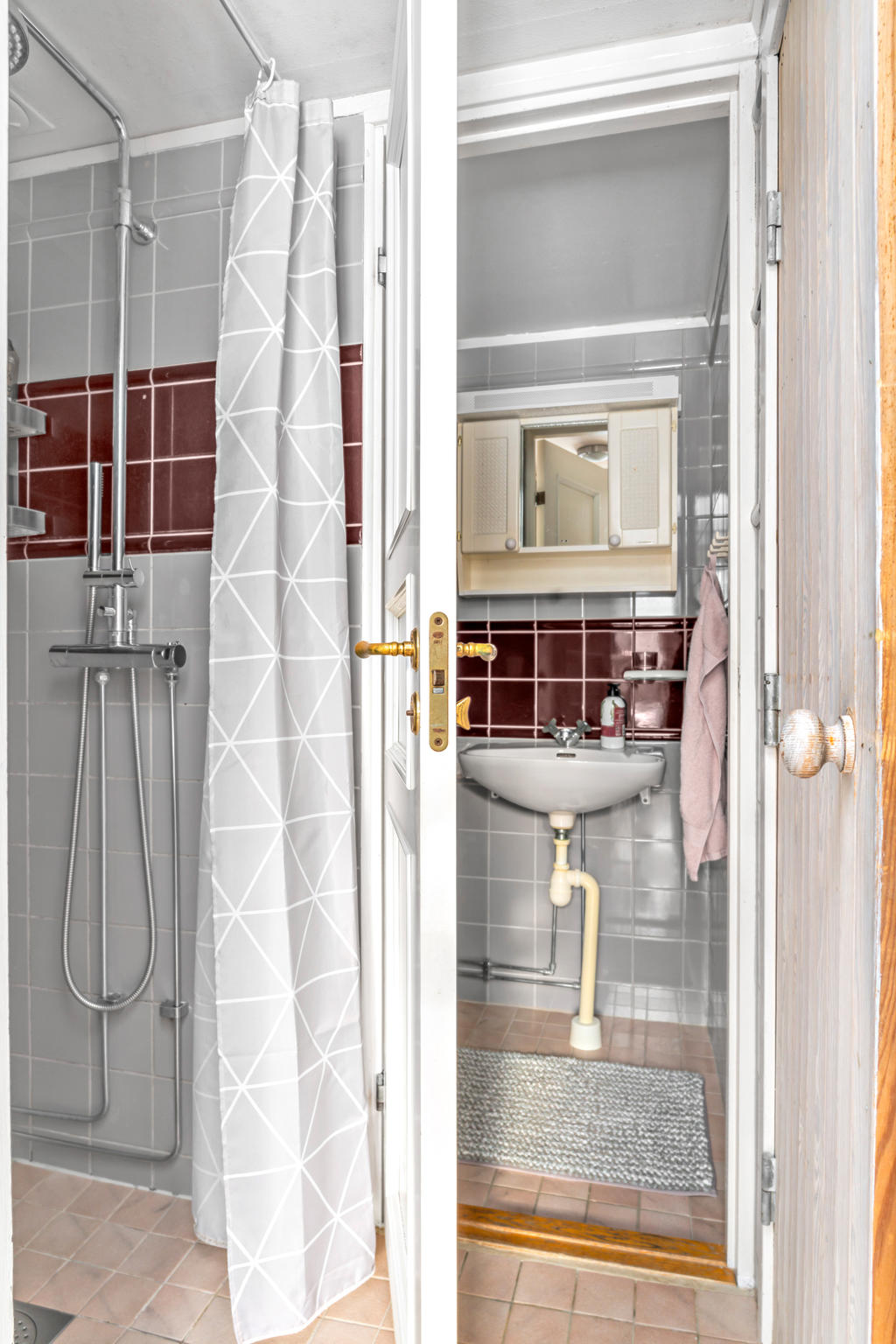 I huset finns två badrum, ett på vardera våningsplan samt den extra dusch och wc som nämnts i anslutning till tvättstugan tidigare. Badrummet på övervåningen har en duschhörna och badrummet på entréplan har badkar.